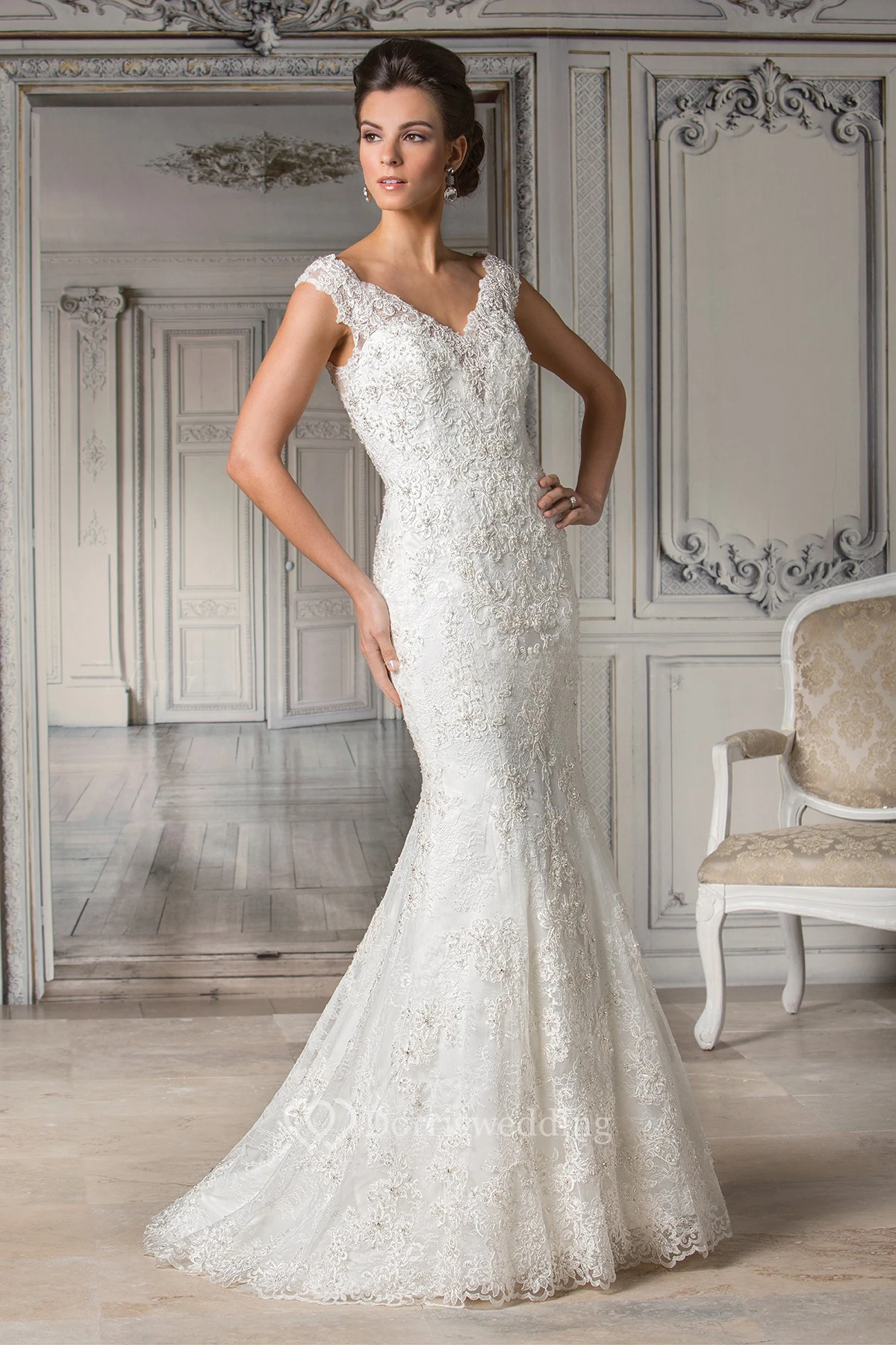 Cap-Sleeved V-Neck Mermaid Gown With Allover Appliques