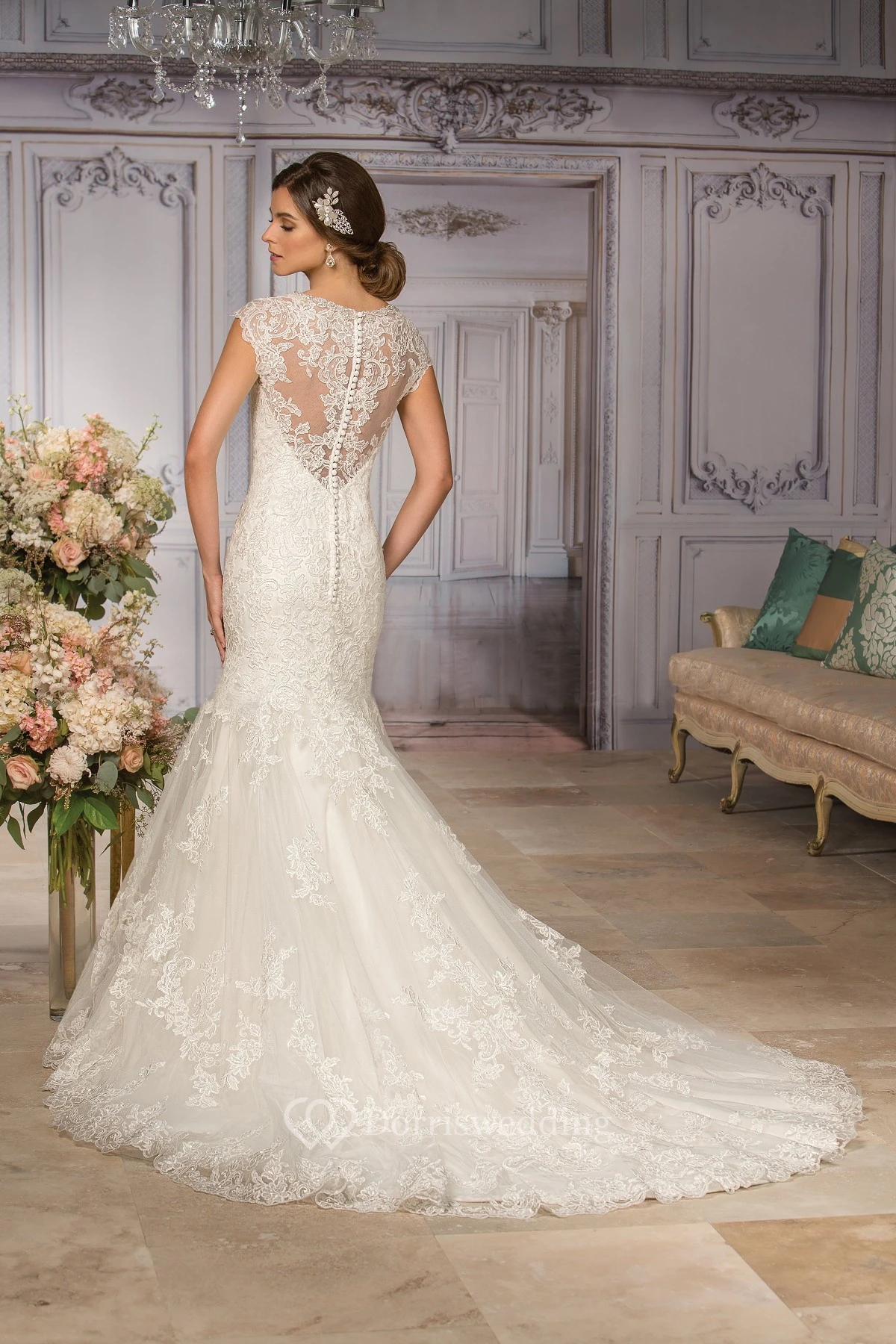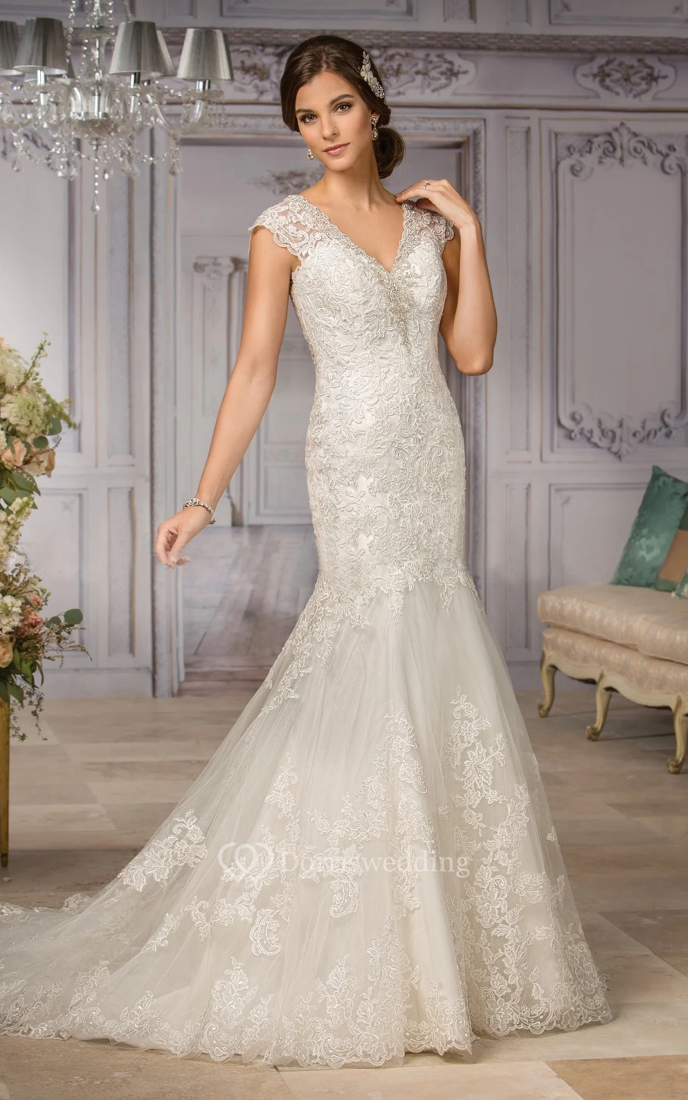 Cap-Sleeved V-Neck Mermaid Gown With Appliques And Illusion Back
