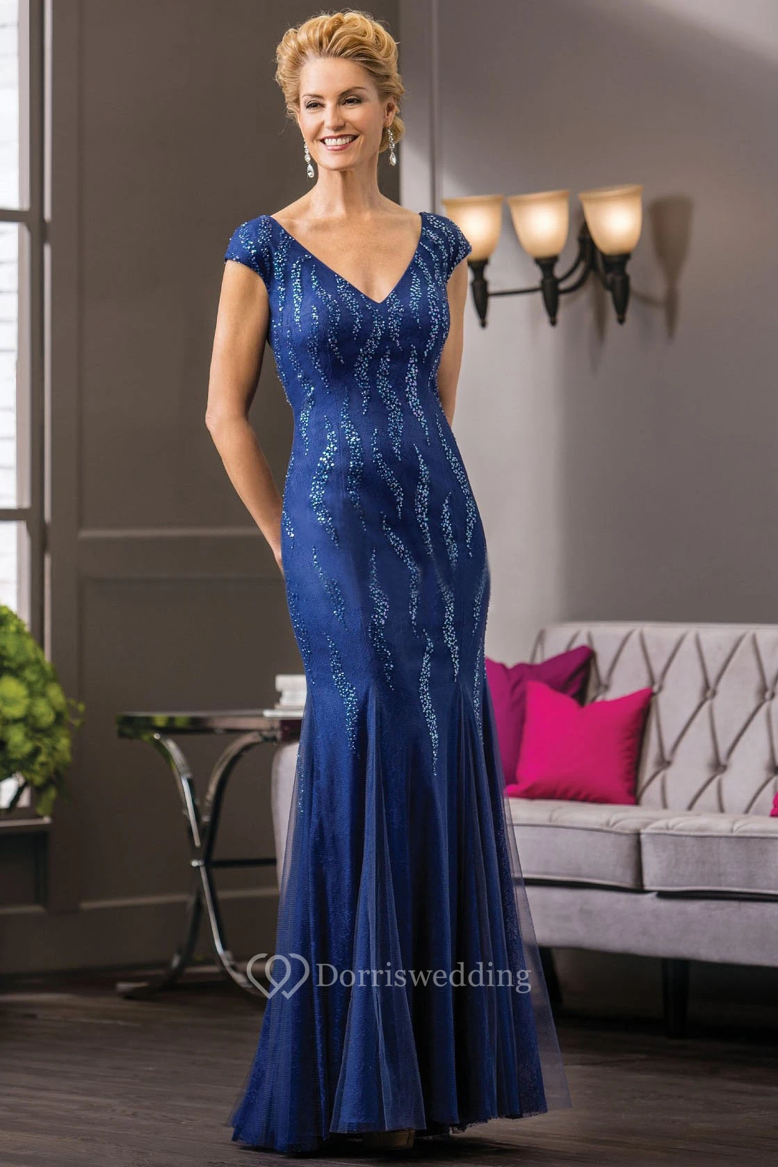 Cap-Sleeved V-Neck Mermaid Mother Of The Bride Dress With Sequins And V-Back