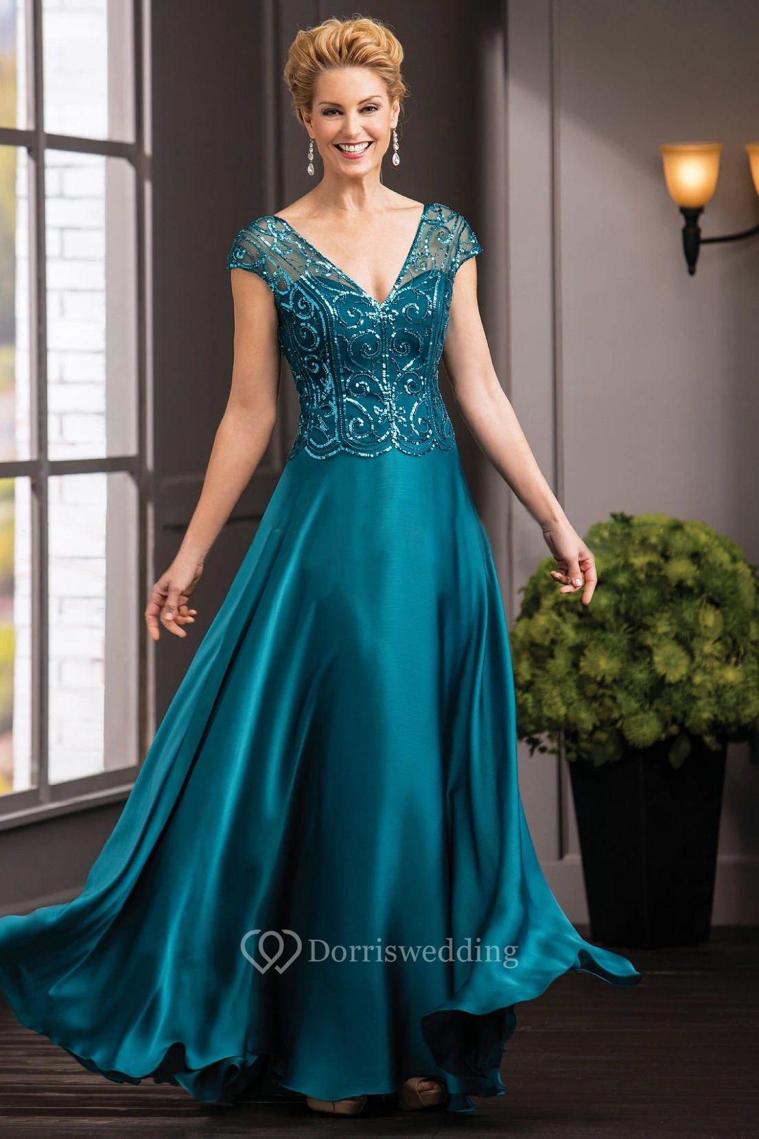 Cap-Sleeved V-Neck Mother Of The Bride Dress With Sequins And V-Back