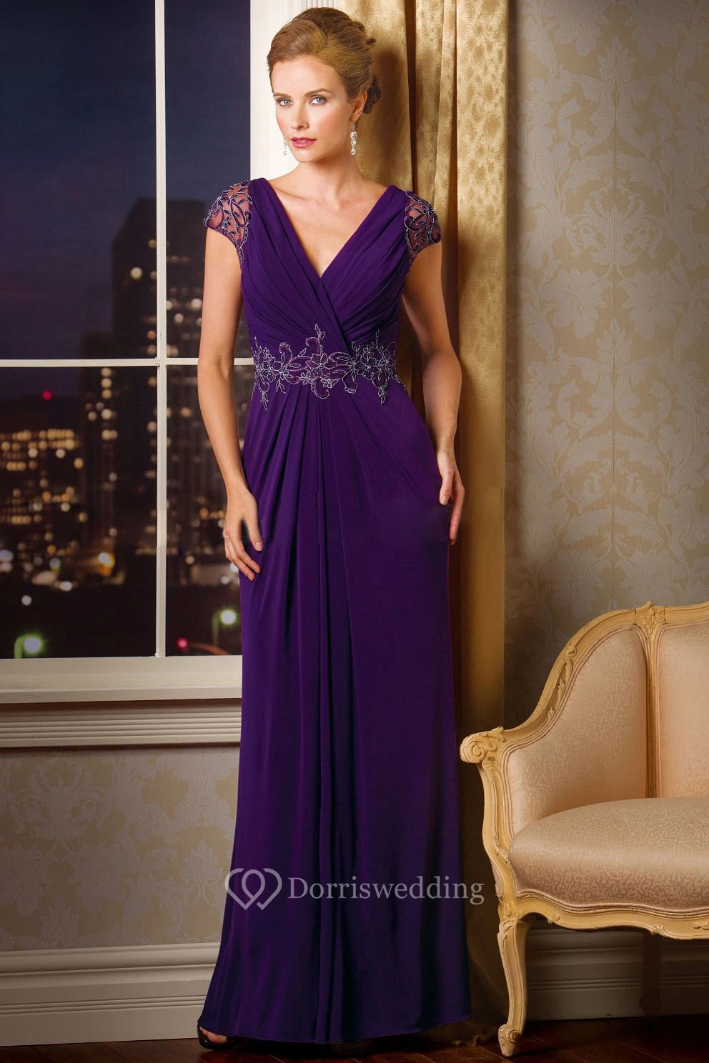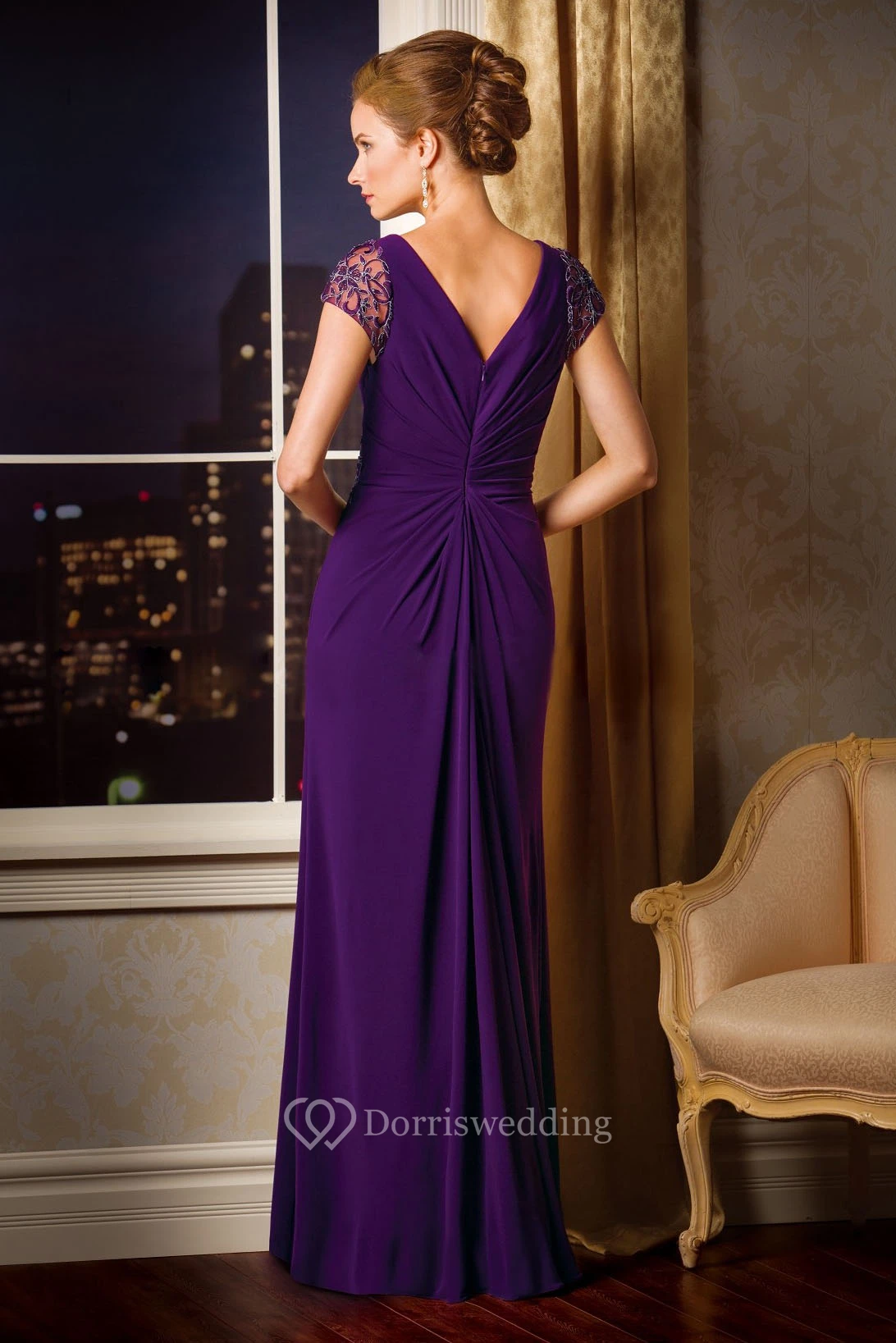 Cap-Sleeved V-Neck Mother Of The Bride Dress With V-Back And Crystals