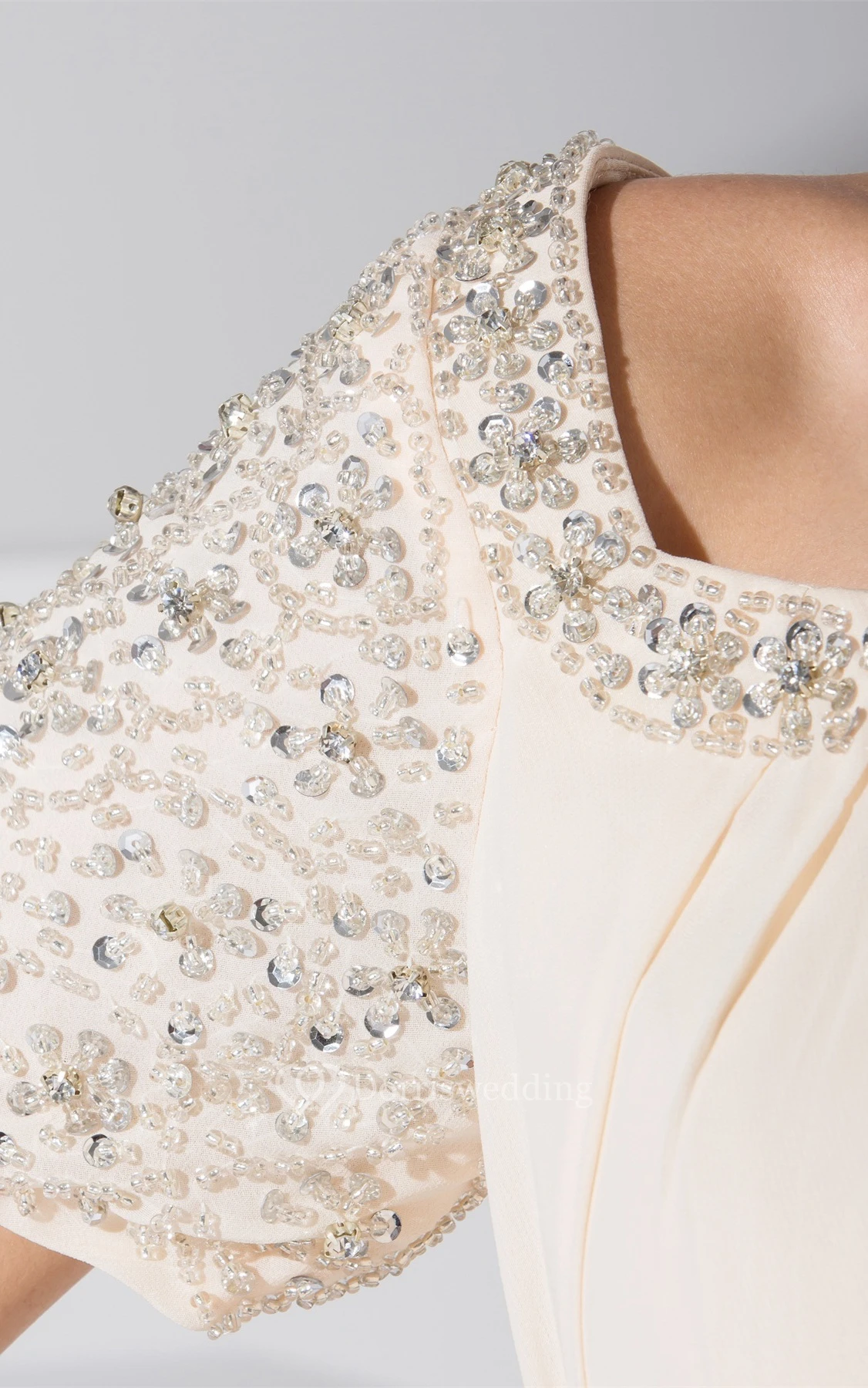 Caped-Sleeve Chiffon Long Ruched Halter and Dress With Beading