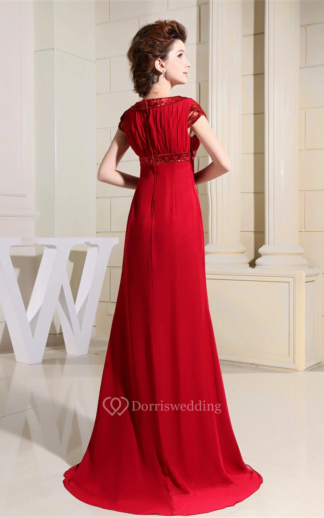 Caped-Sleeve Chiffon Sheath Appliqued Dress With Rhinestone