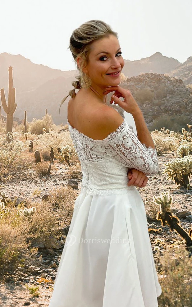 Casual A Line Lace 3/4 Length Sleeve Illusion Wedding Dress with Ruching