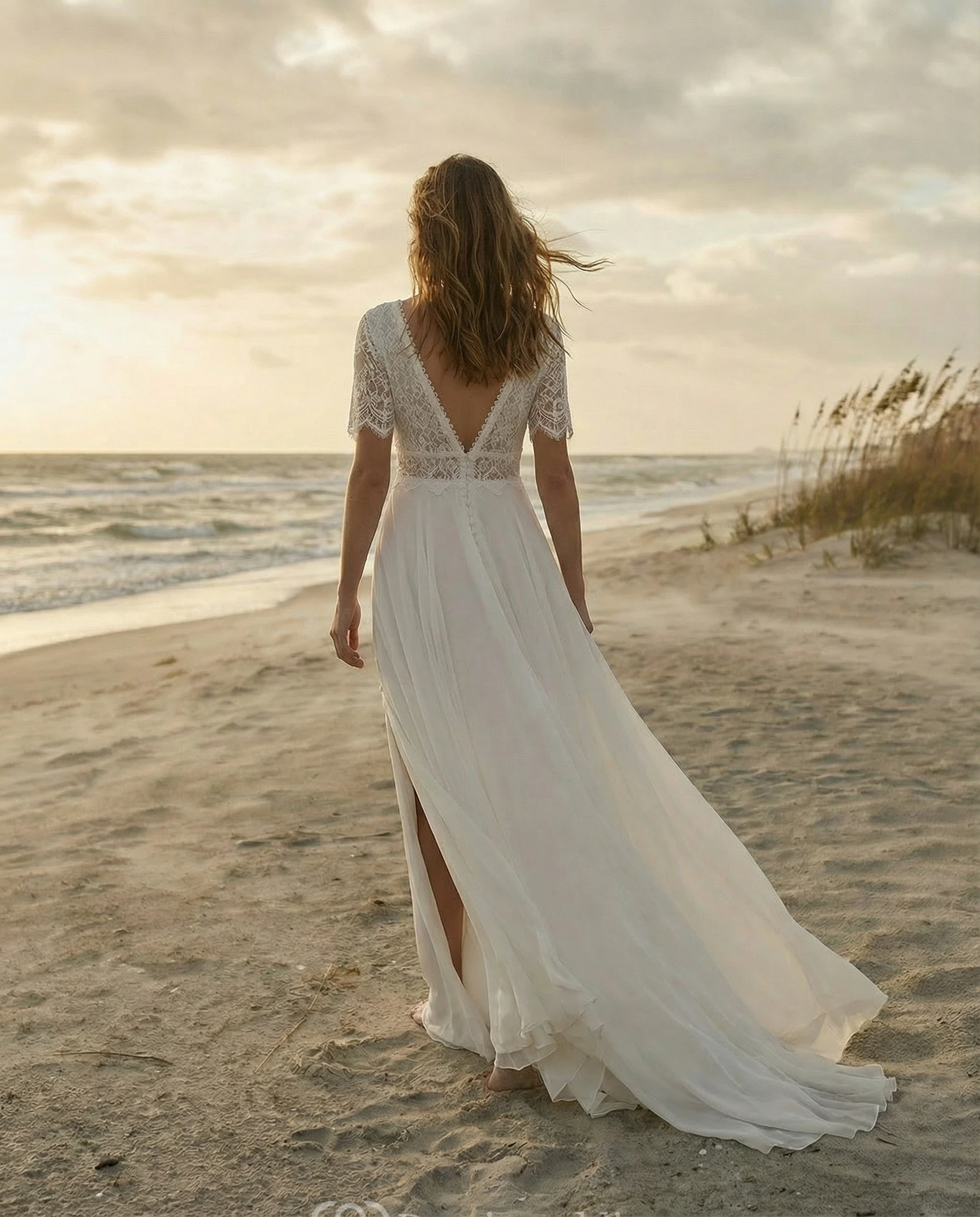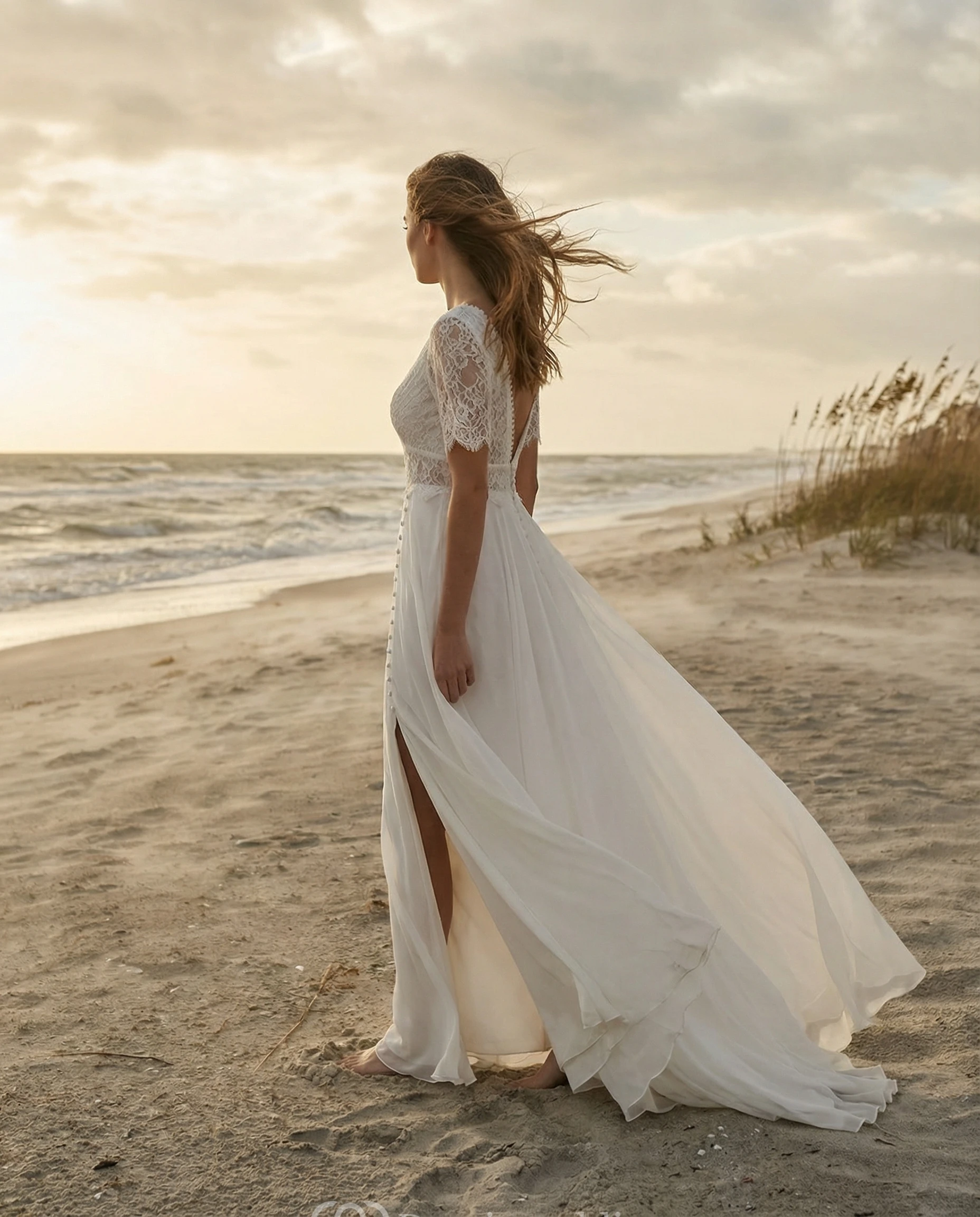 I absolutely loved wearing this dress. The short sleeves are so pretty and the chiffon is very flattering. The boho silhouette moves beautifully. I felt so special and beautiful on my wedding day. It’s a great choice for any bride who wants a casual and feminine look. The quality of both the lace and chiffon is excellent.