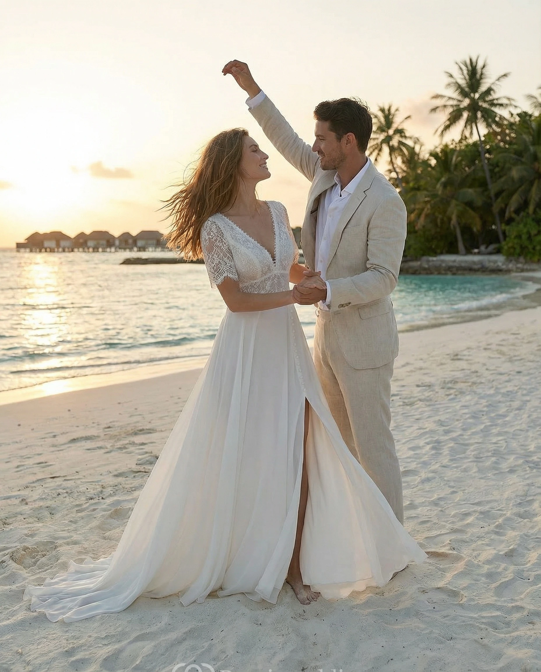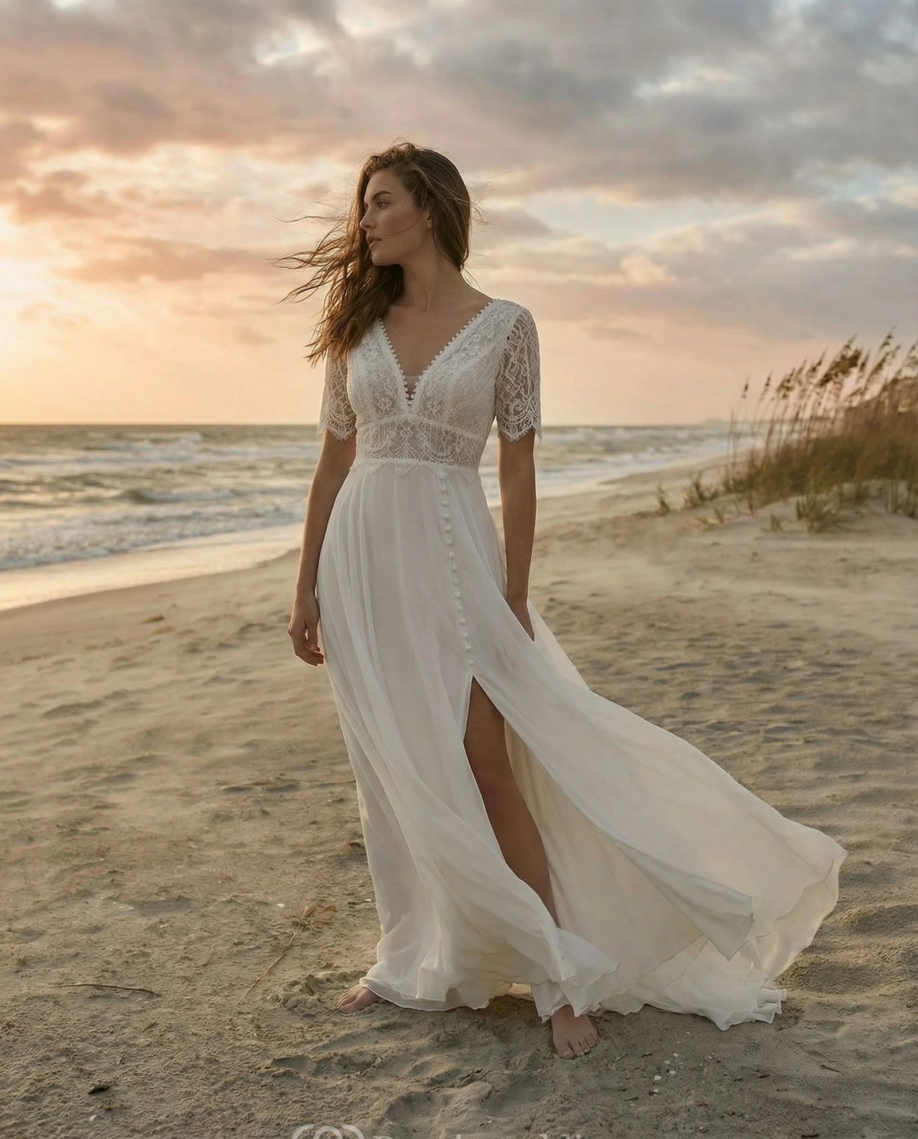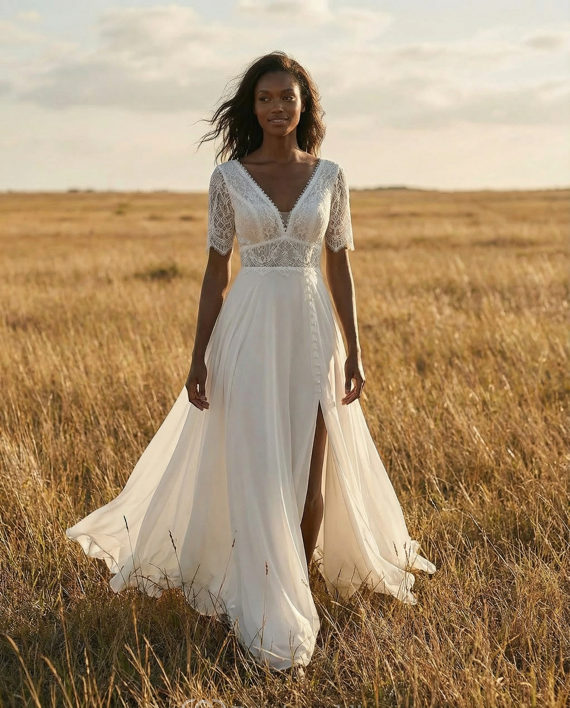 I was looking for a casual boho dress with button detail, and this one was perfect. The V-neck is very flattering and the chiffon fabric is so pretty. I felt so feminine and beautiful. The high slit moves beautifully and was perfect for our garden ceremony. It’s a high-quality gown that I felt very special in.