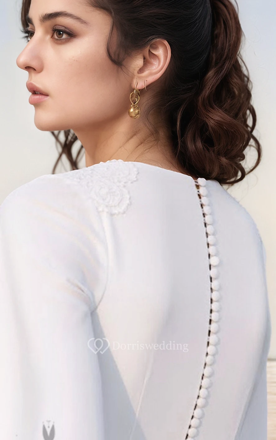 This timeless high-neck wedding dress is a true classic. Featuring lace sleeves and a sleek silhouette, it creates an air of sophistication and grace. The long sleeves add a touch of modesty, while the flowing skirt gives the dress a soft, romantic look.