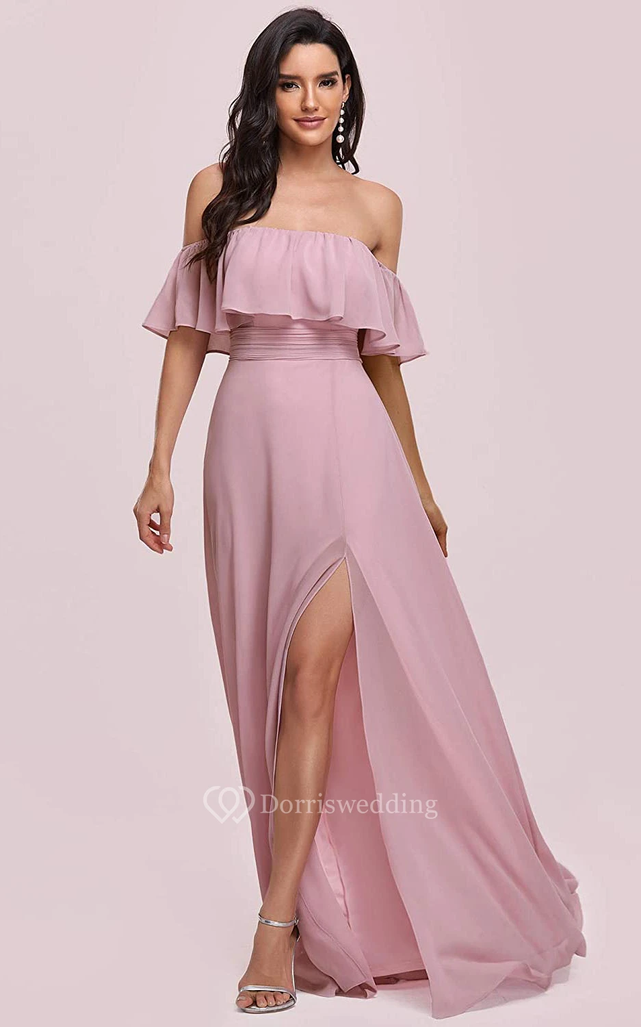 Casual Chiffon Off-the-shoulder A Line Guest Dress With Ruffles and Split Front