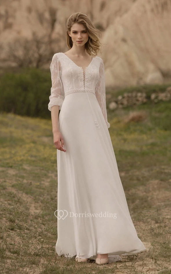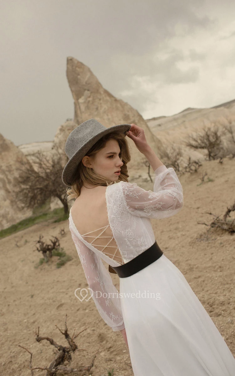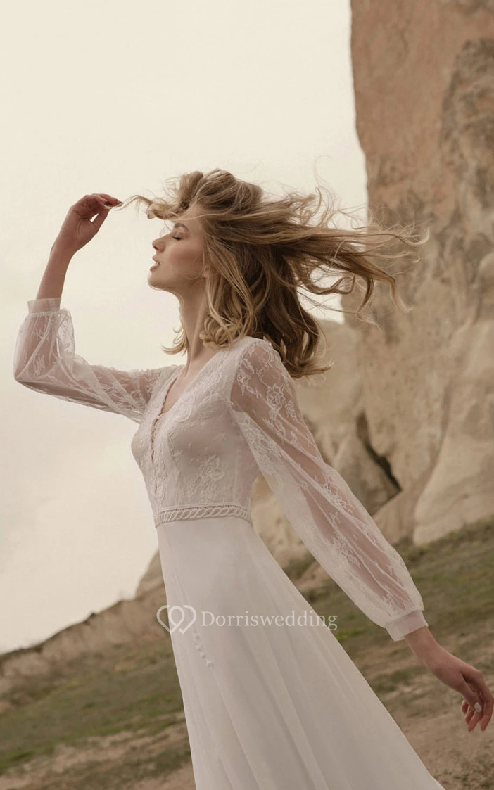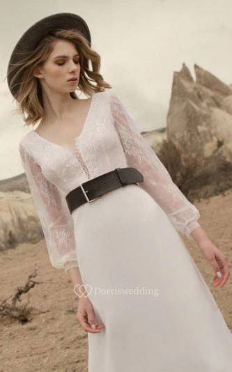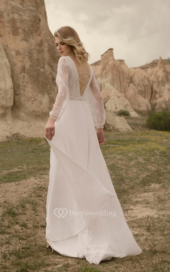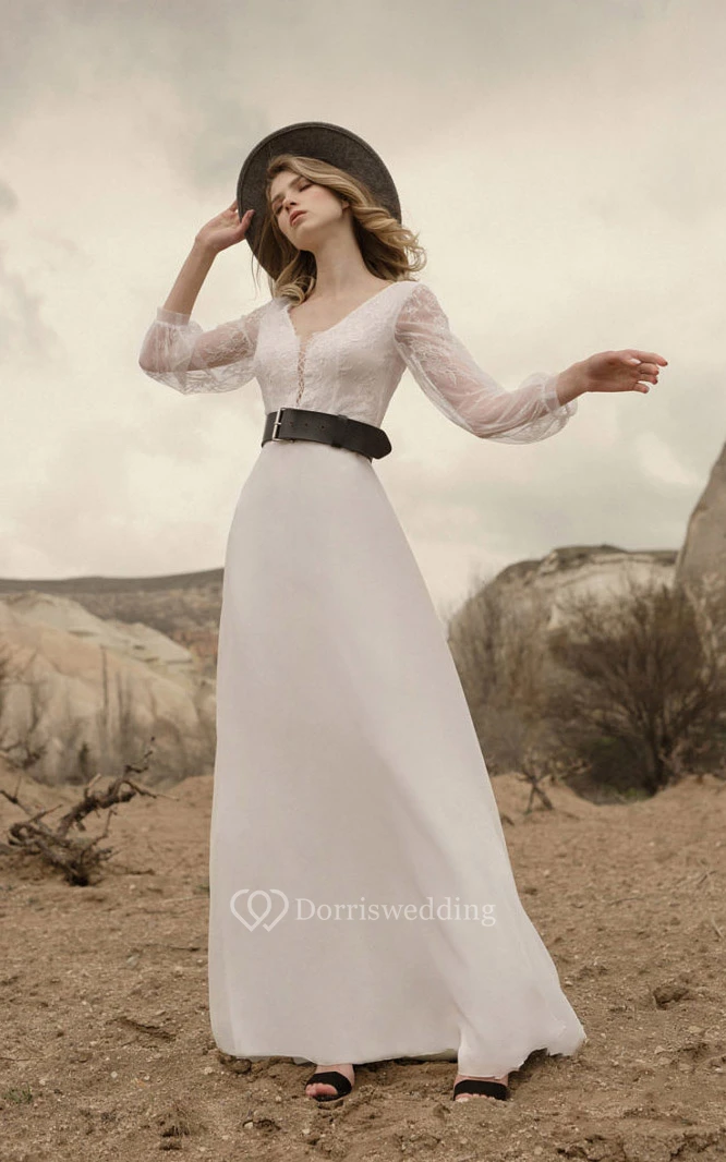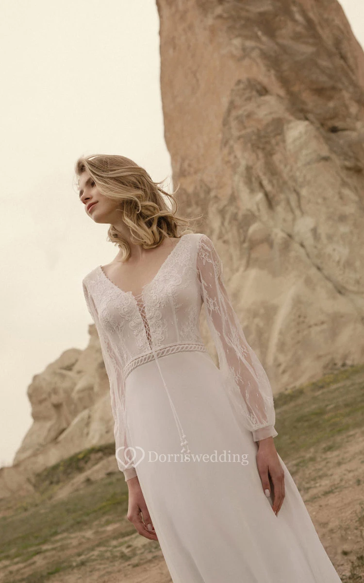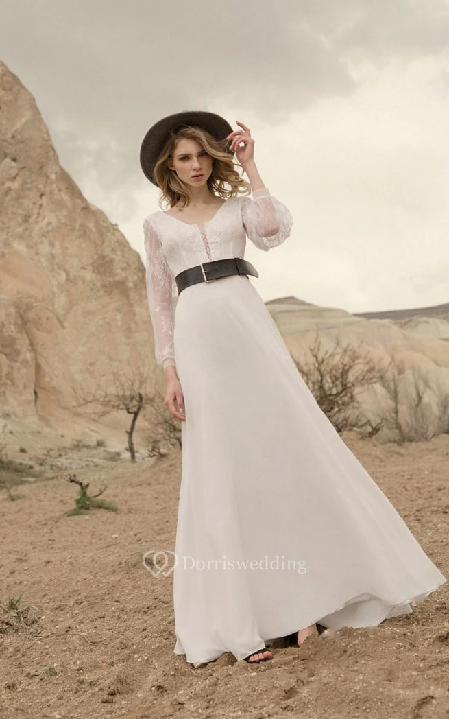 Casual Long Sleeve V-neck Chiffon Country Floor-length Lace up Wedding Dress