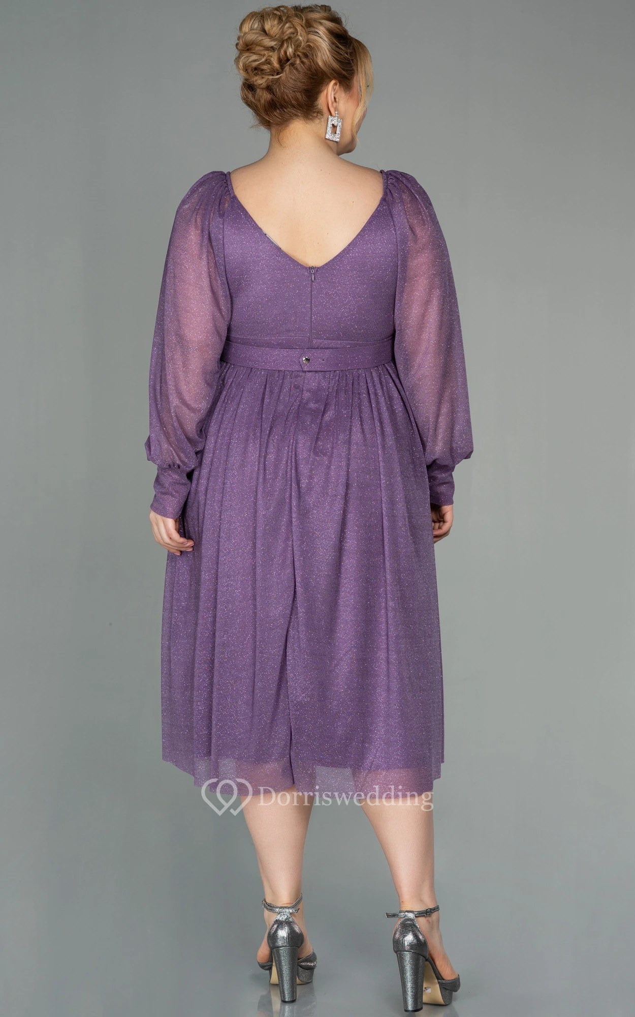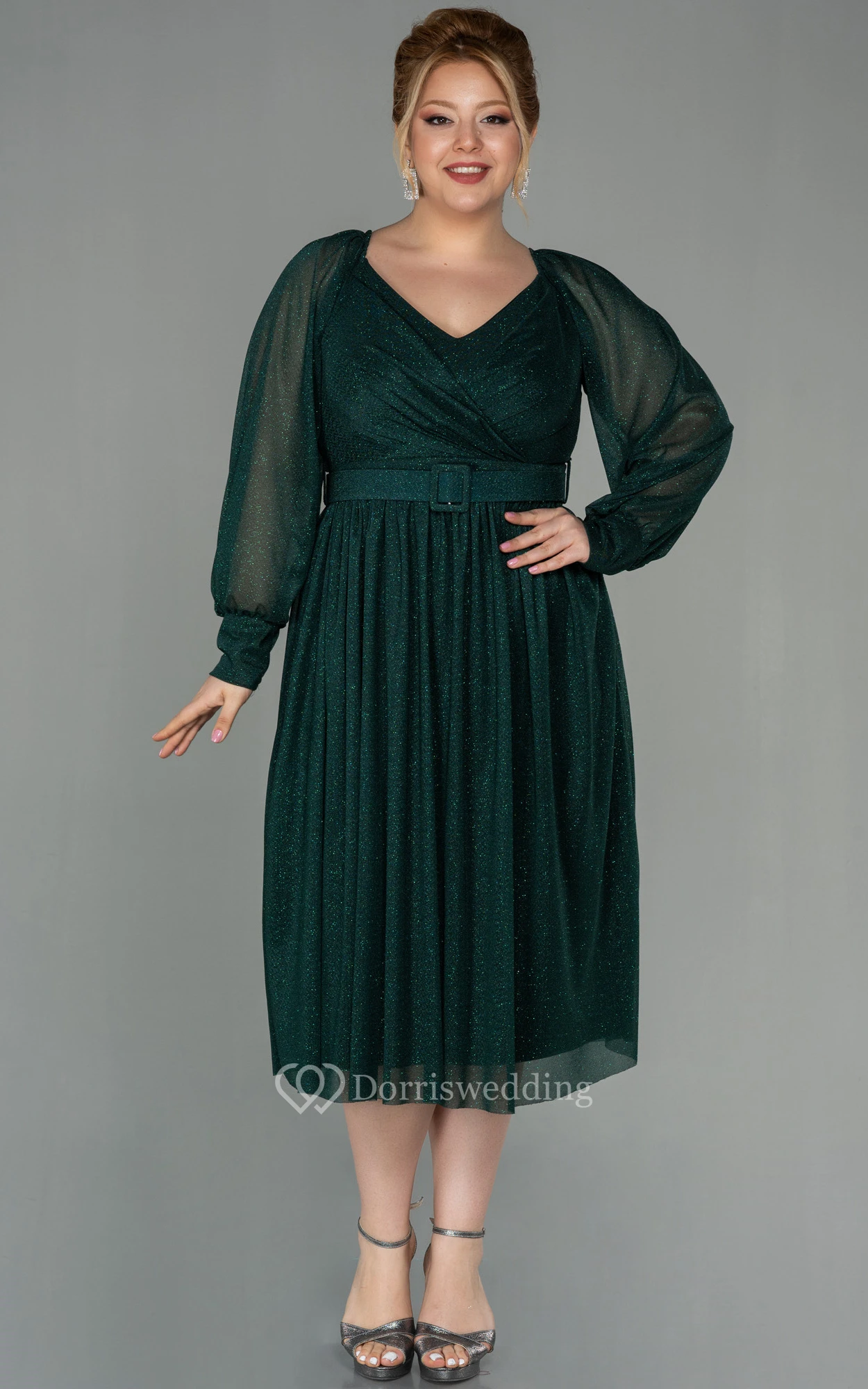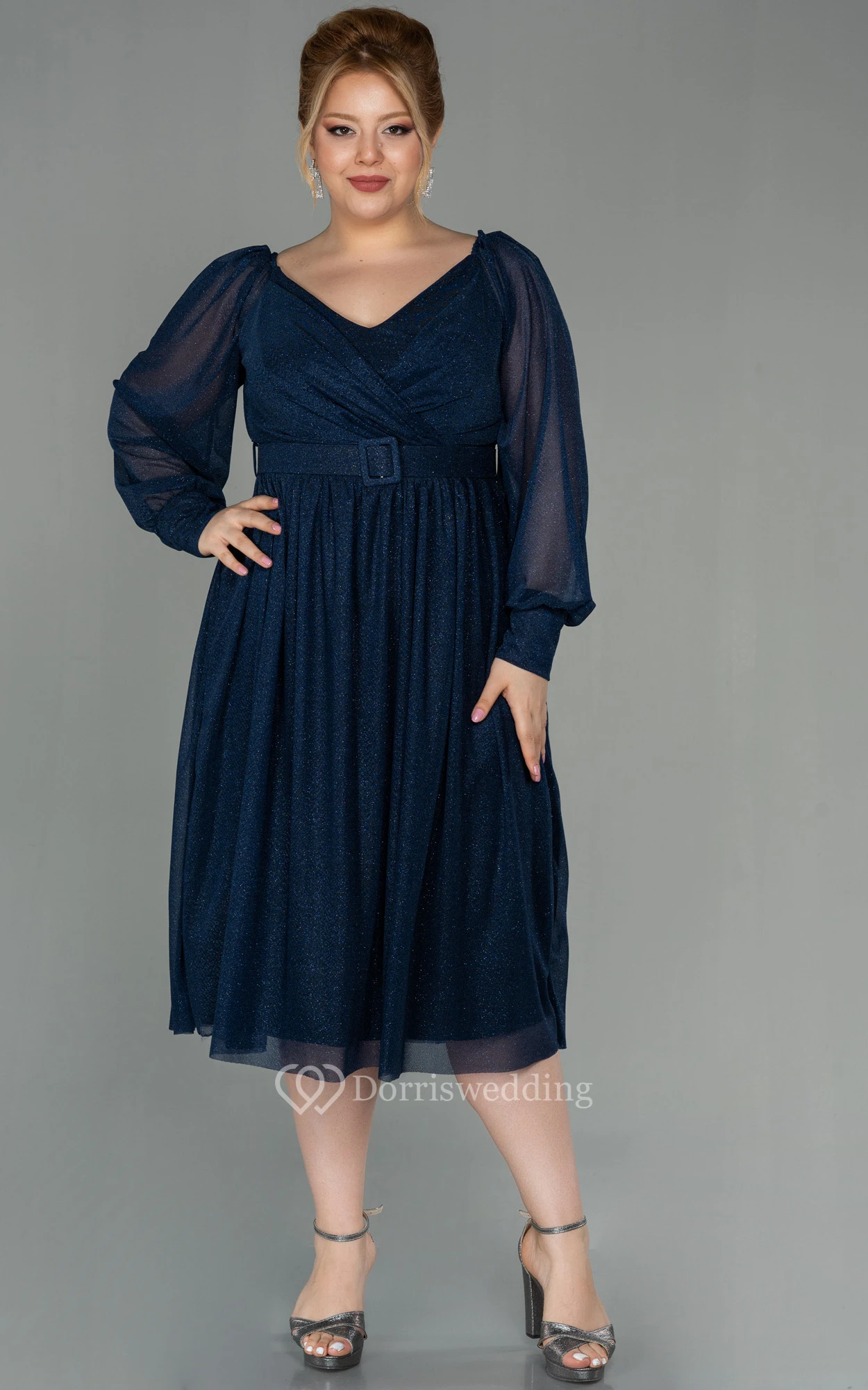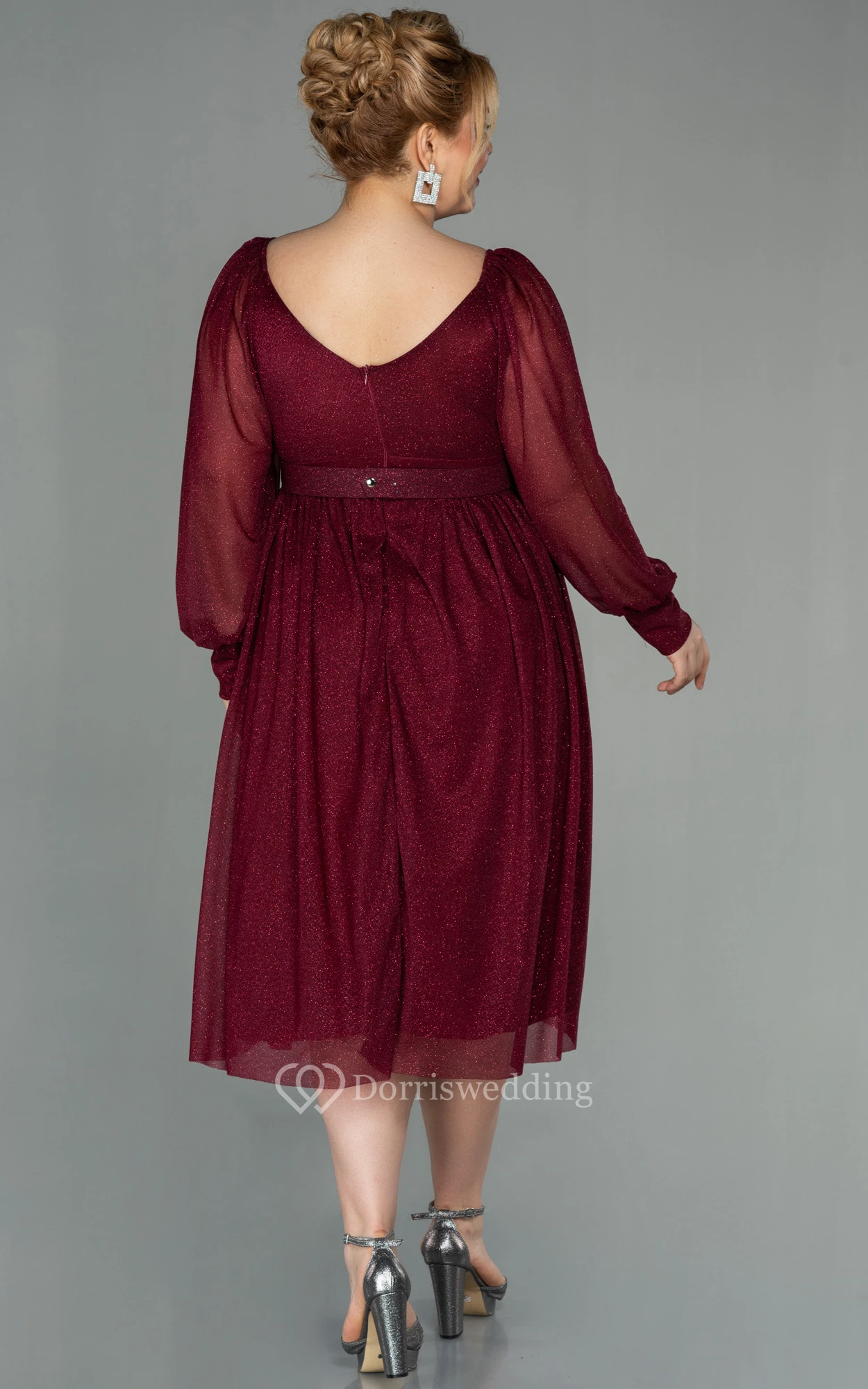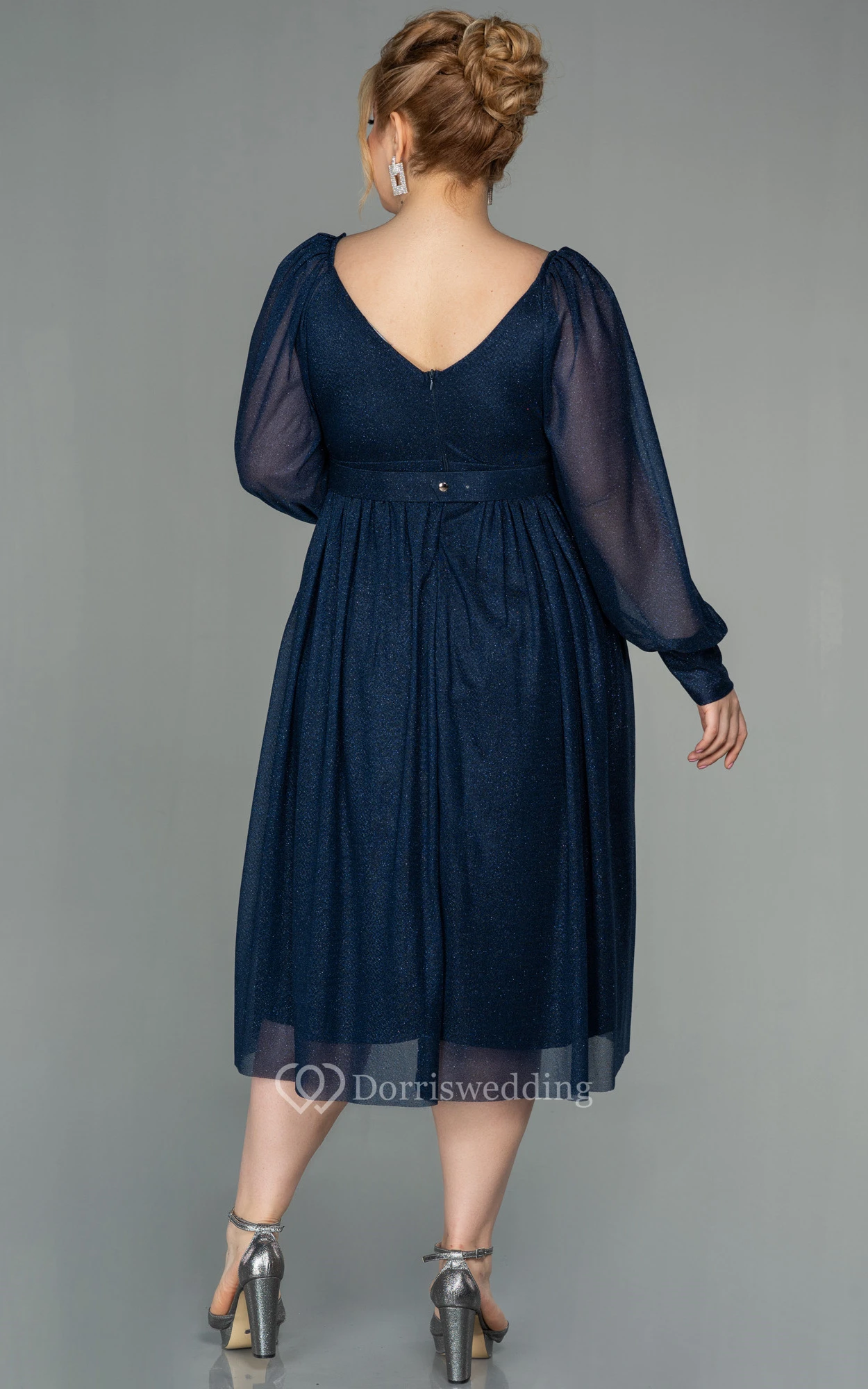 Casual Long Sleeve V-neck Criss-cross Empire Tea-length Plus Size Mother of Bride Dress