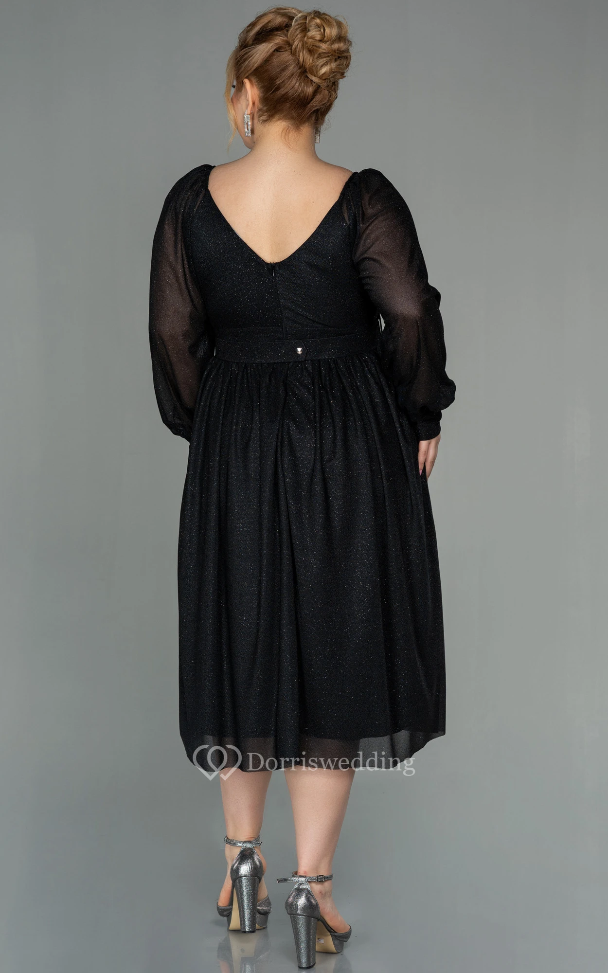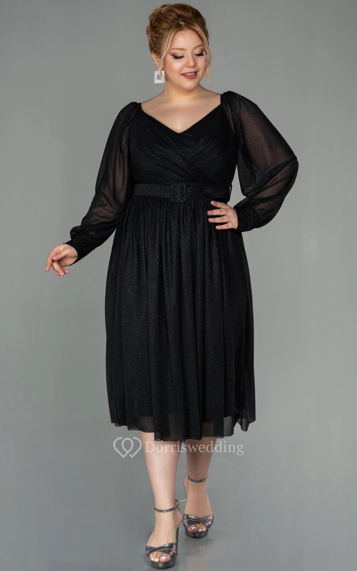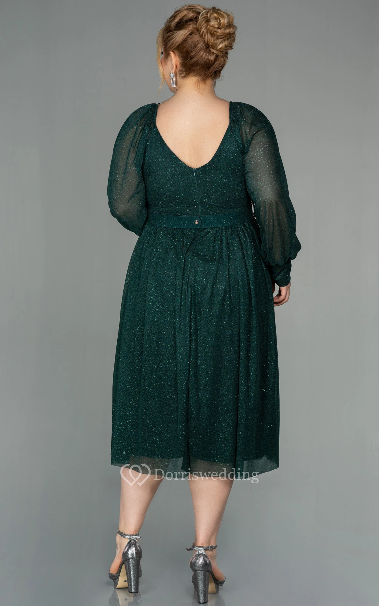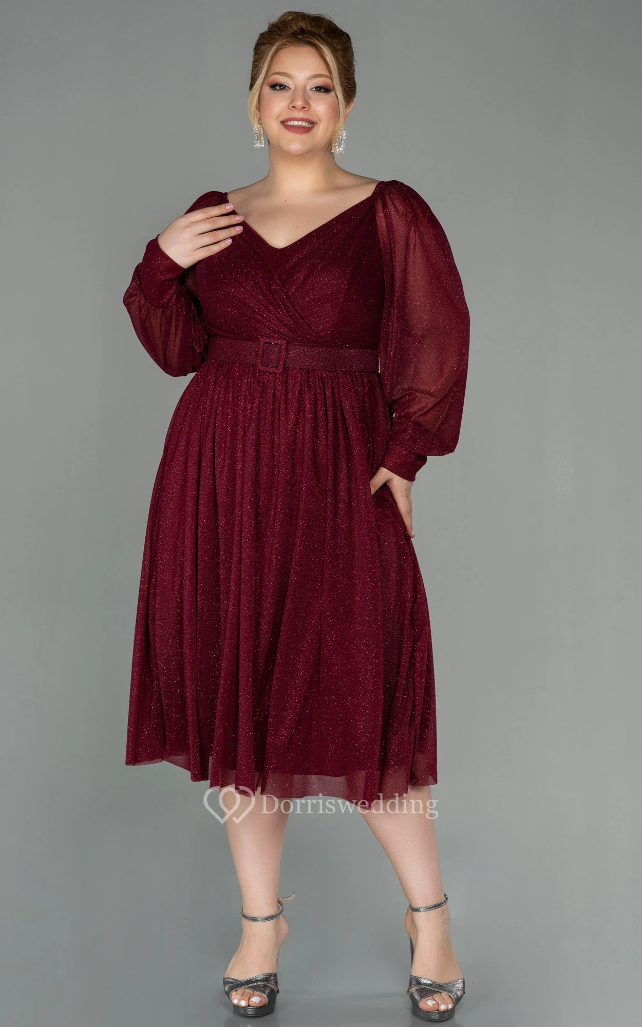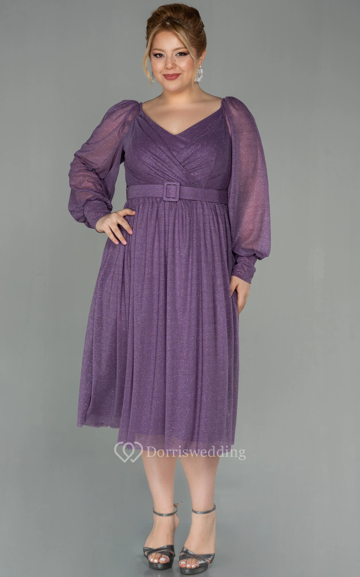 Casual Long Sleeve V-neck Criss-cross Empire Tea-length Plus Size Mother of Bride Dress