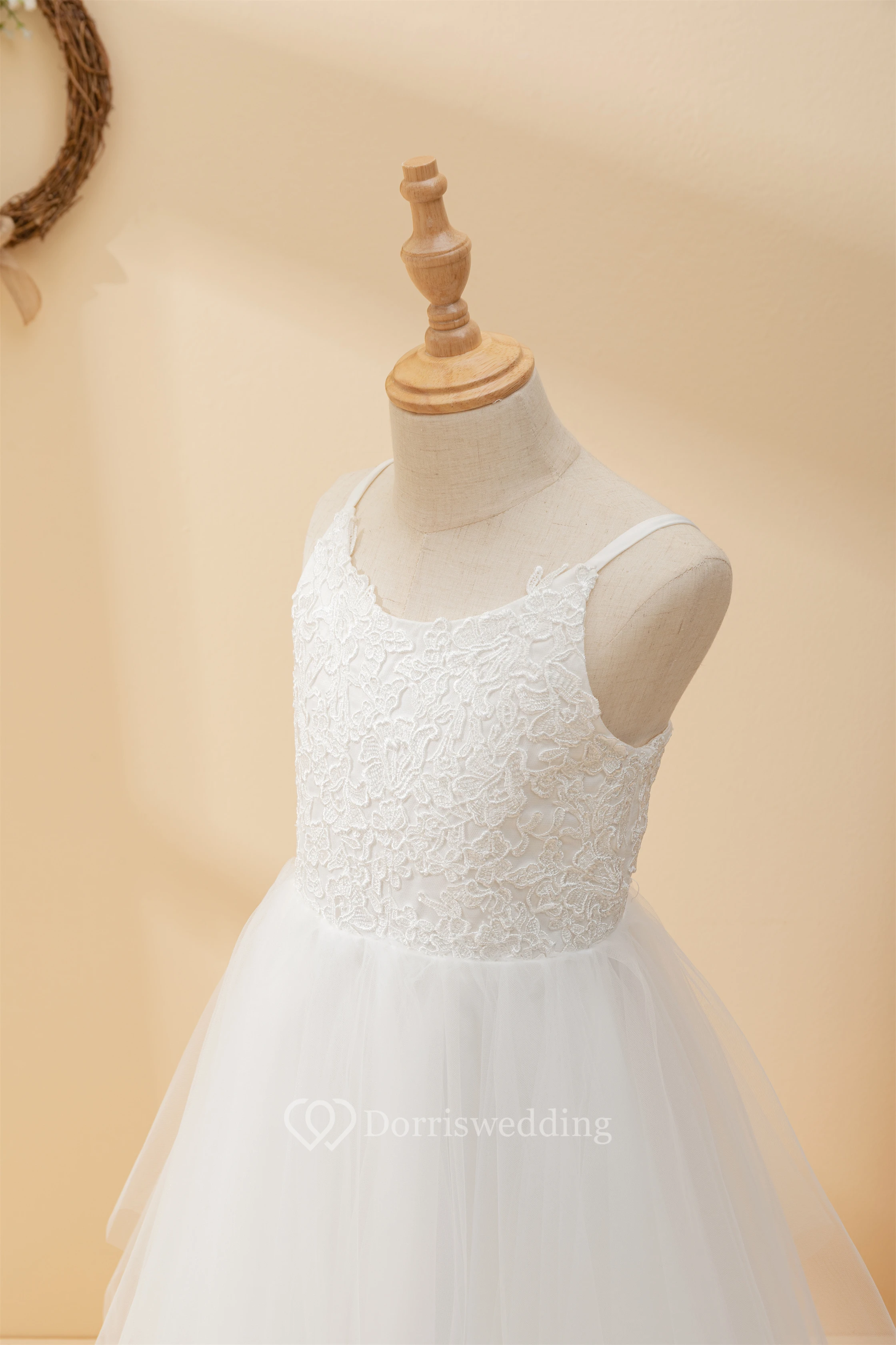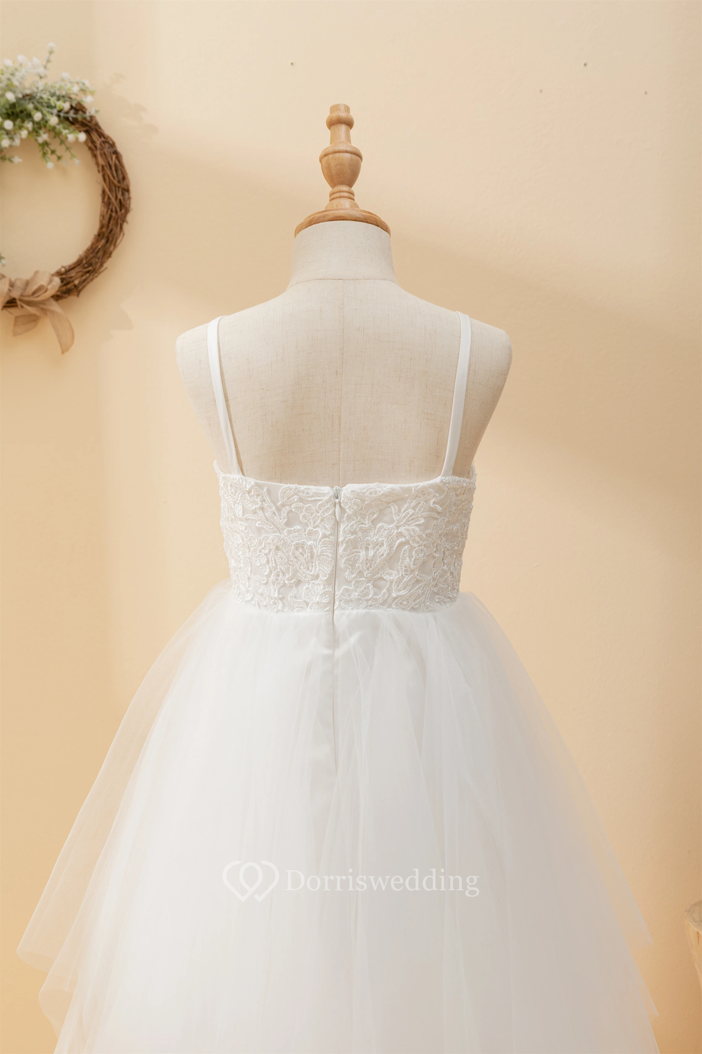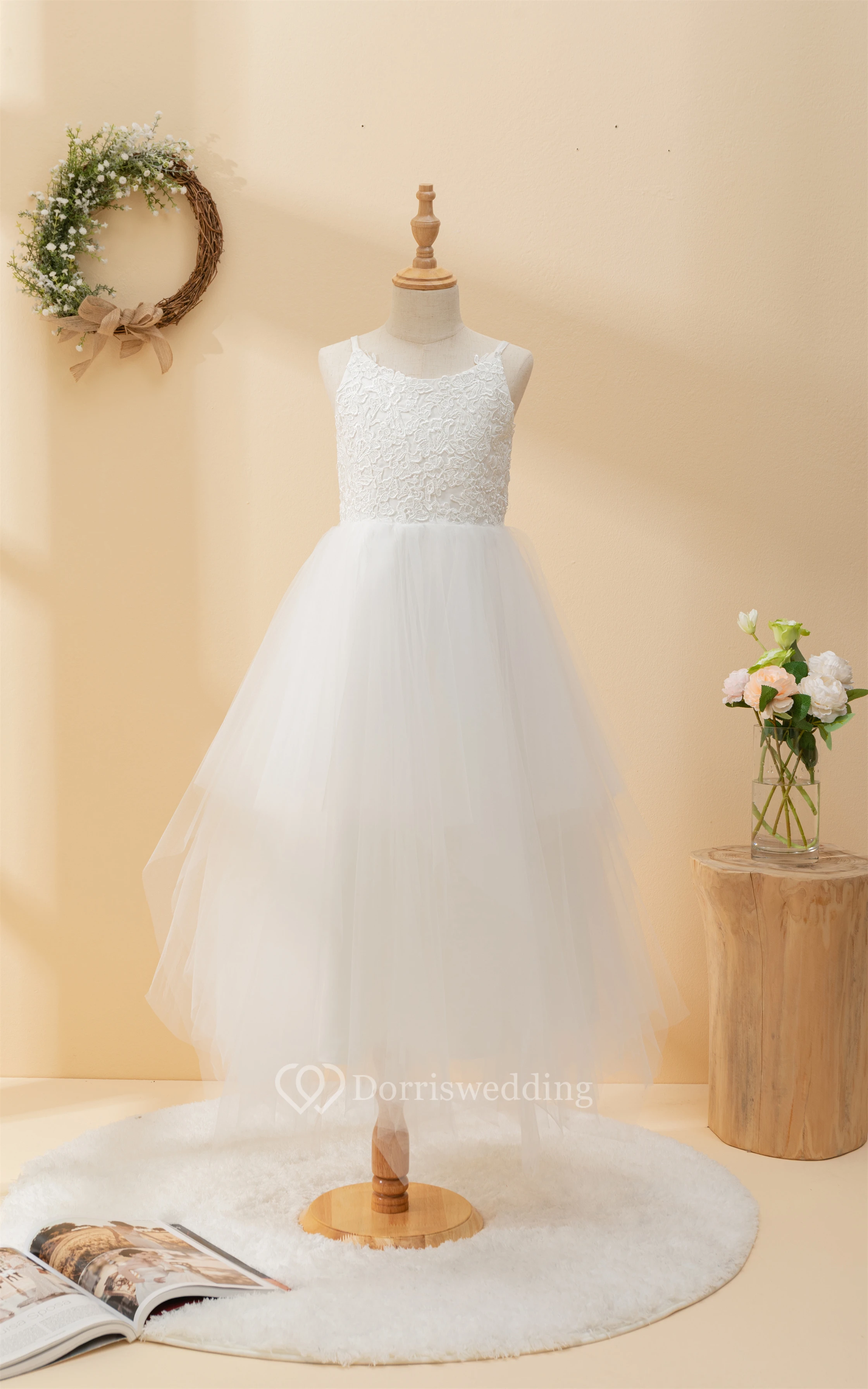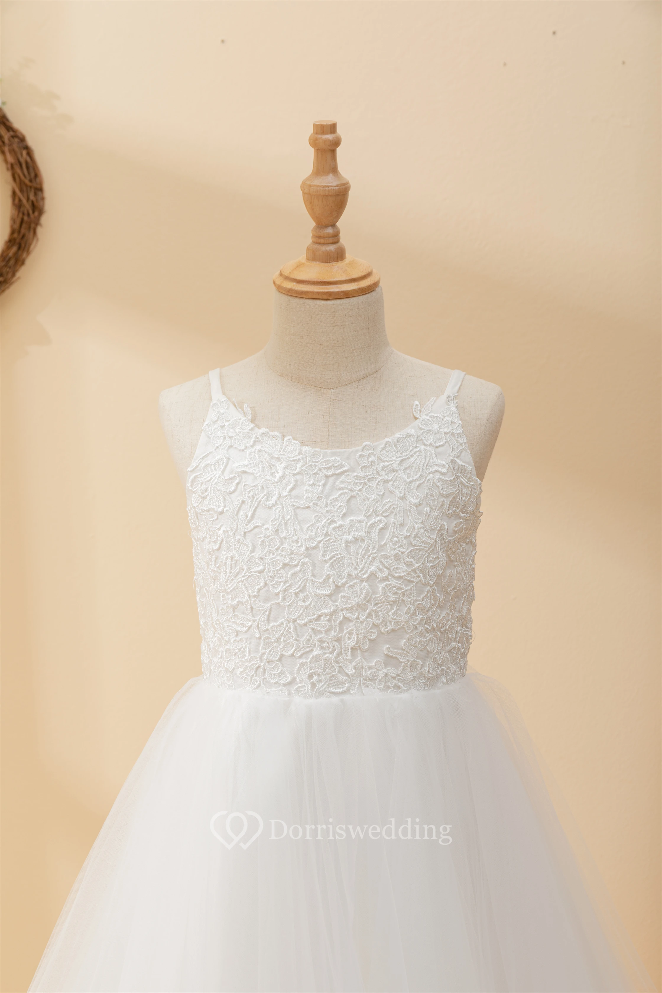 Casual Spaghetti Lace Top A-line Flowergirl Dress with Tulle Skirt