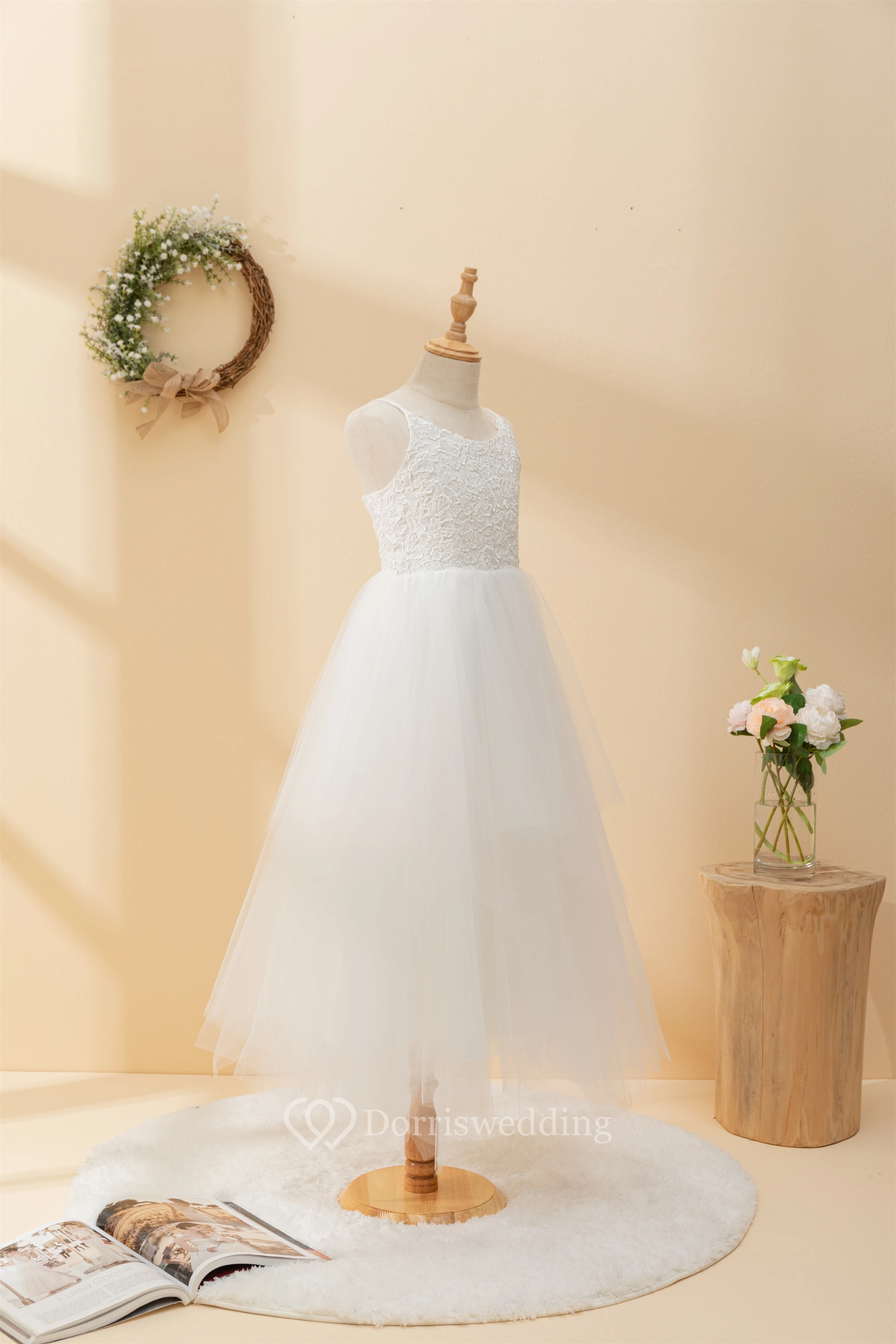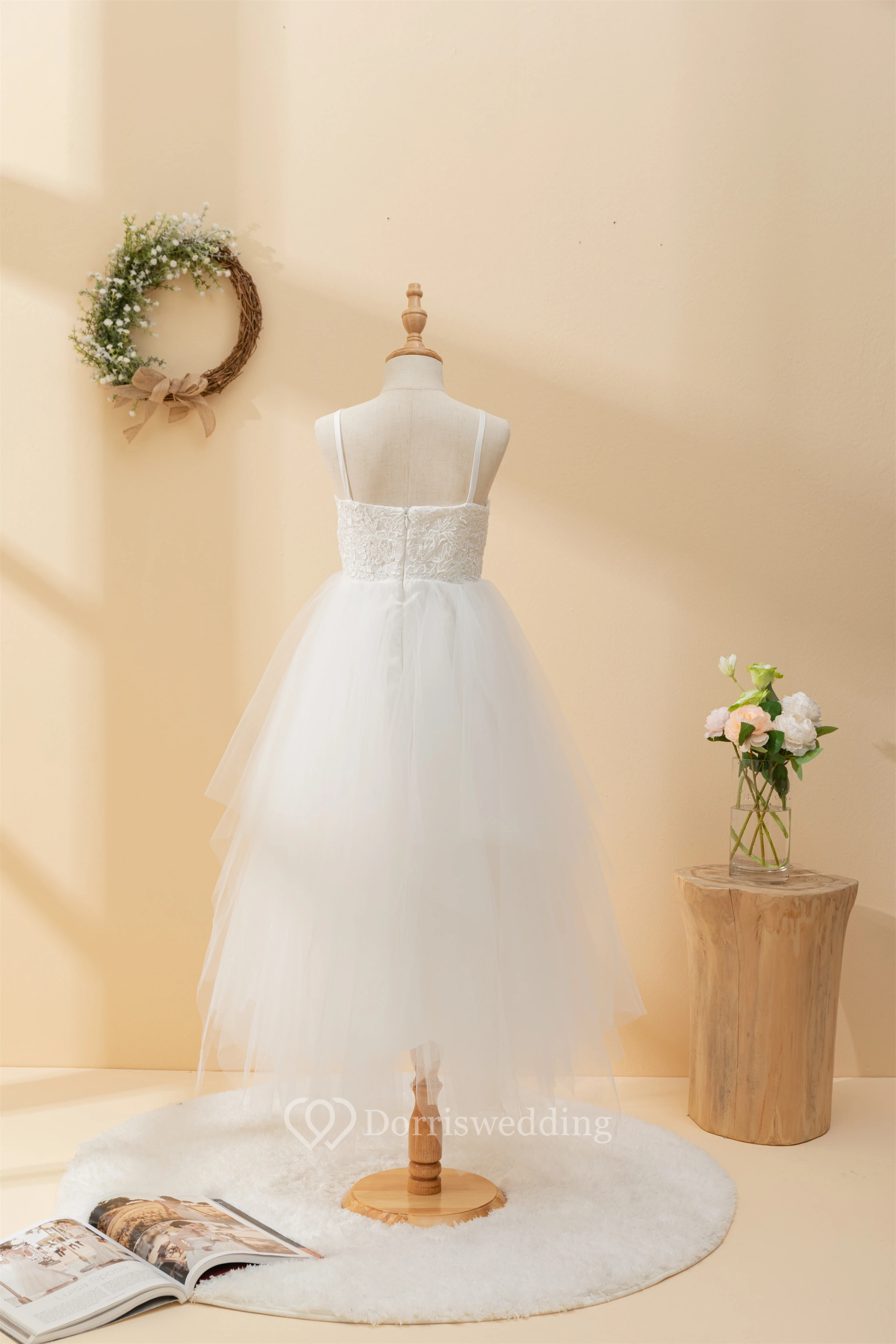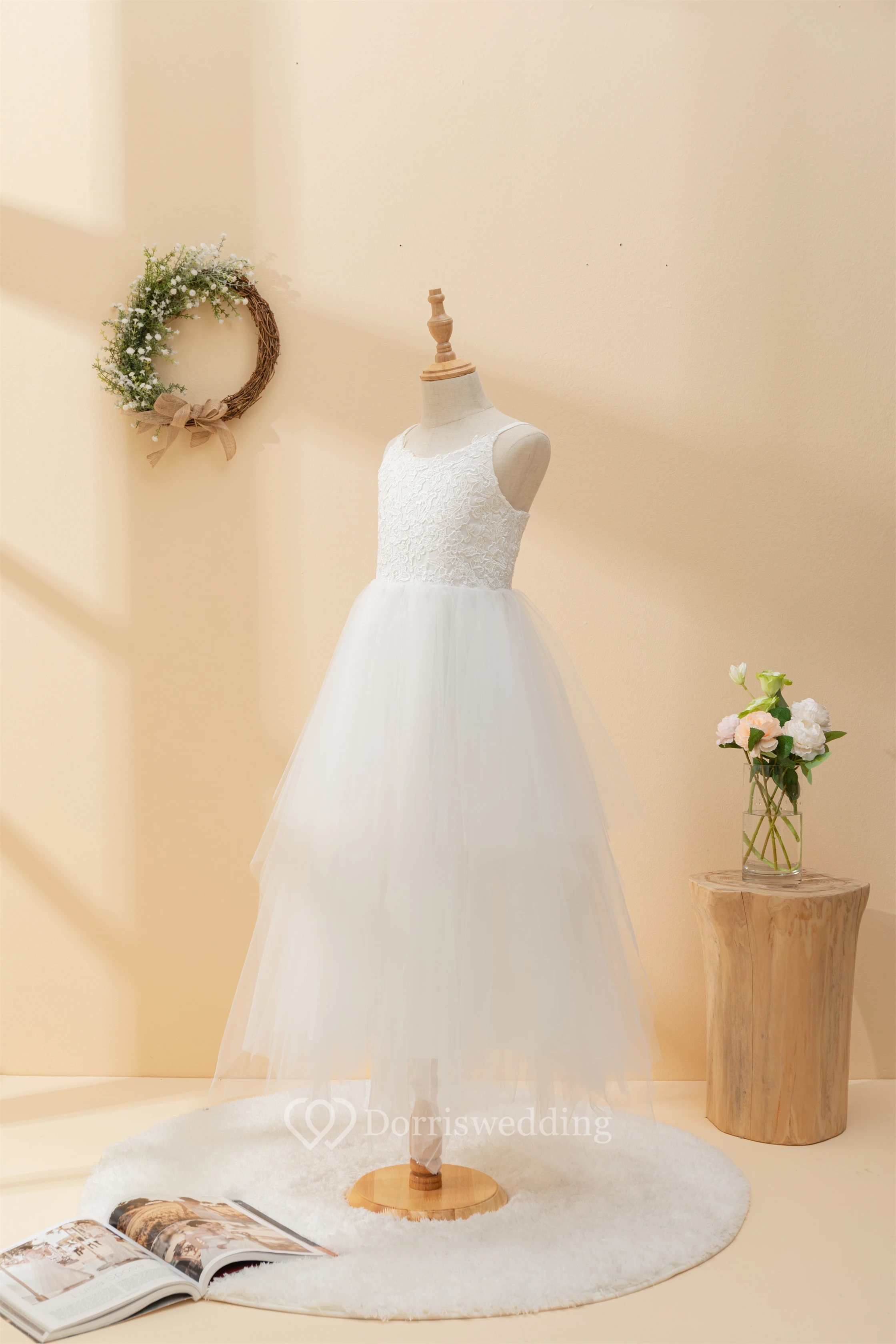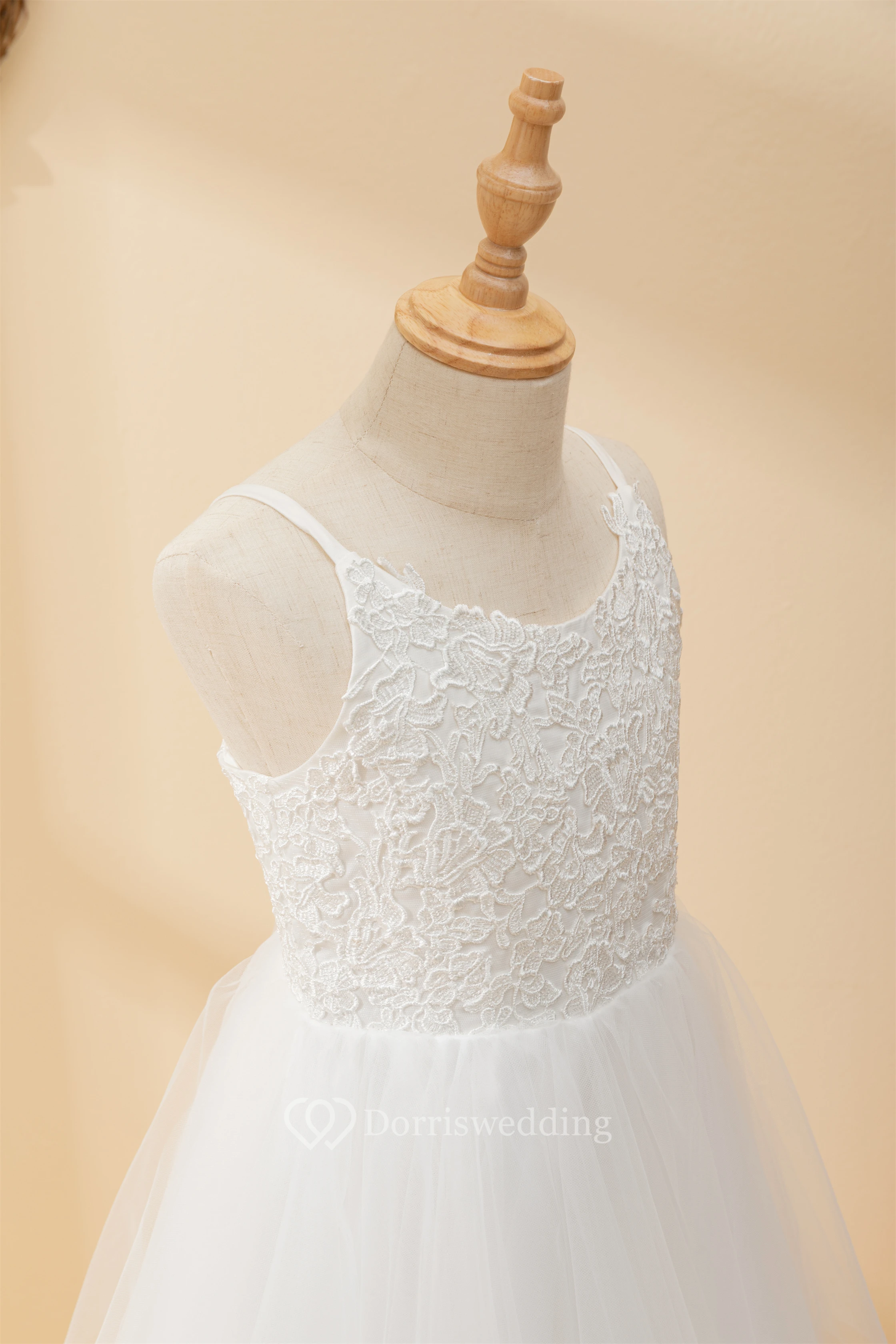 Casual Spaghetti Lace Top A-line Flowergirl Dress with Tulle Skirt
