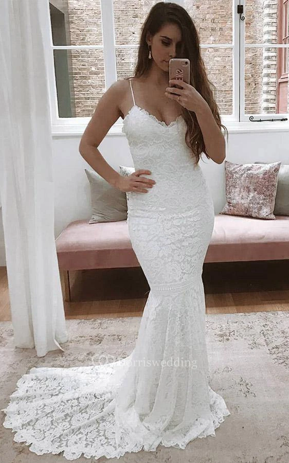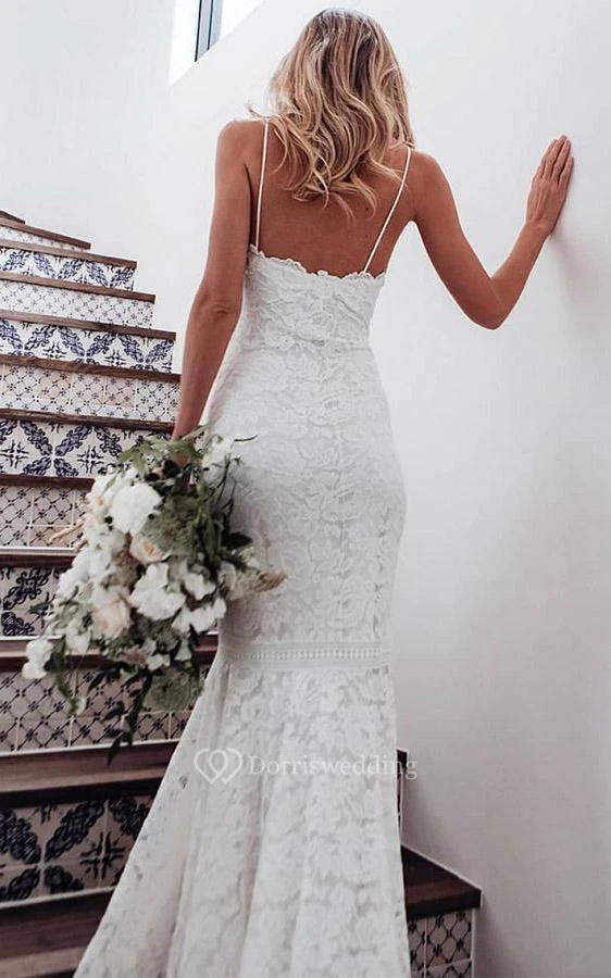 Casual Spaghetti Sheer Lace Mermaid Wedding Dress with Sweep Train