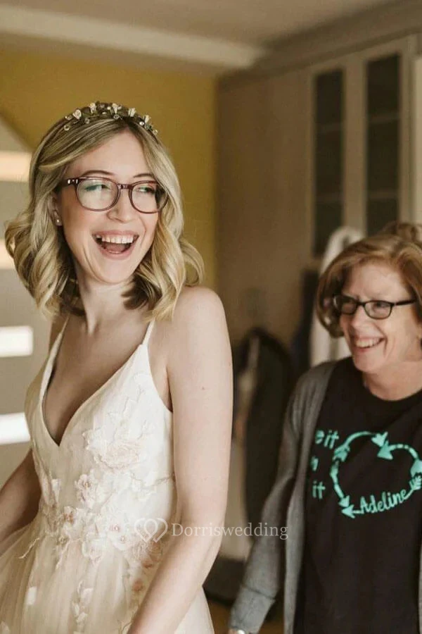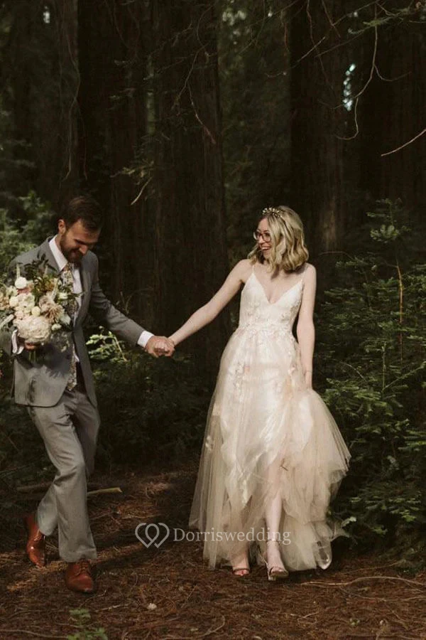 Casual Spaghetti V-neck Tulle Applique Draped Country Wedding Dress