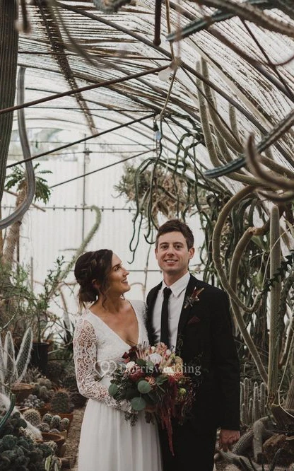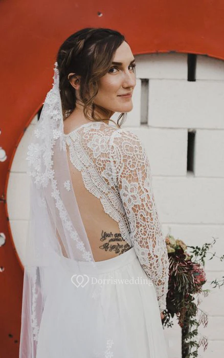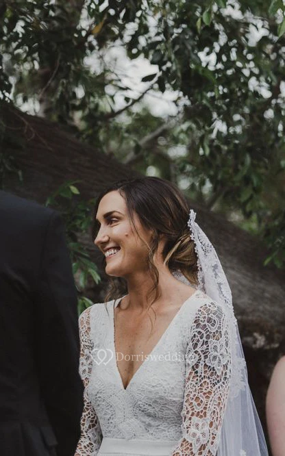 Casual V-Neck Sheath Boho Wedding Dress with Illusion Full Sleeves and Open Back