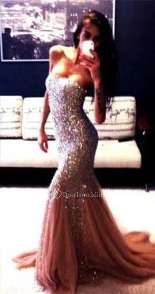 Champagne New Gorgeous Mermaid Strapless Prom Dresses Sleeveless Beadings Evening Gowns With Ruffles