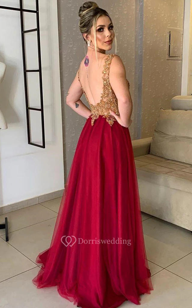 Charming A Line Lace and Tulle Prom Dress with Split Front