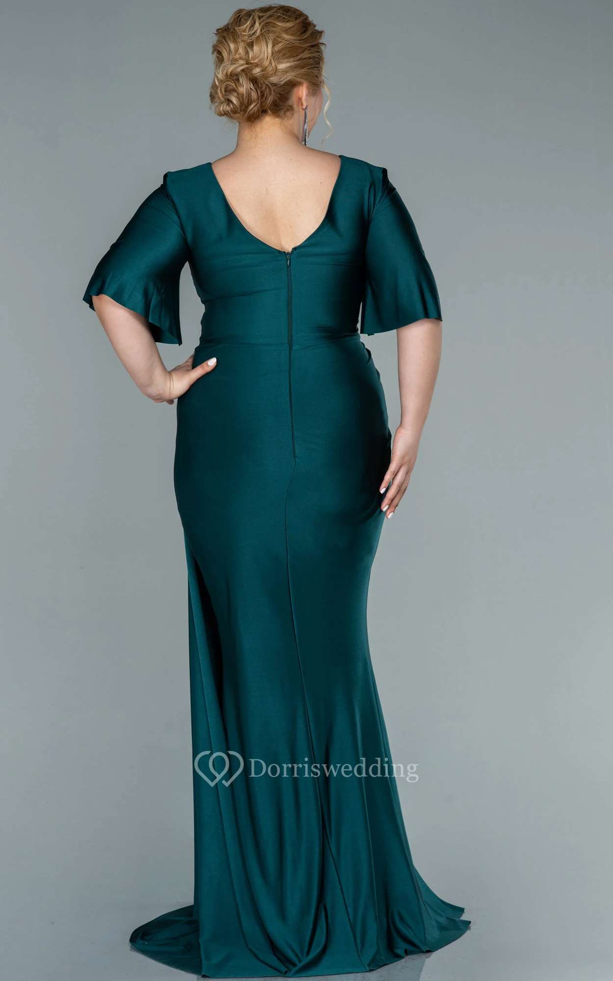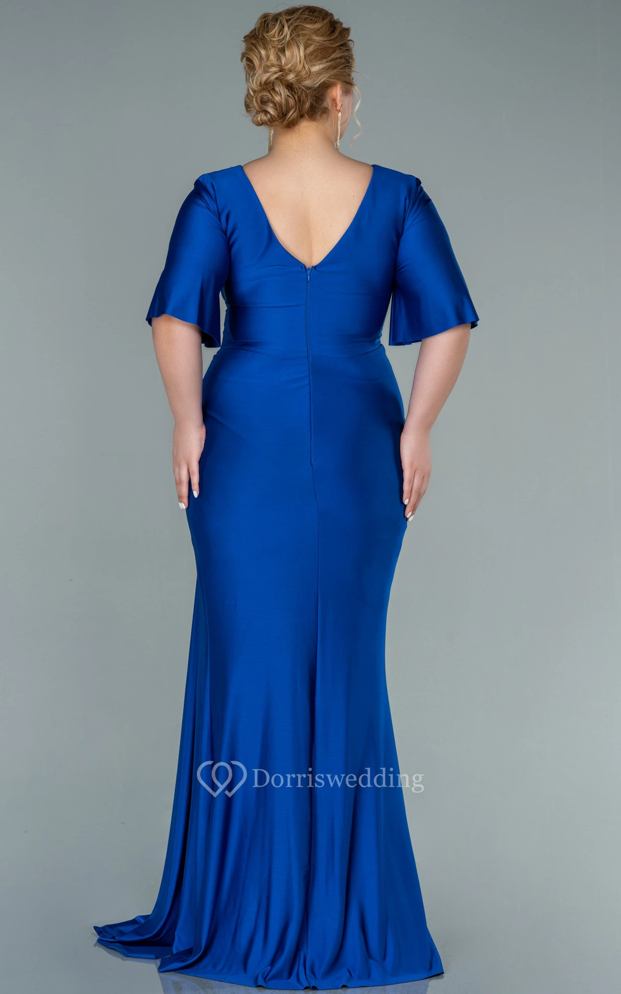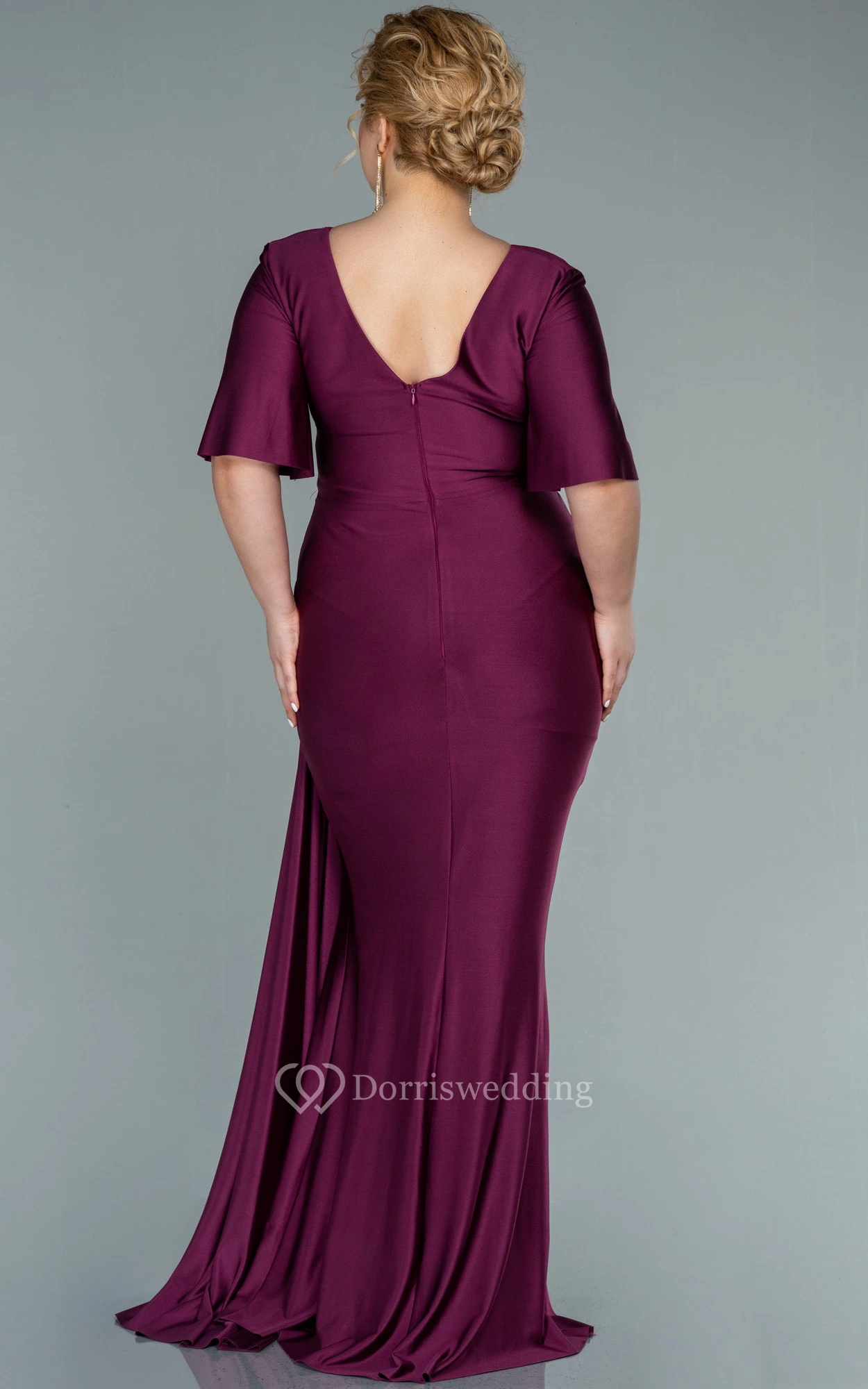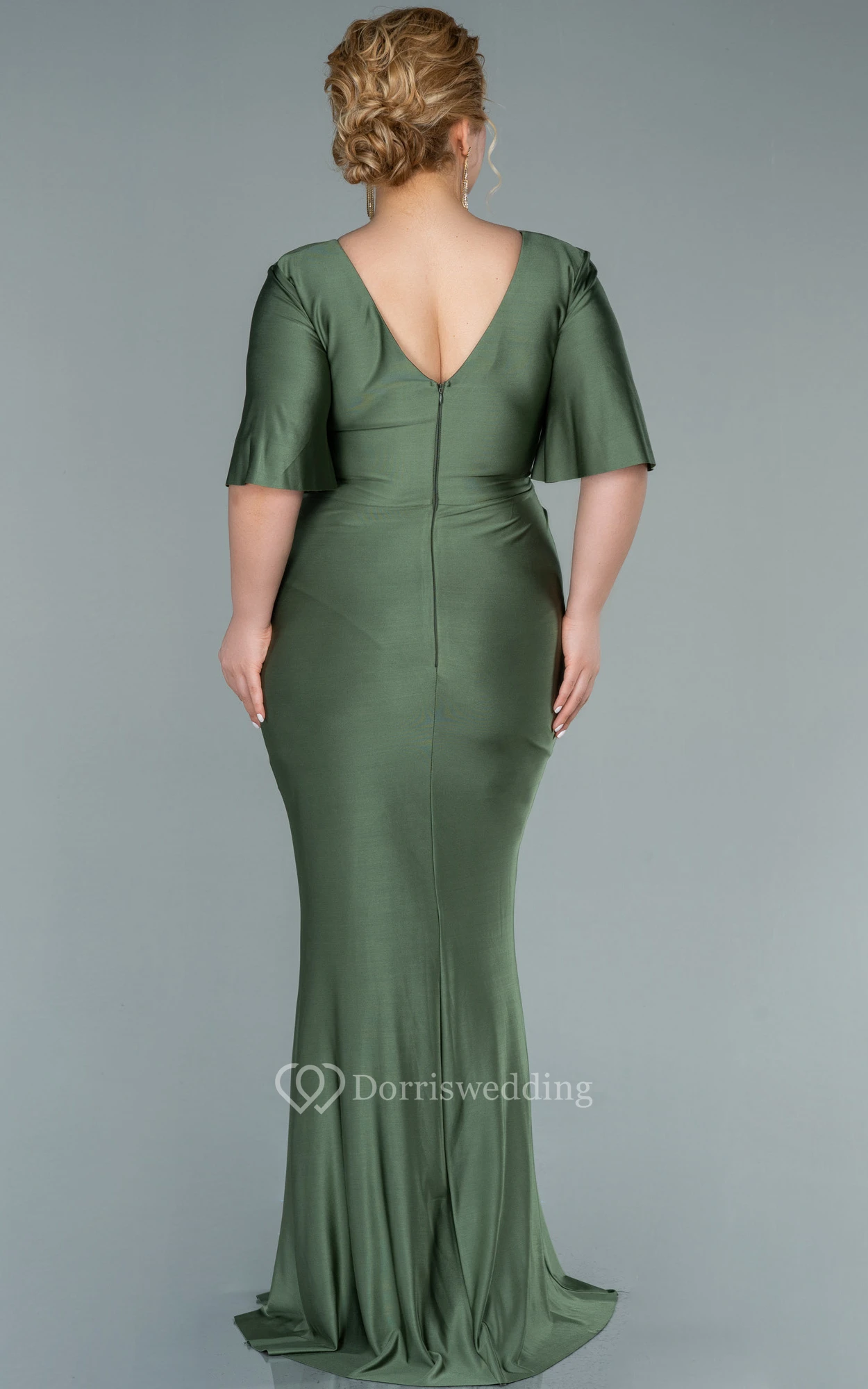 Charming V-neck Half-sleeve Sheath Mermaid Ruched Front Split Plus Size Evening Dress