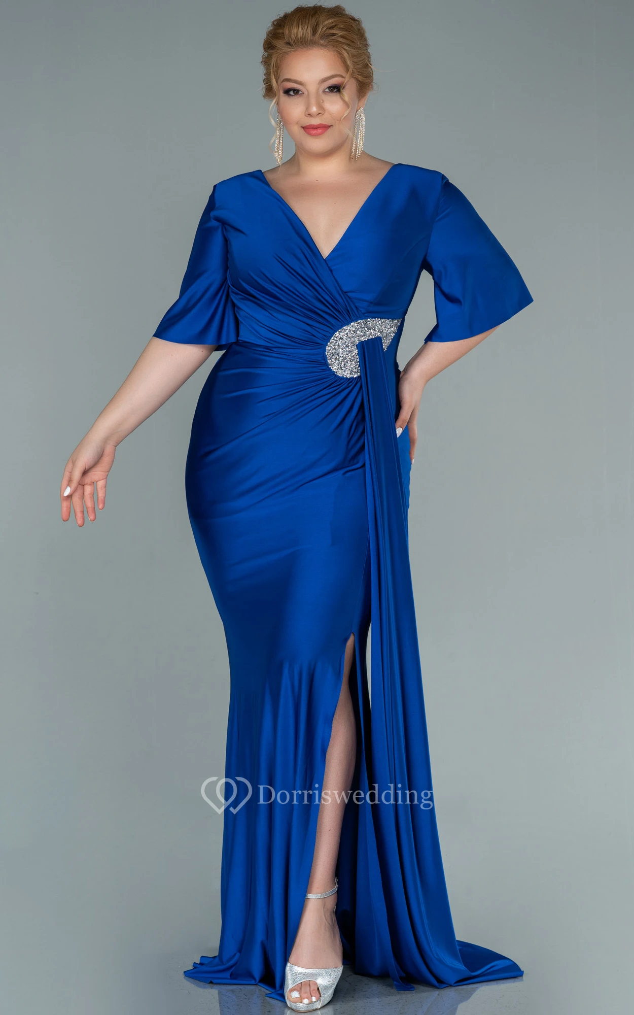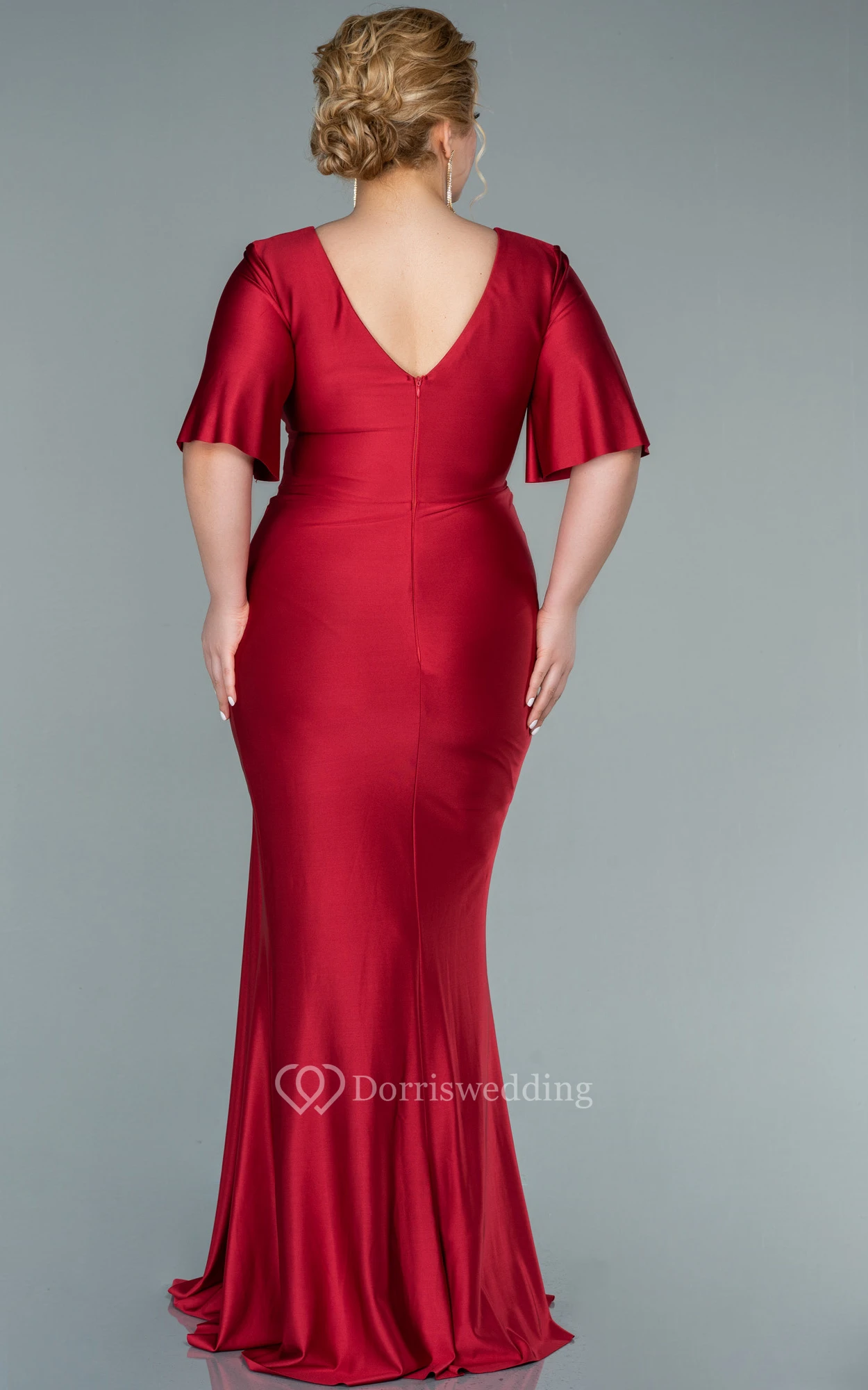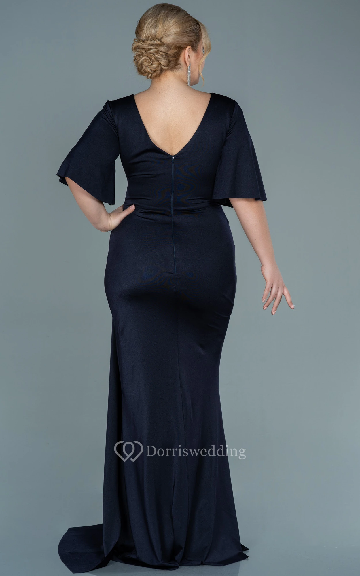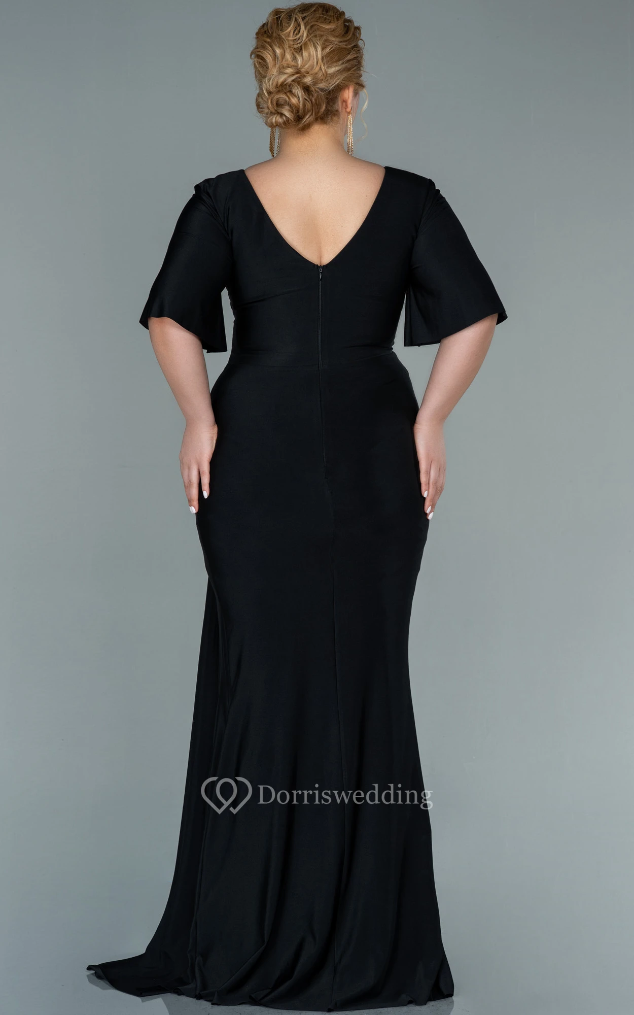 Charming V-neck Half-sleeve Sheath Mermaid Ruched Front Split Plus Size Evening Dress