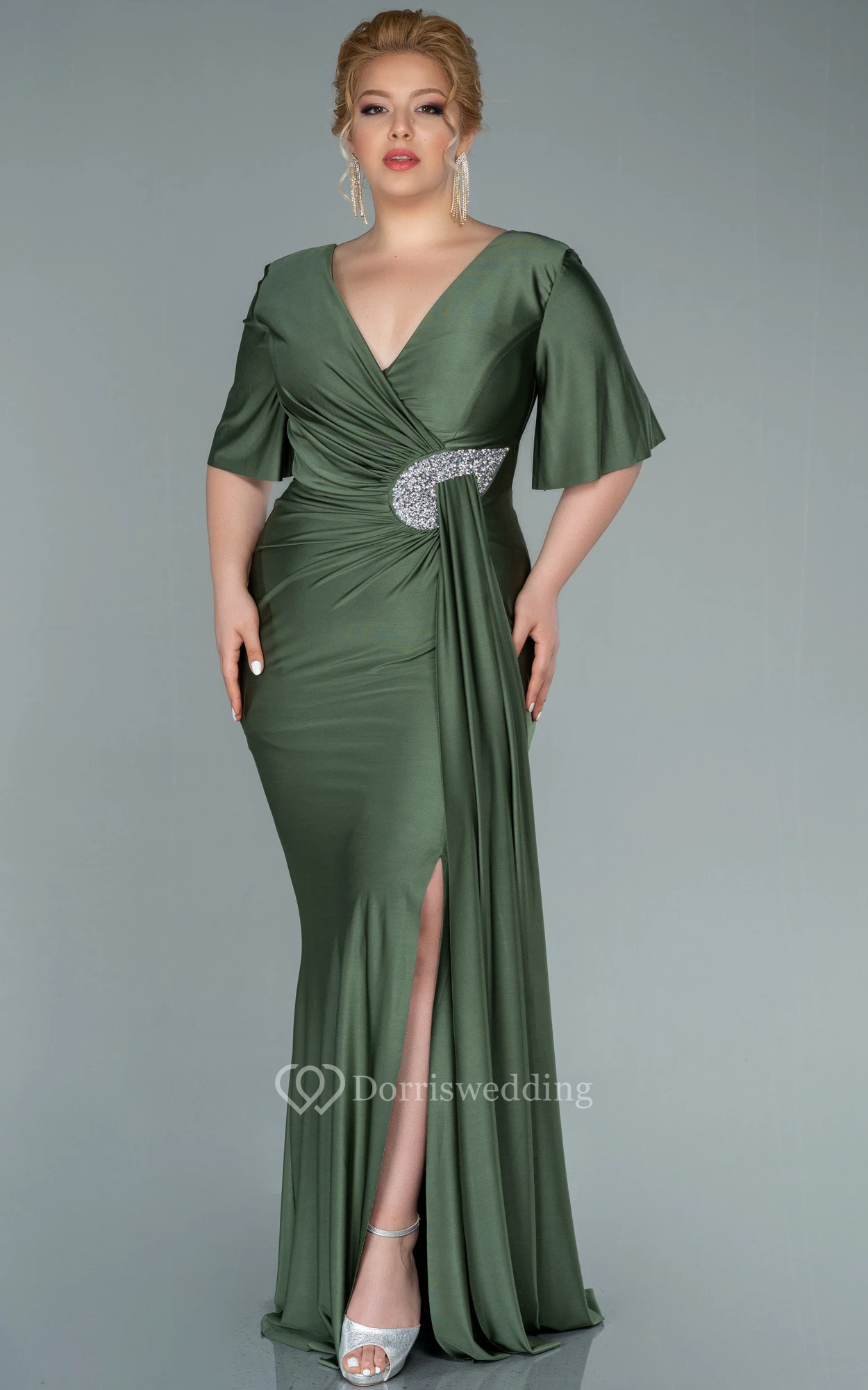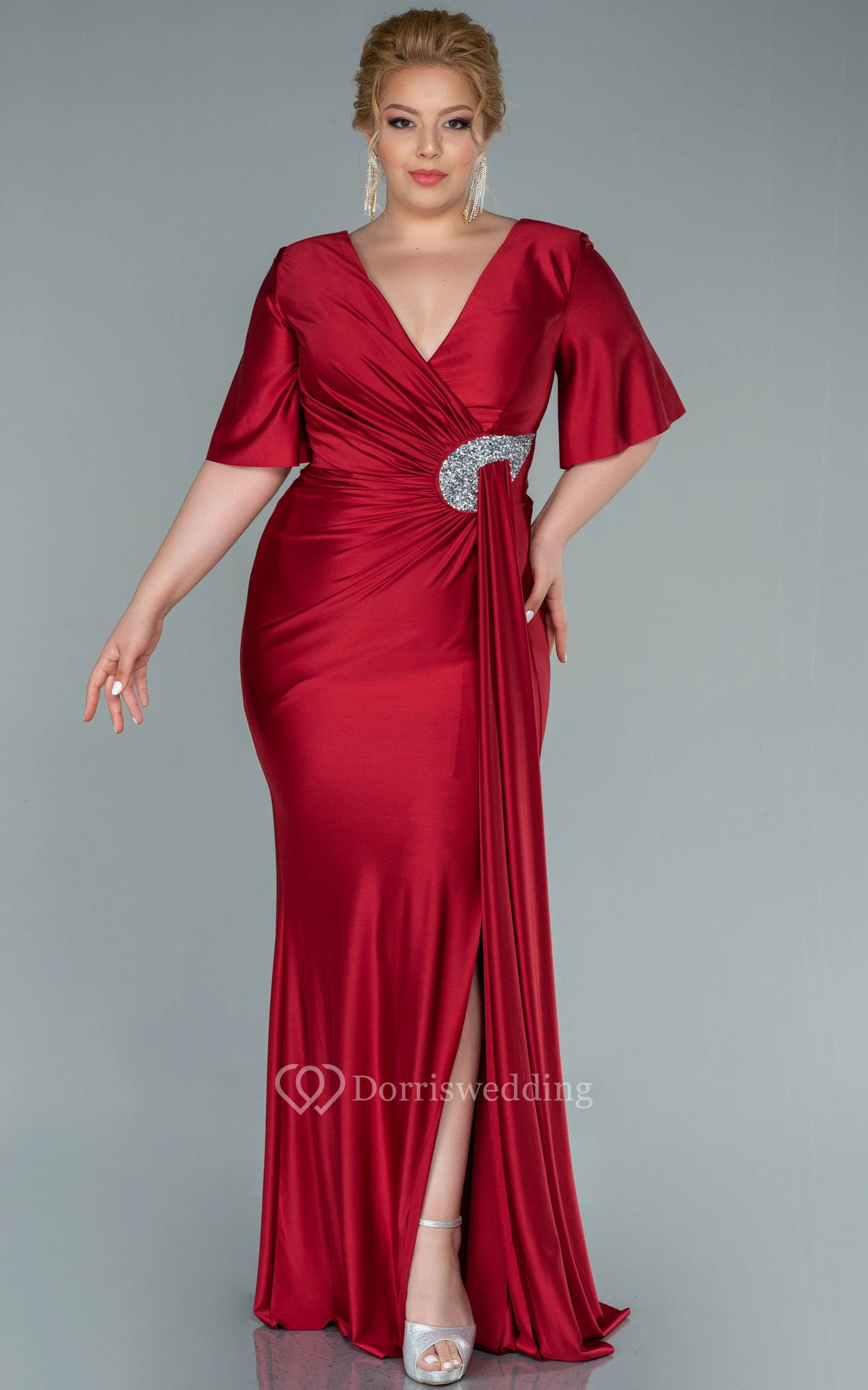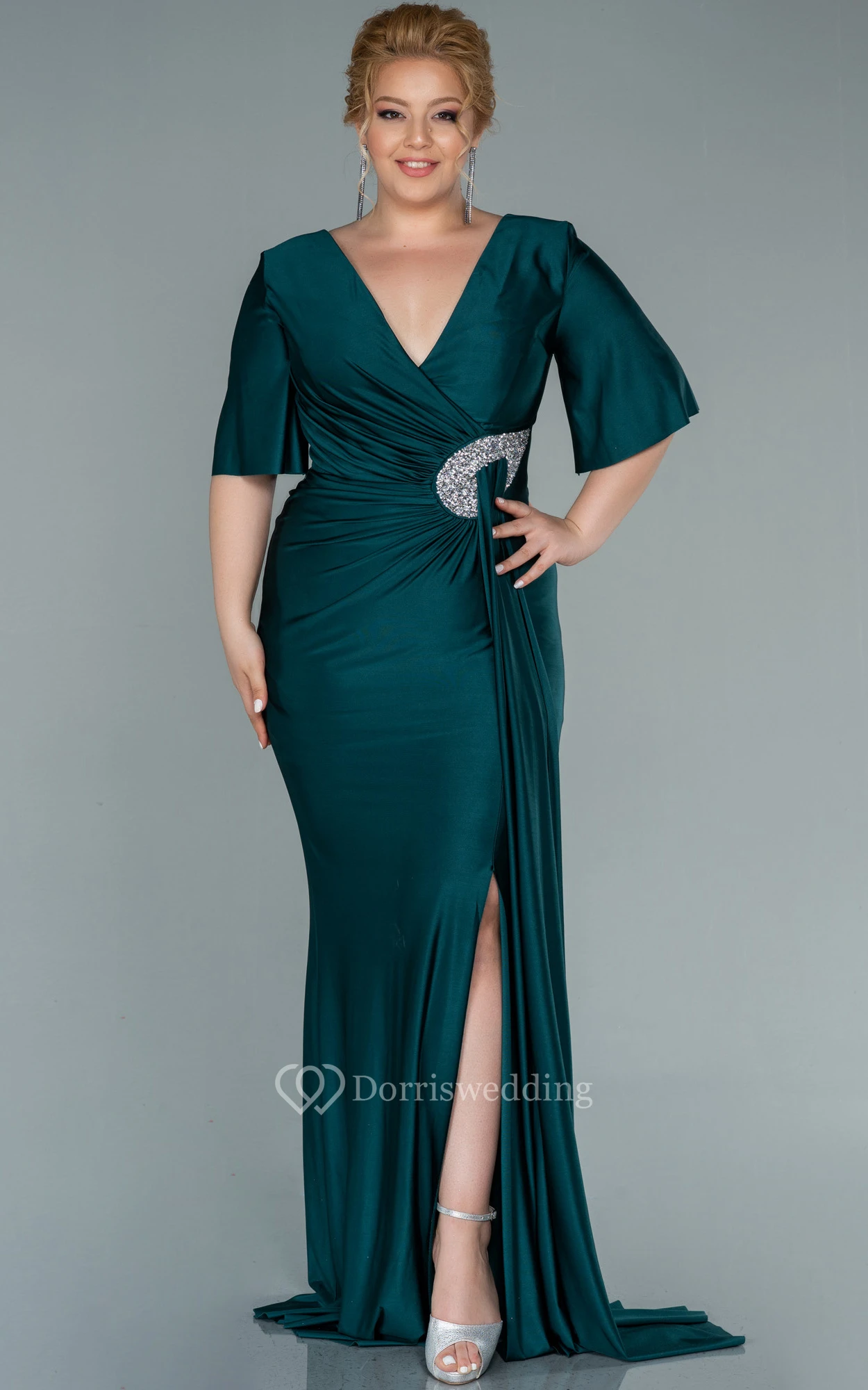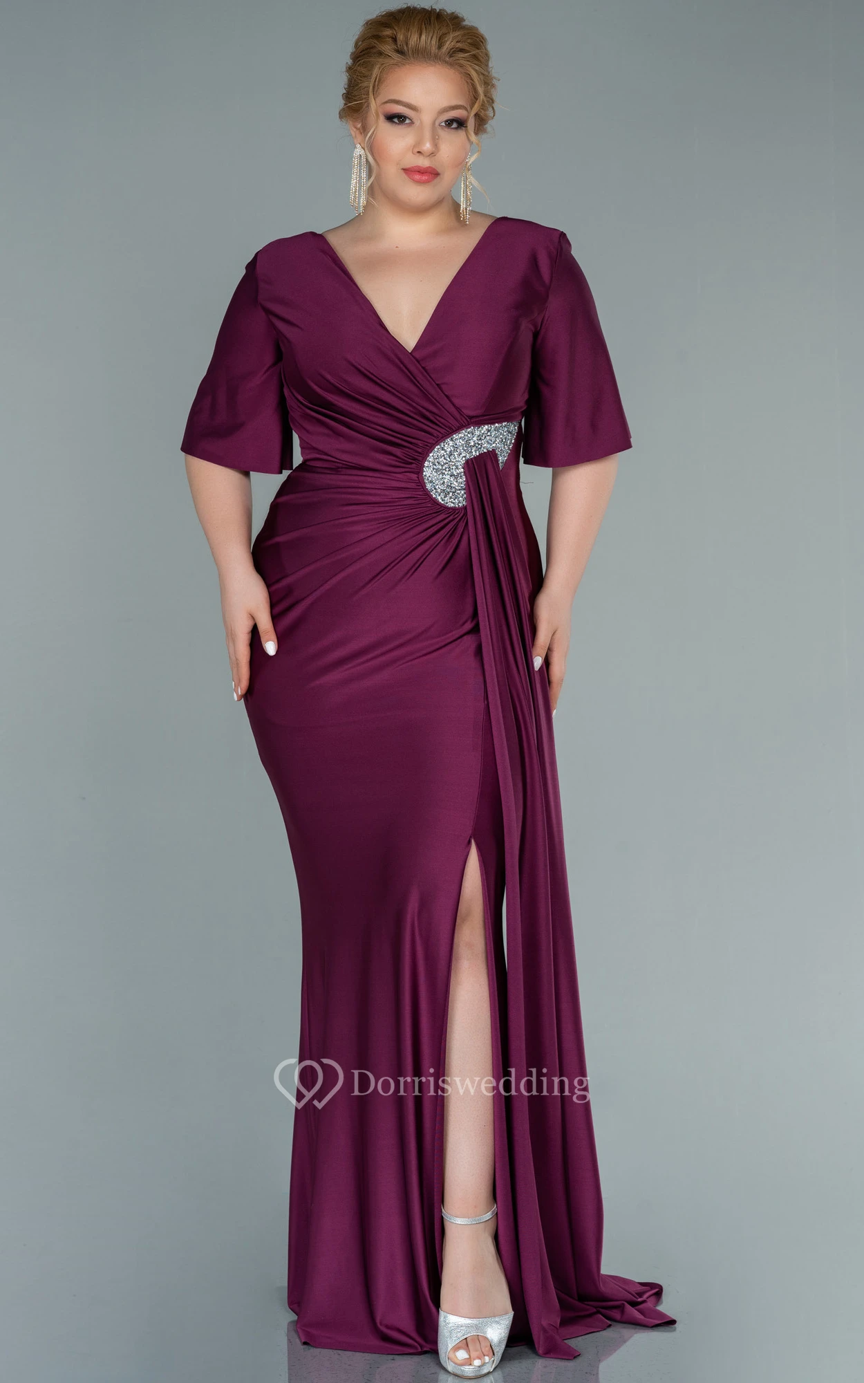 Charming V-neck Half-sleeve Sheath Mermaid Ruched Front Split Plus Size Evening Dress