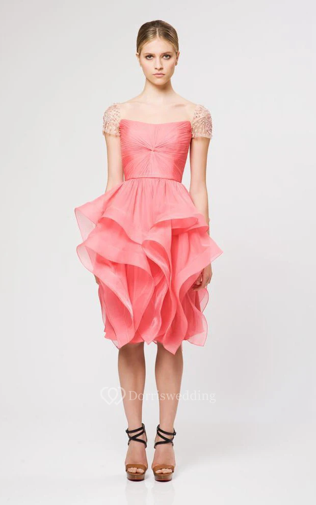 Sexy Bateau Neckline Beaded Capped Sleeves Tiers Skirt