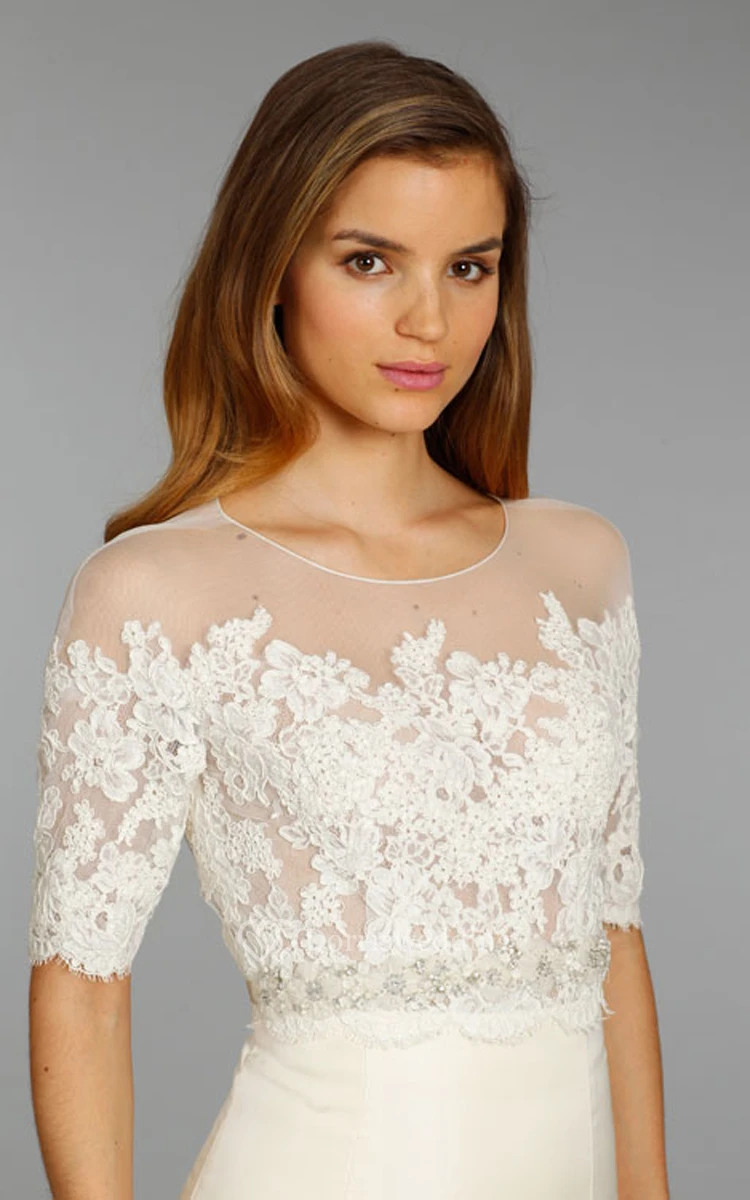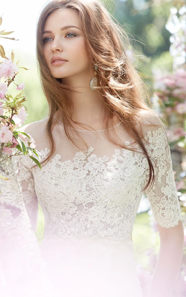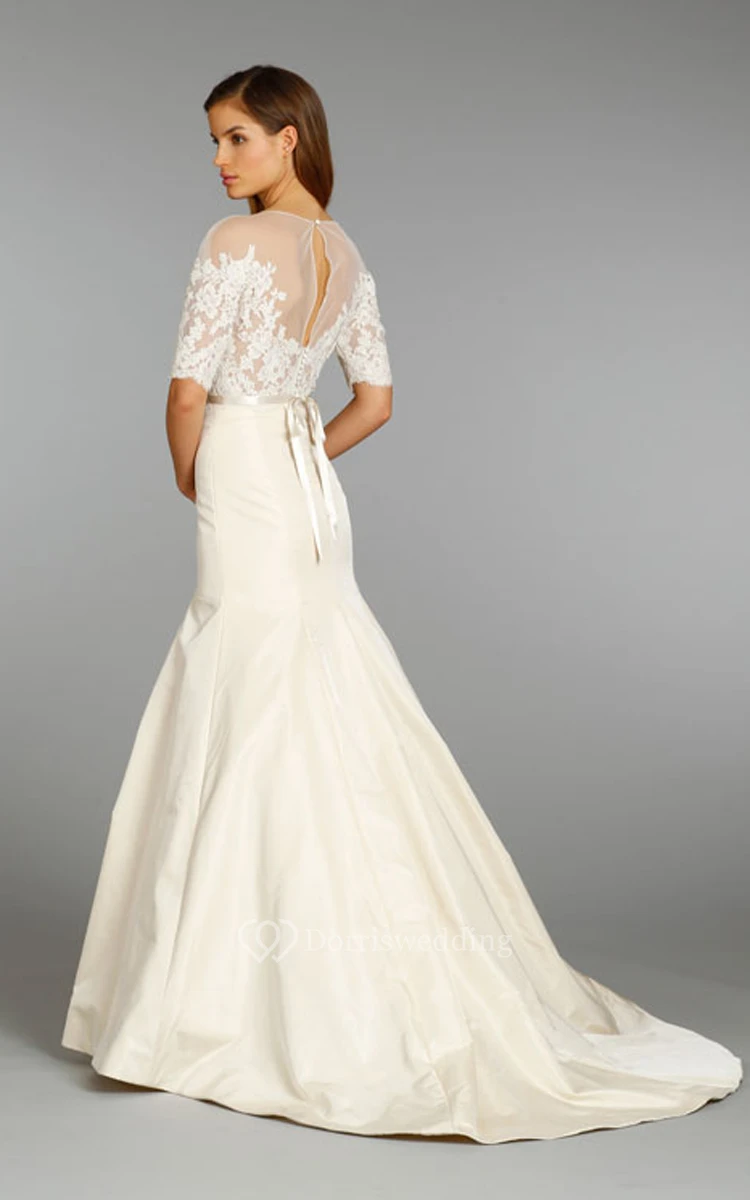 Chic 3-4 Sleeve Lace Bodice Taffeta Mermaid Dress With Sheer Neckline