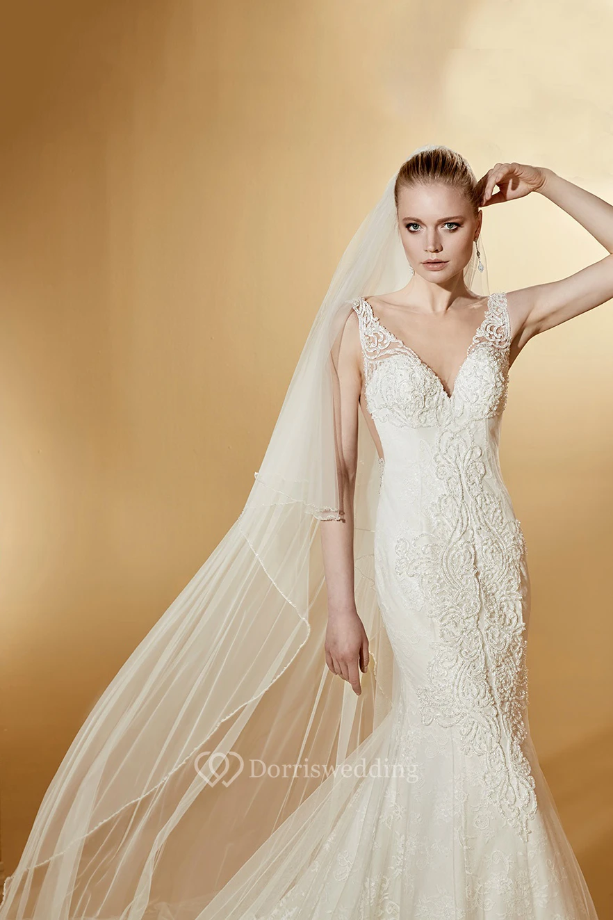 Chic Cap sleeve Mermaid Lace Wedding Gown with Illusive Appliques Straps and Court Train