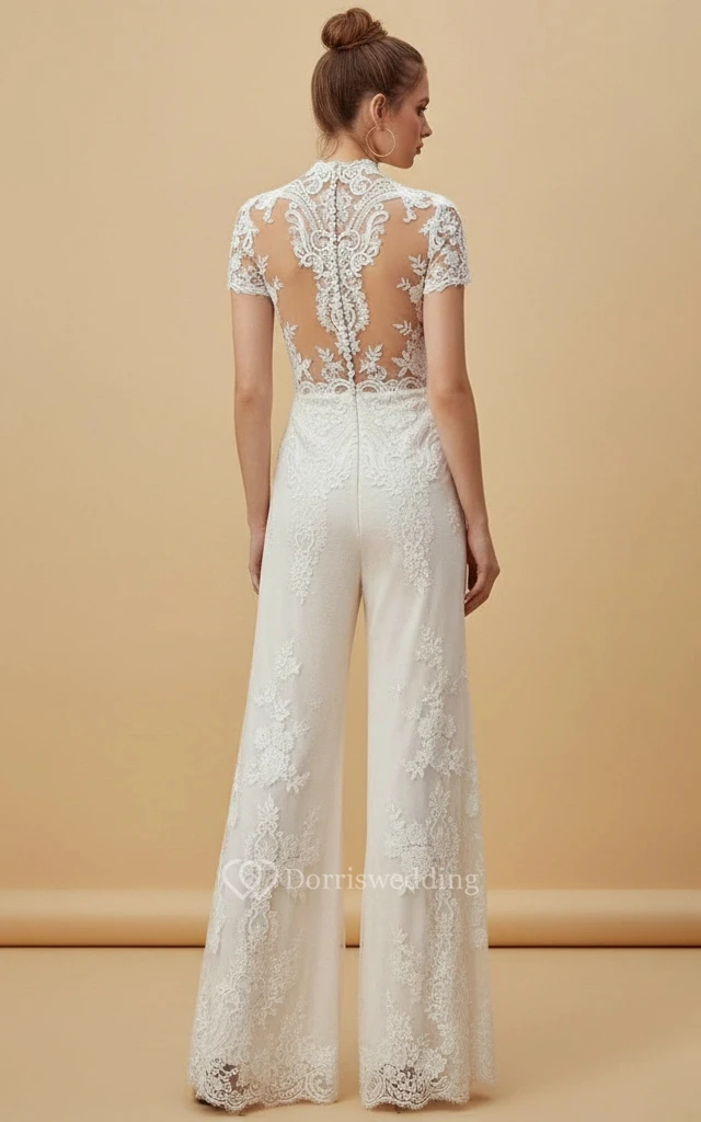I chose this for our civil ceremony and I couldn't have been happier. The high neck adds an air of sophistication that made me feel very "bride," even without a gown. The lace detail is delicate and feminine, and the short sleeves were perfect for the spring weather. The trousers are a great width—wide enough to be stylish but not so wide that I was tripping over them. It was the perfect balance of comfort and elegance for our special day.