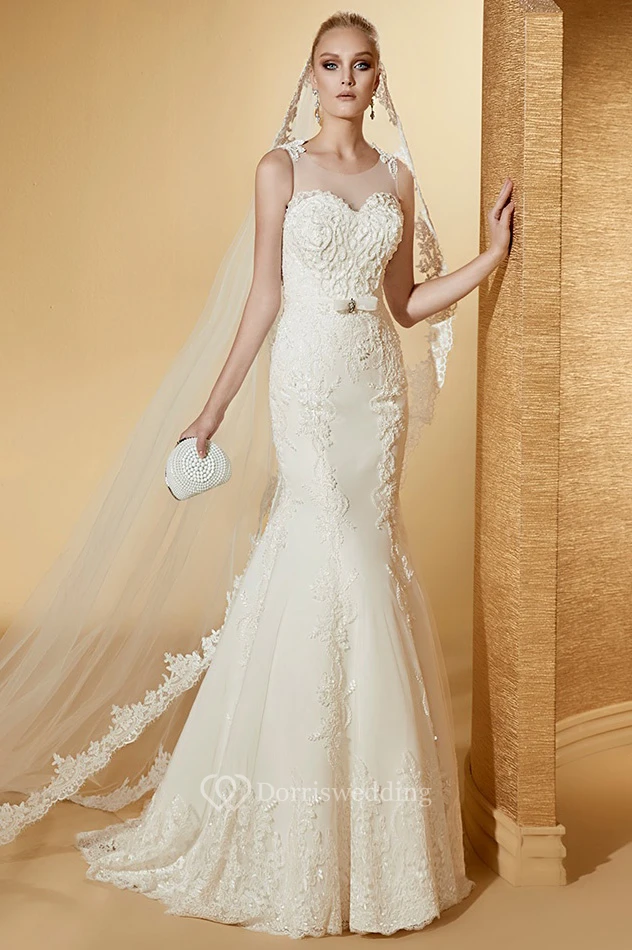 Chic Jewel-Neck Cap Sleeve Mermaid Lace Gown With Illusive Neckline And Brush Train
