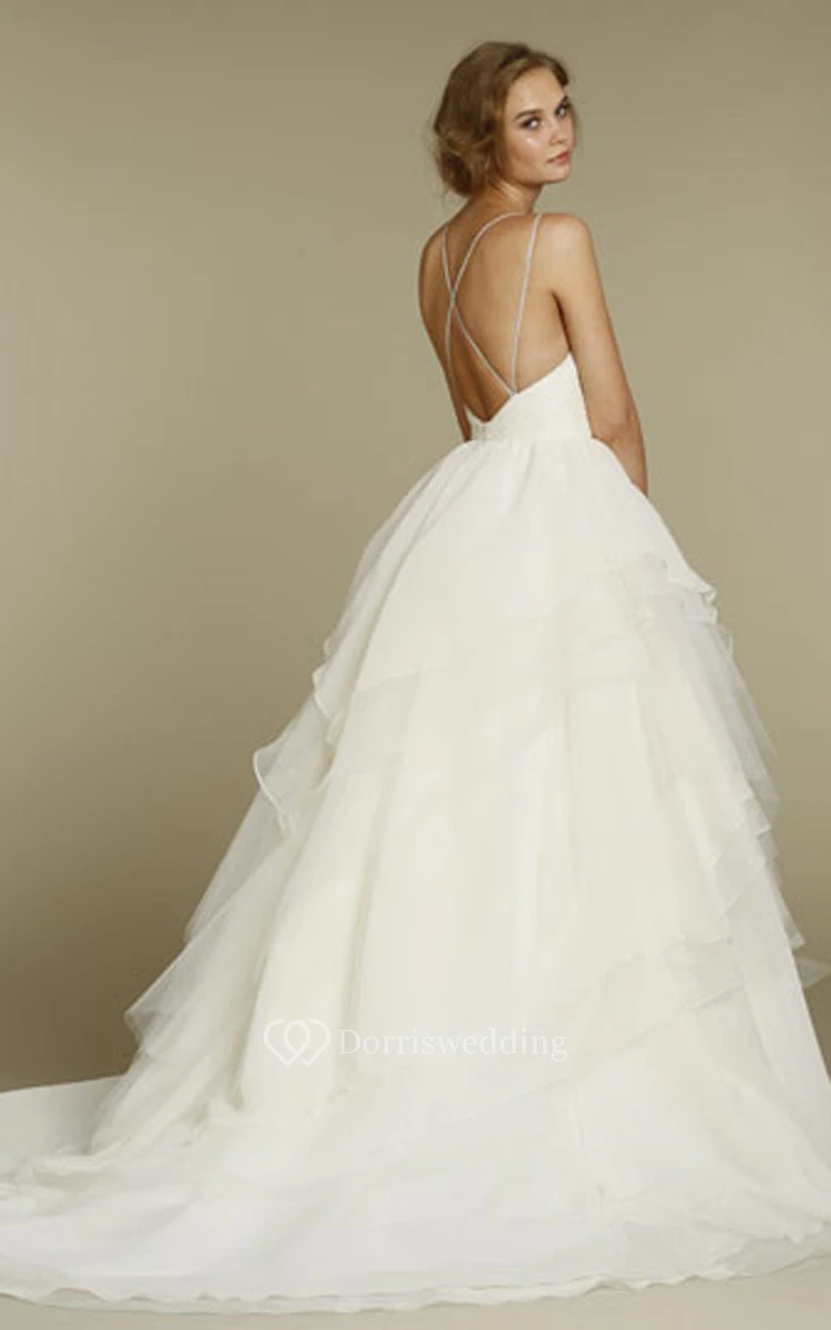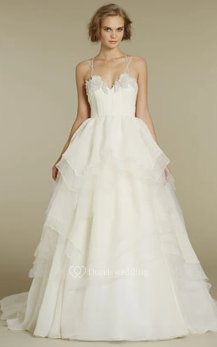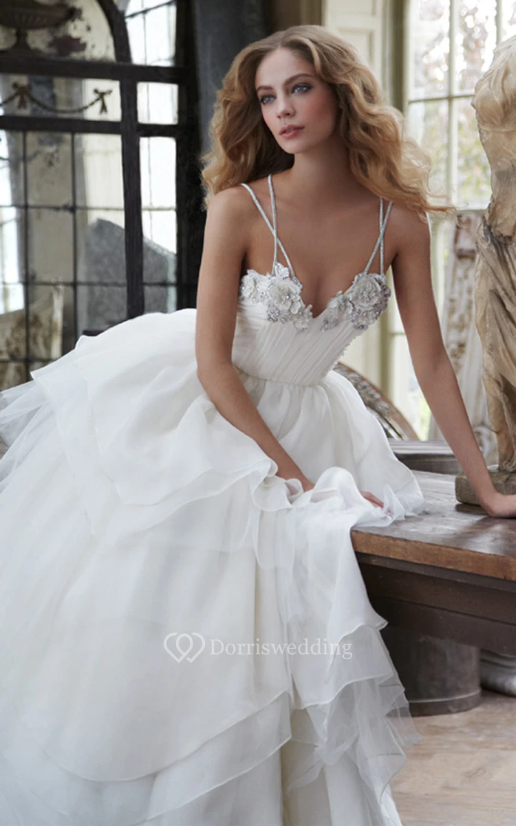 Chic Spaghetti Strap Tulle Organza Ball Gown With Beaded Floral Applique