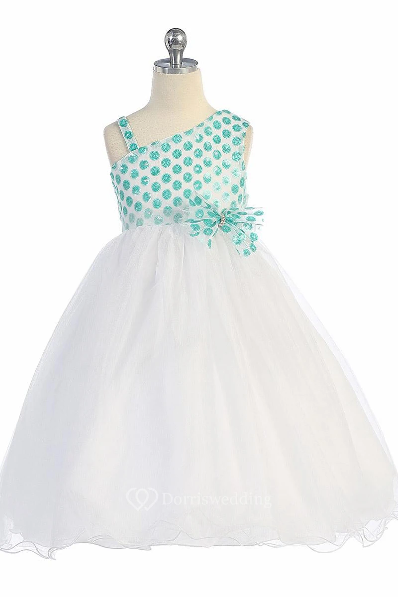 One-Shoulder Tea-Length Bowed Tulle&Sequins Flower Girl Dress With Tiers