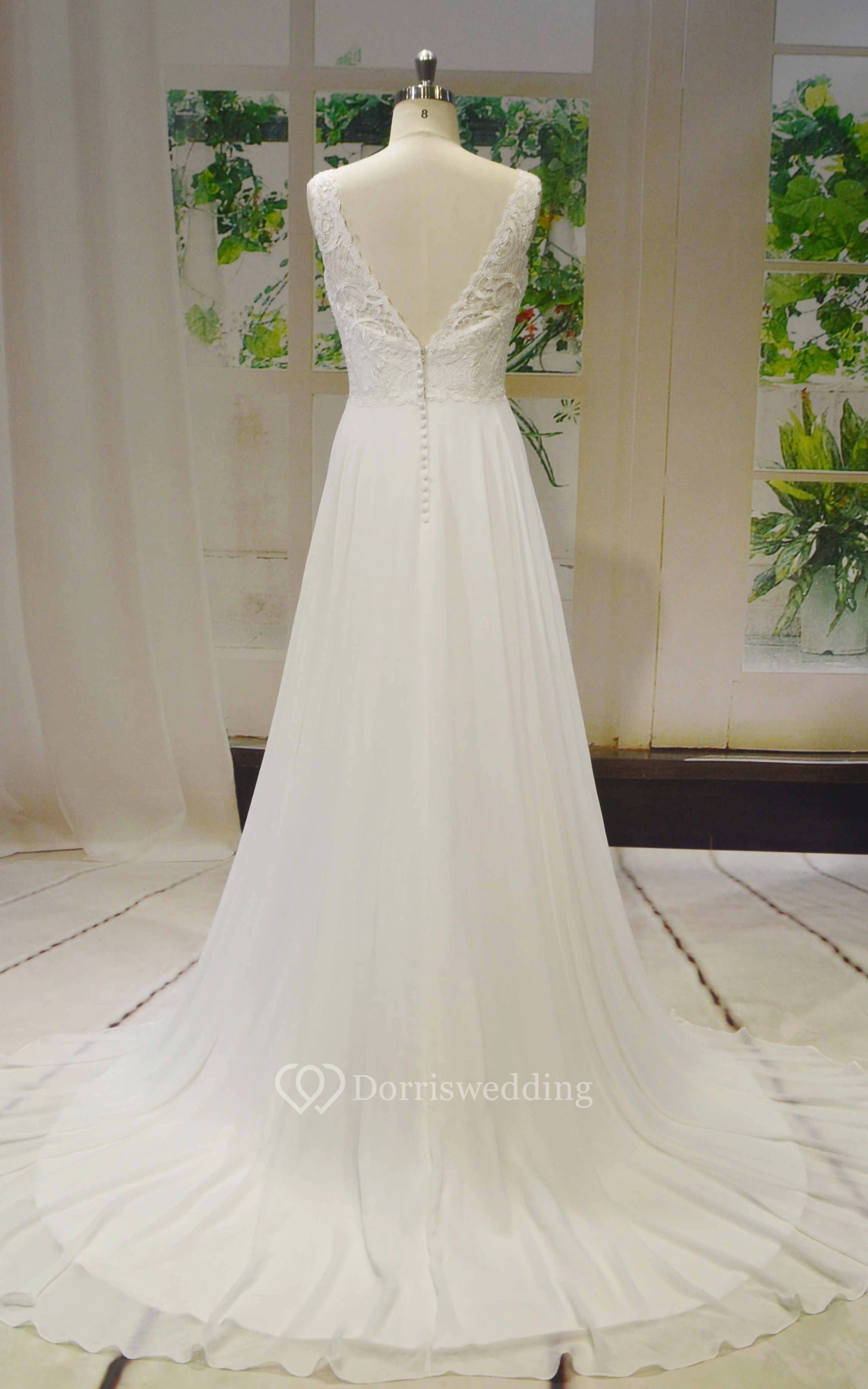 Chiffon A-line Sleeveless V-neck Wedding Dress With Lace Top And V-back Buttons