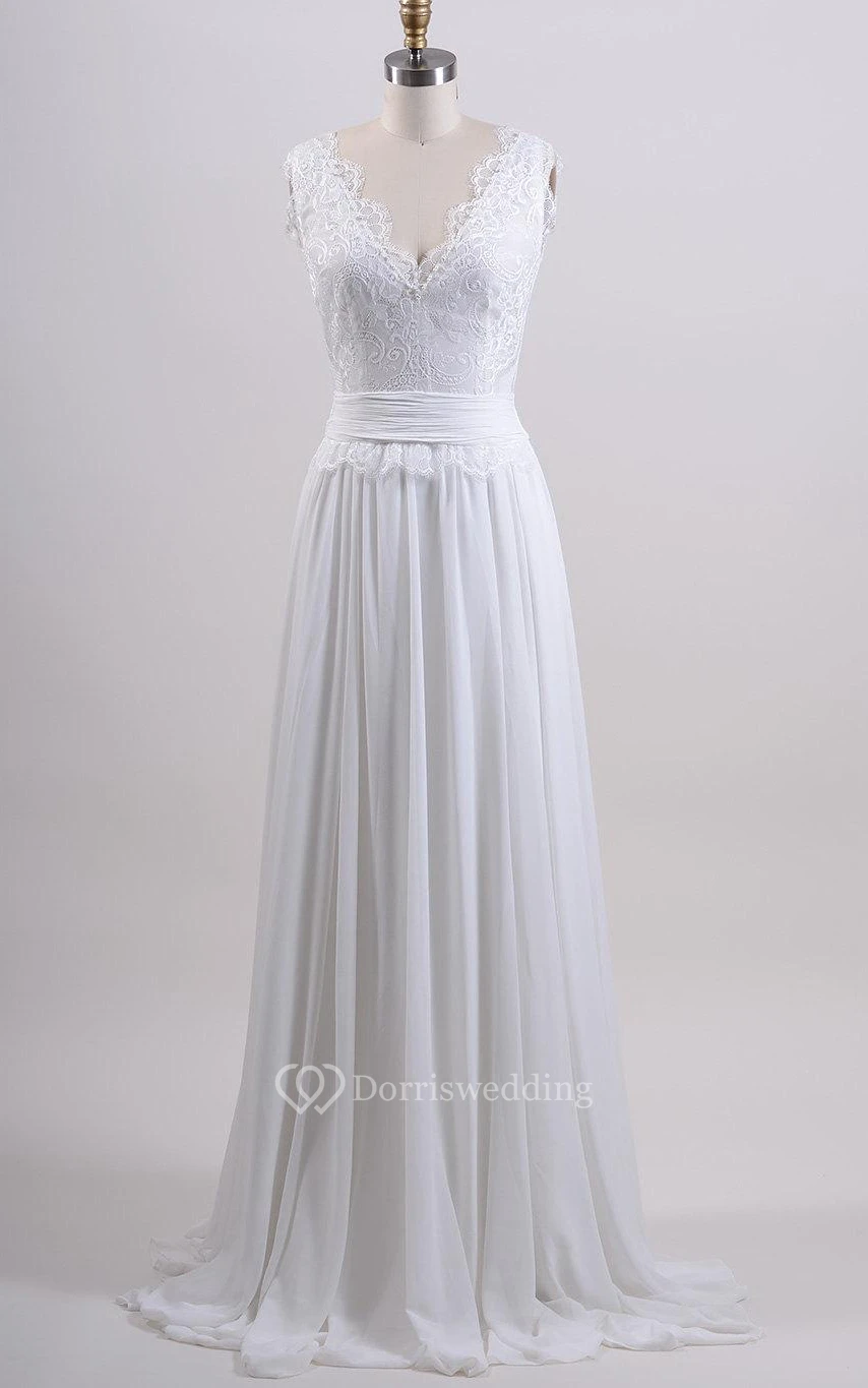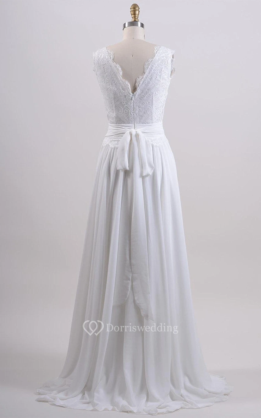 Chiffon and Lace Sleeveless V-Neck Dress With Pleated Skirt and Back Bow