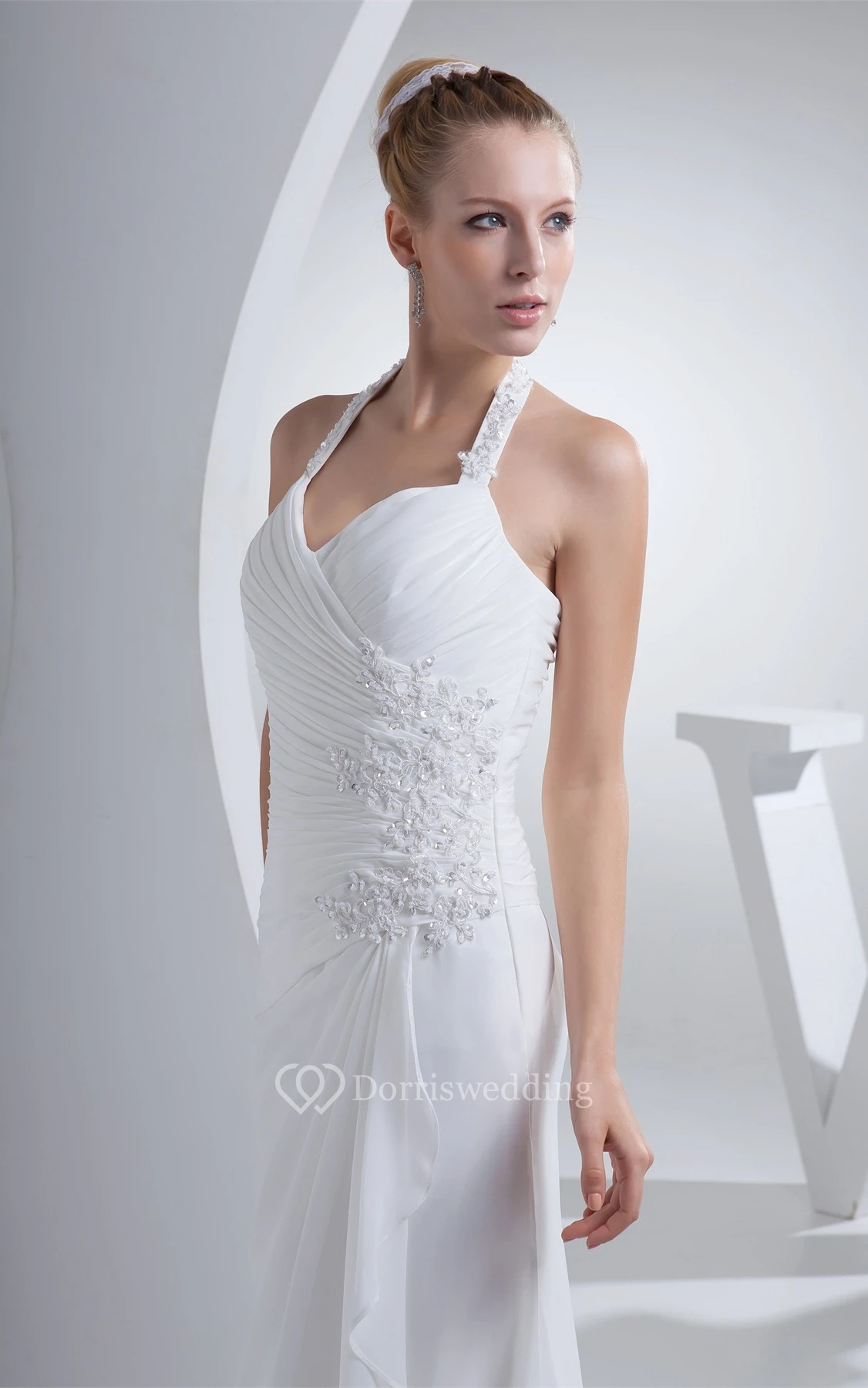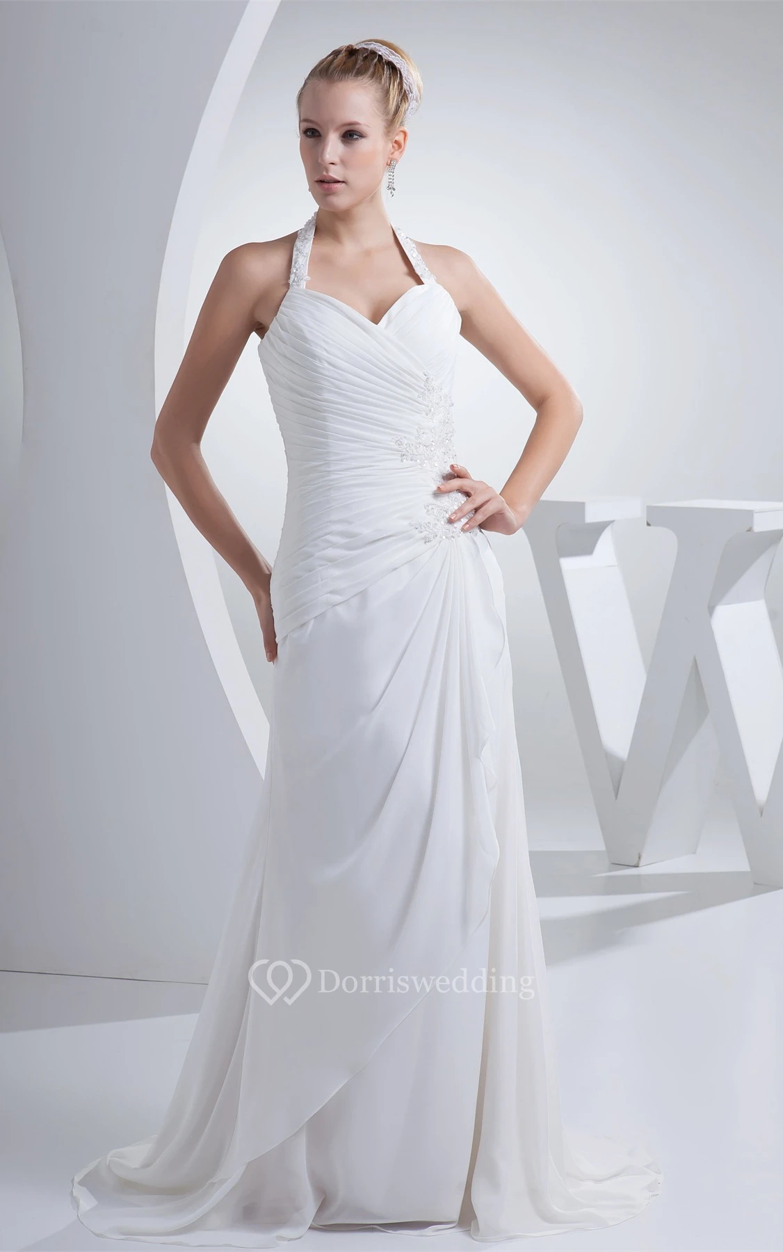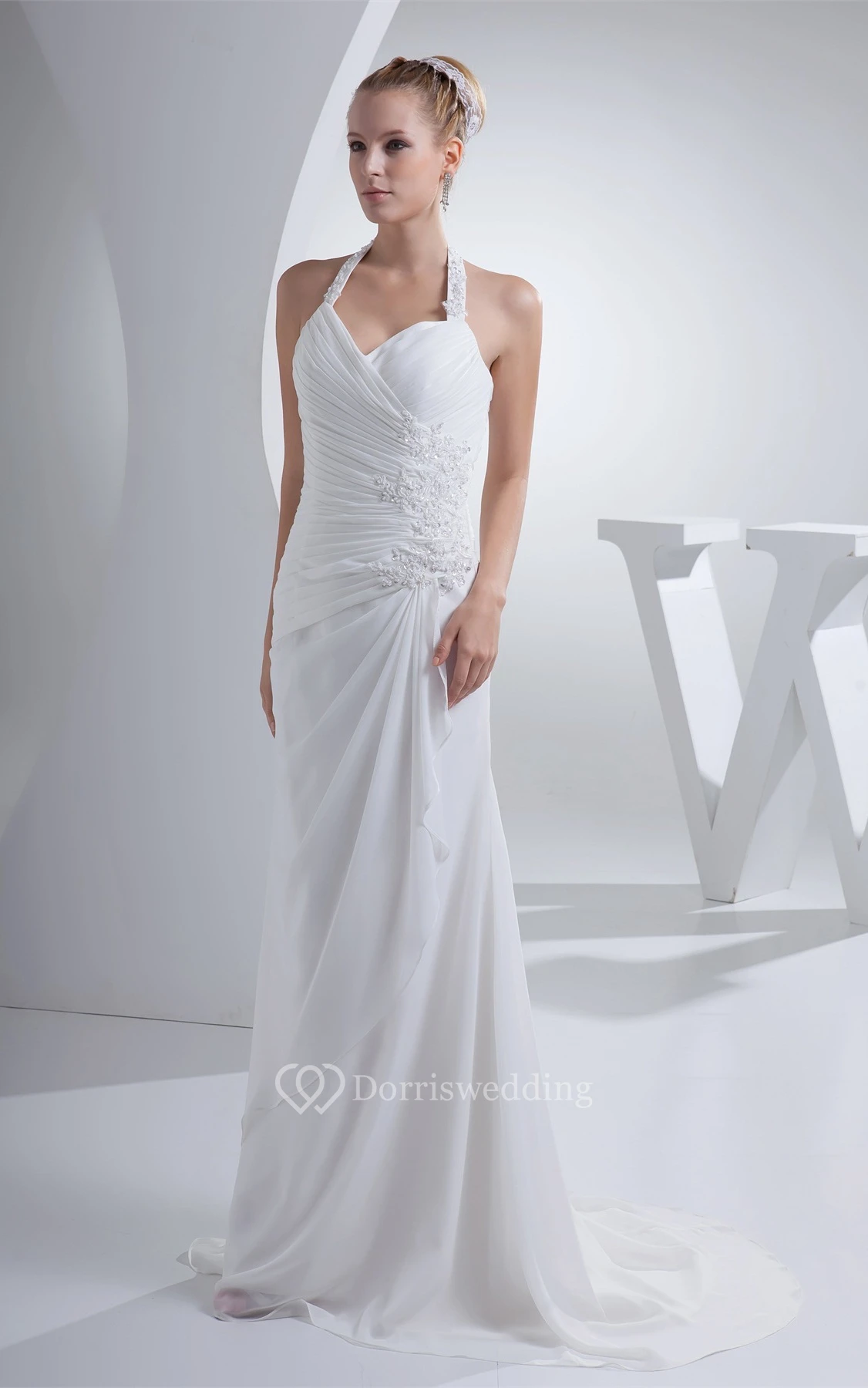 Chiffon Appliqued Floor-Length Ruched Dress With Jeweled Halter