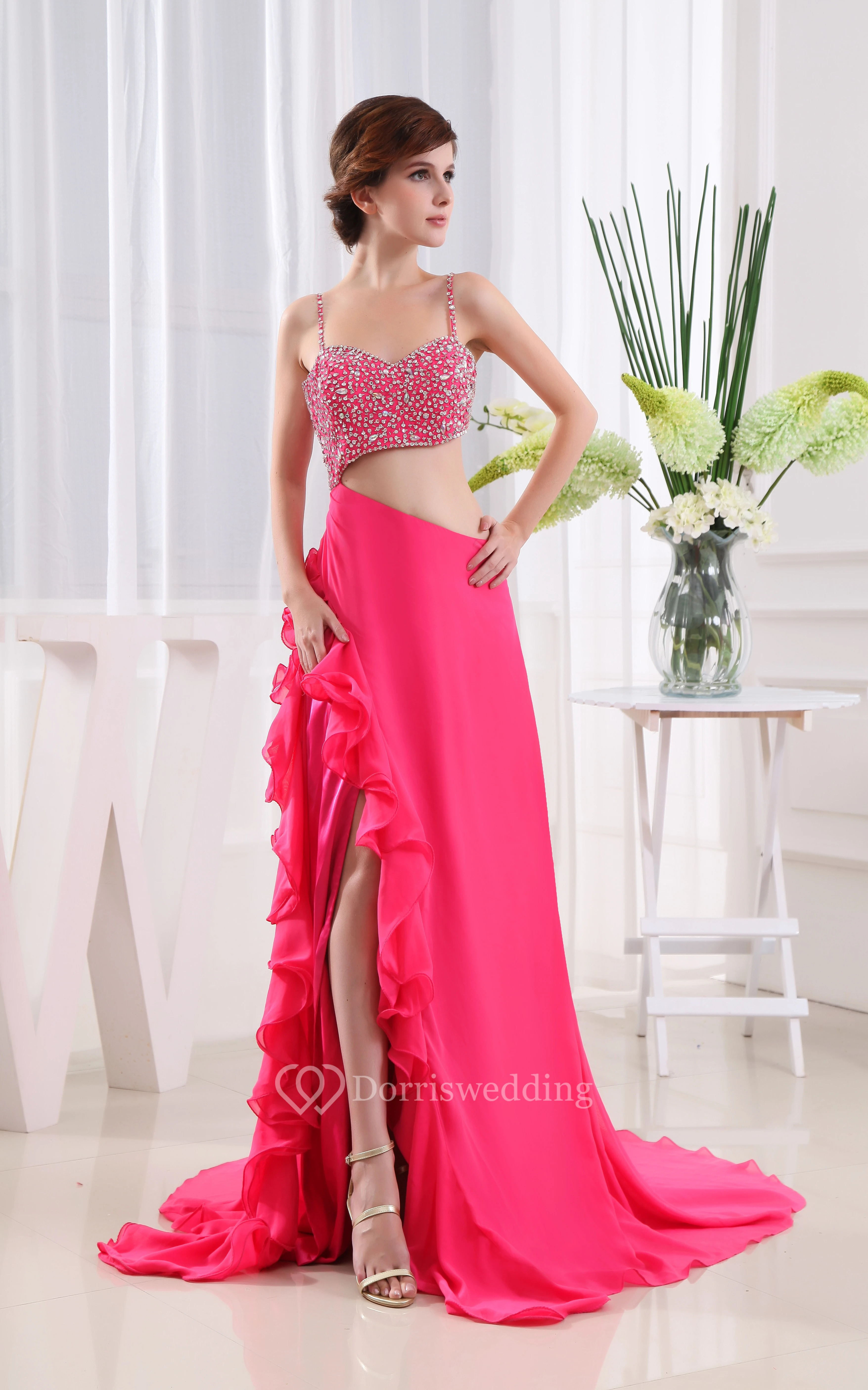 Chiffon Beaded Spaghetti-Strap Dress With Ruffles and Sweep Train
