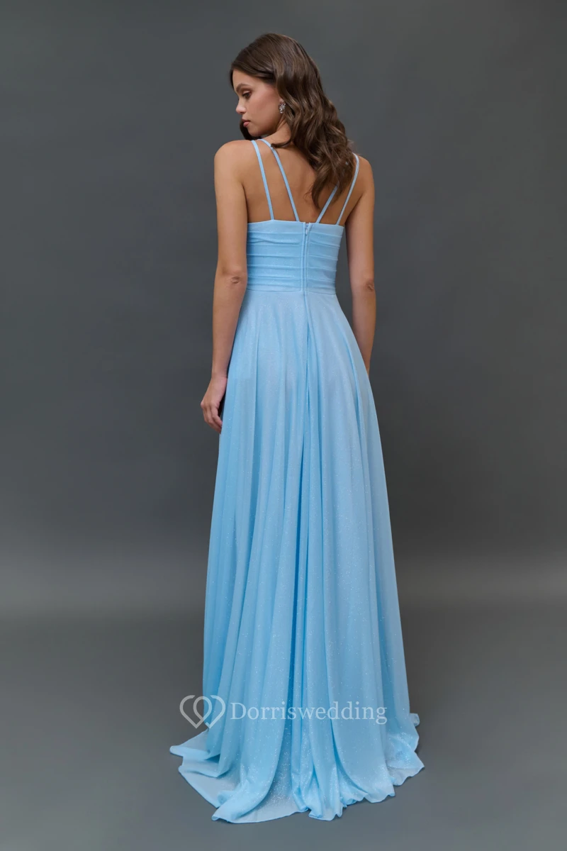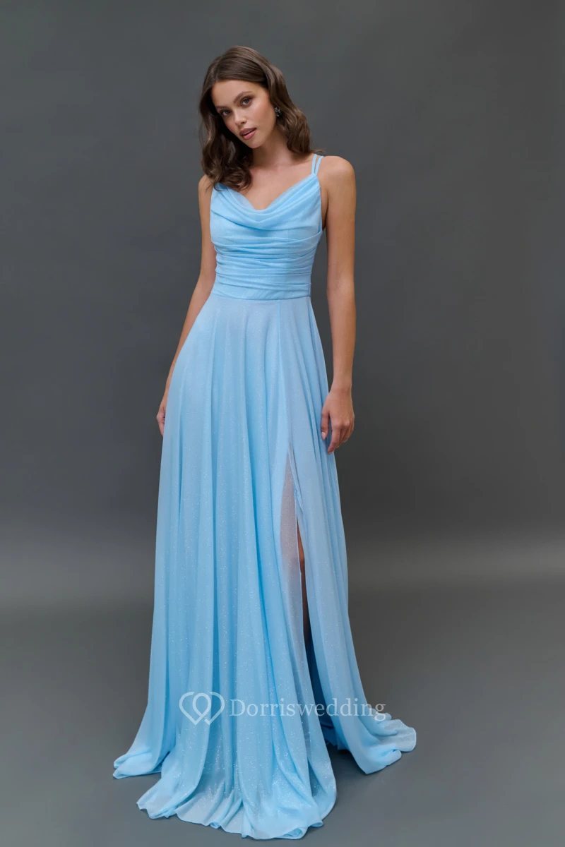 Chiffon Blue Spaghetti Cowl-neck Floor-length Dress