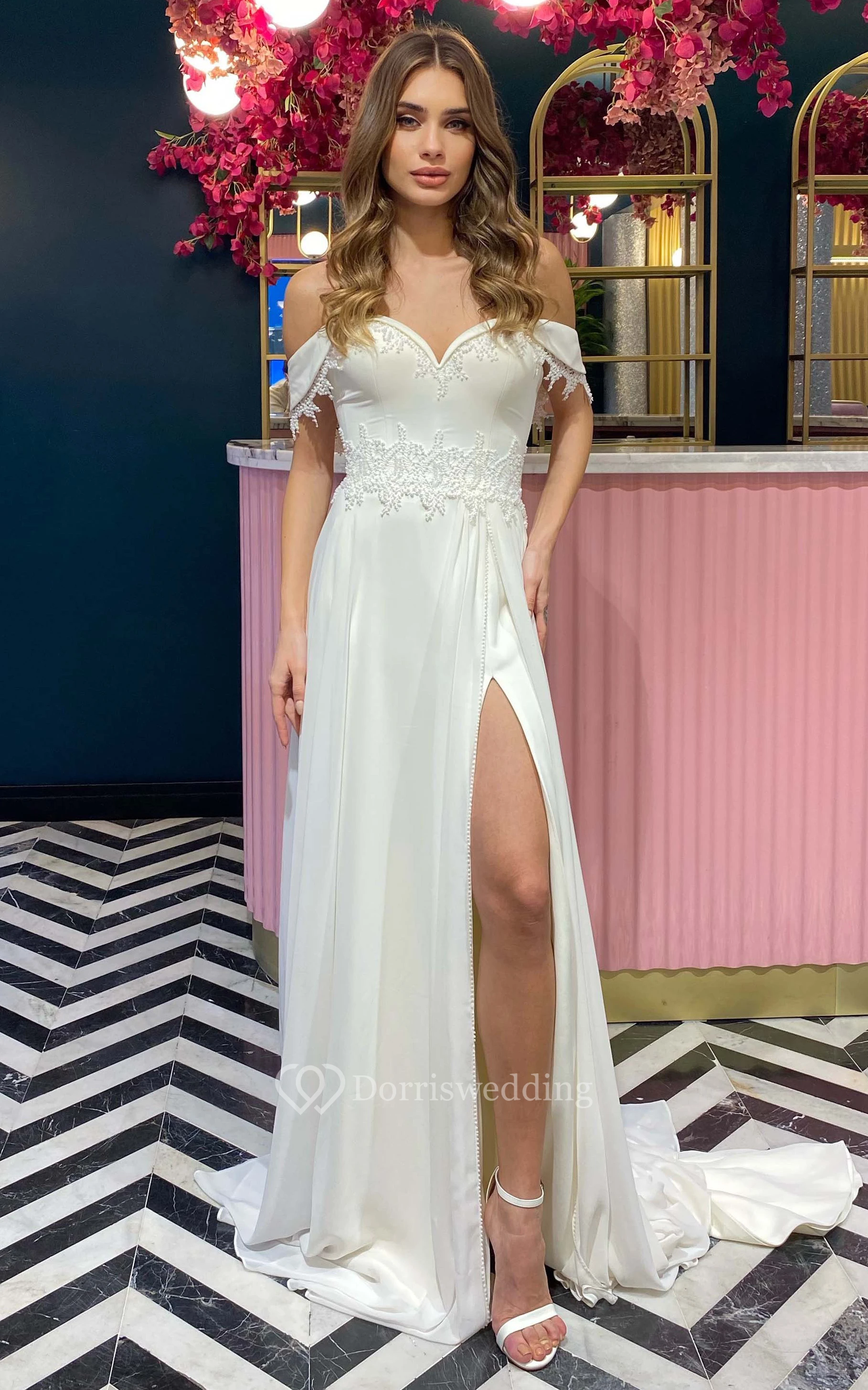 Chiffon Chapel Train Sheath Sleeveless Luxury Wedding Dress with Split Front