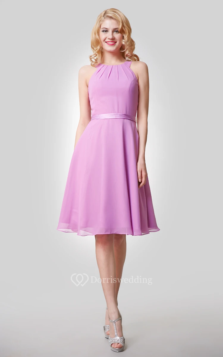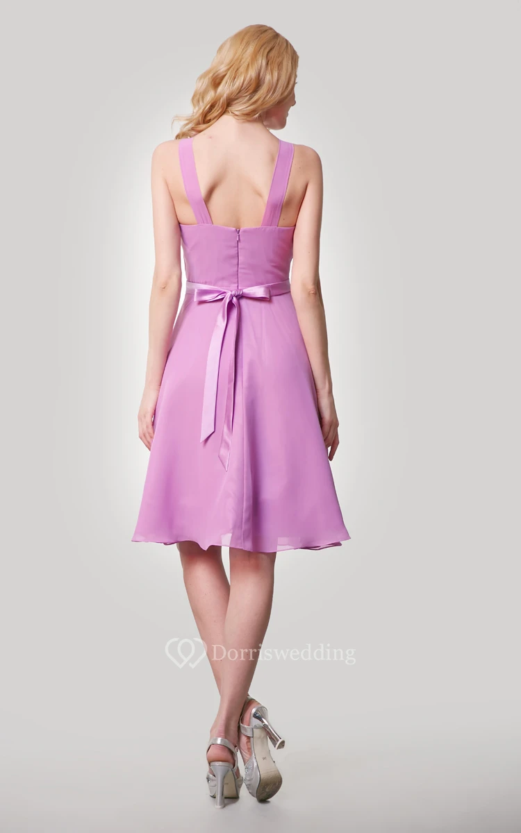 Chiffon Knee Length A-Line Dress With Straps and Satin Bow Sash