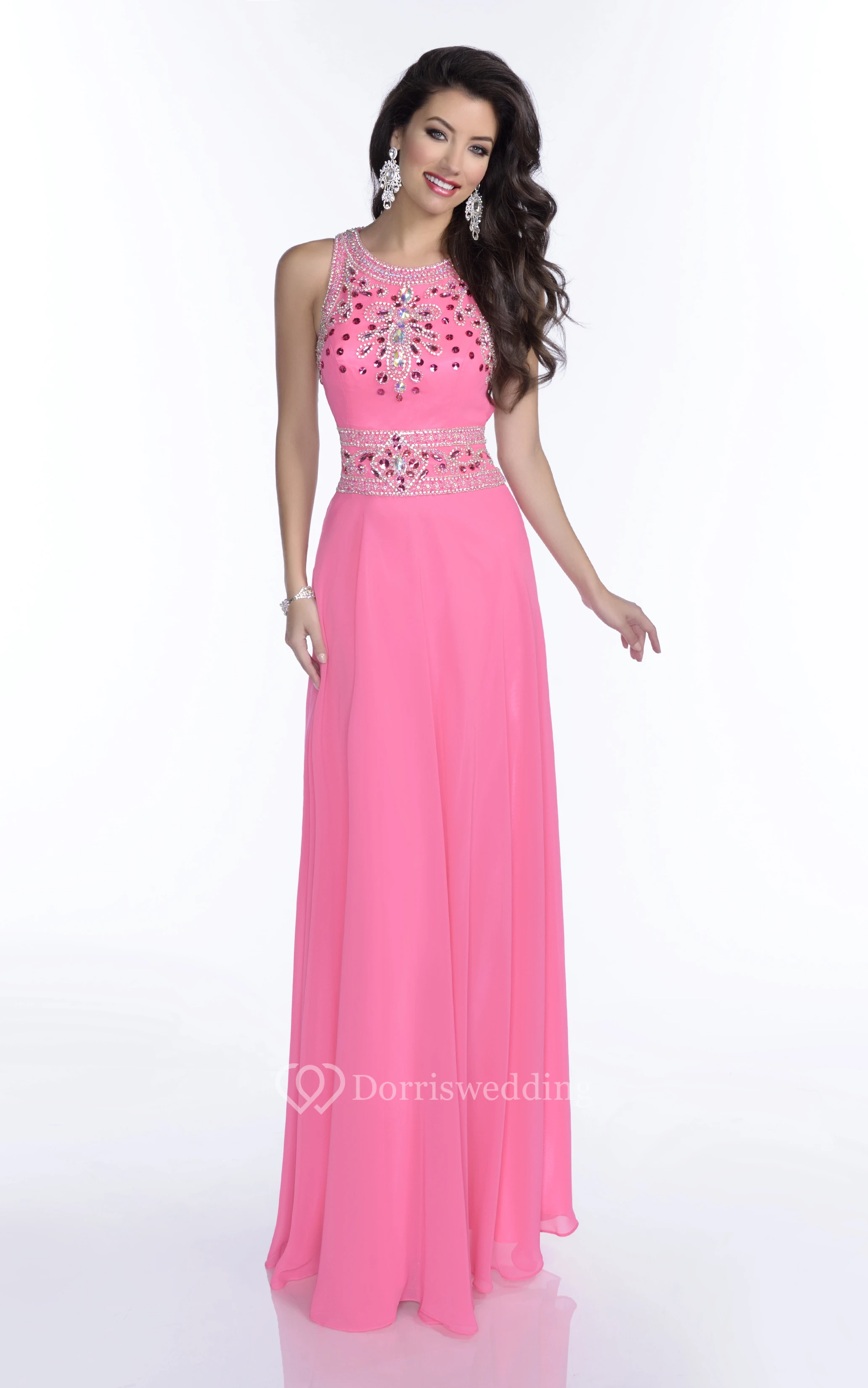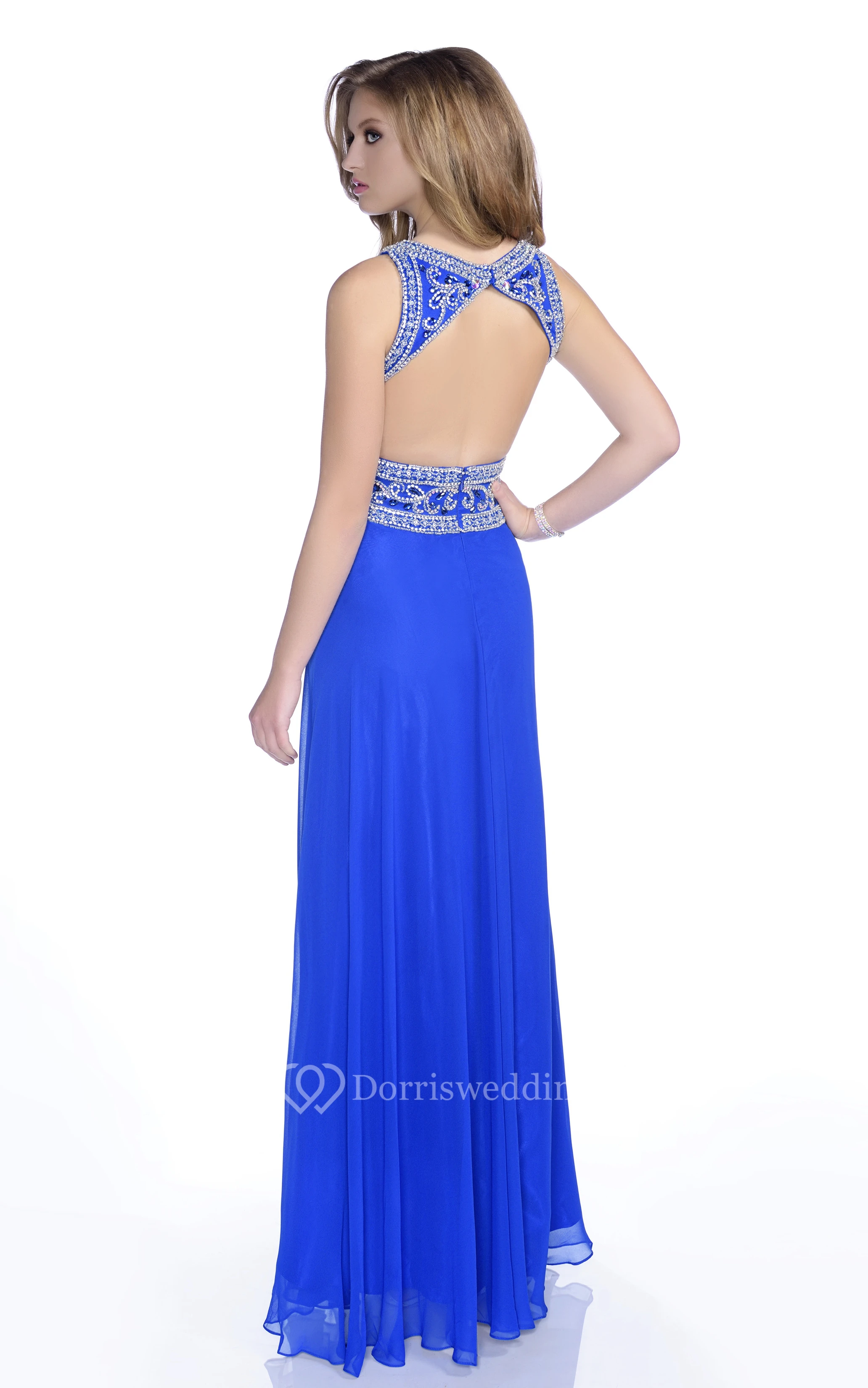 Chiffon Sleeveless Sheath Jeweled Neck Prom Dress With Keyhole Back