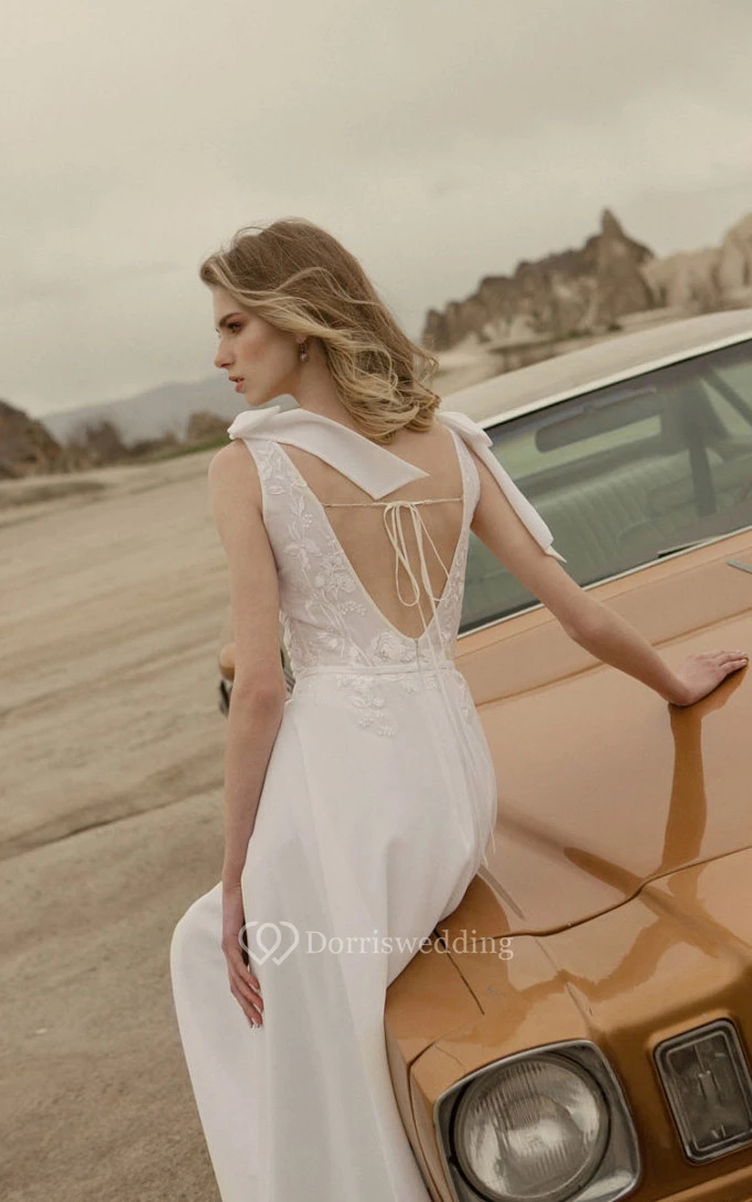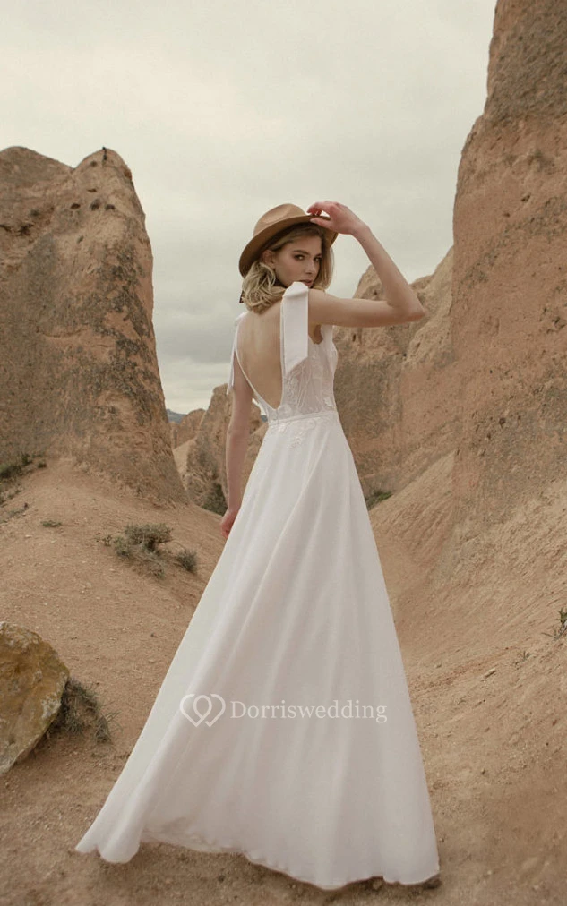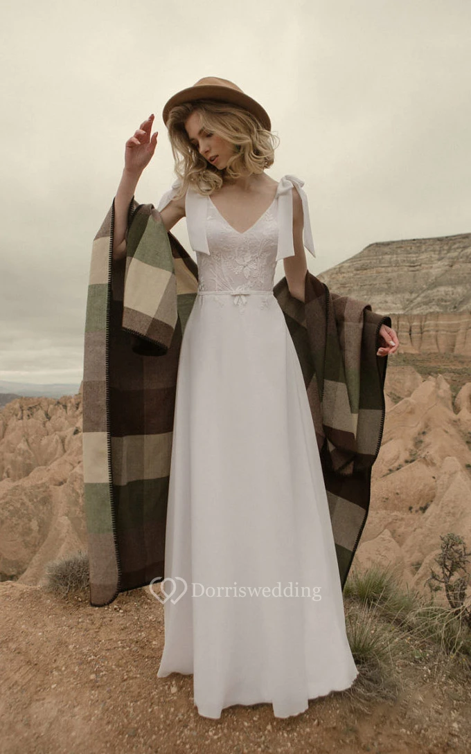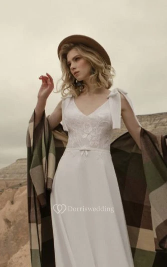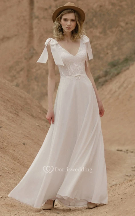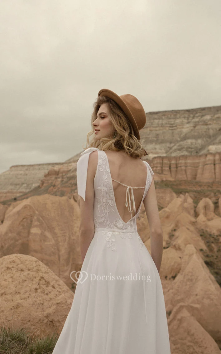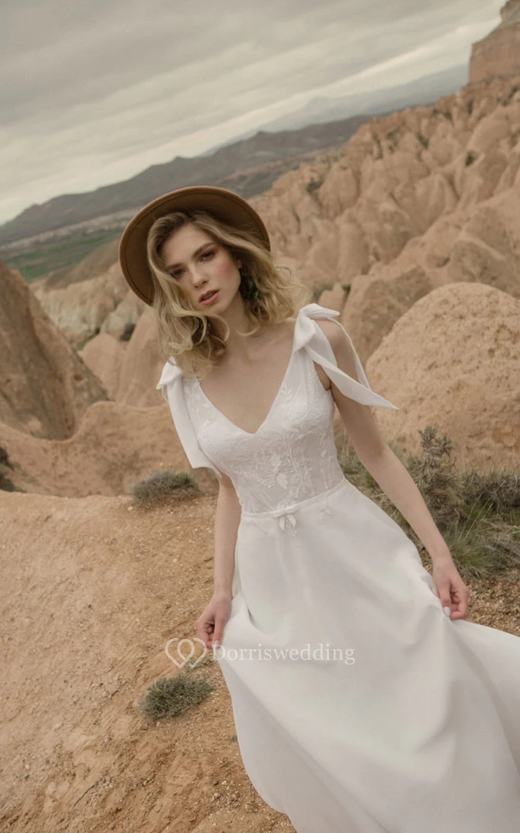Chiffon Summer Empire Flowy Applique Wedding Dress with Epaulet Bow