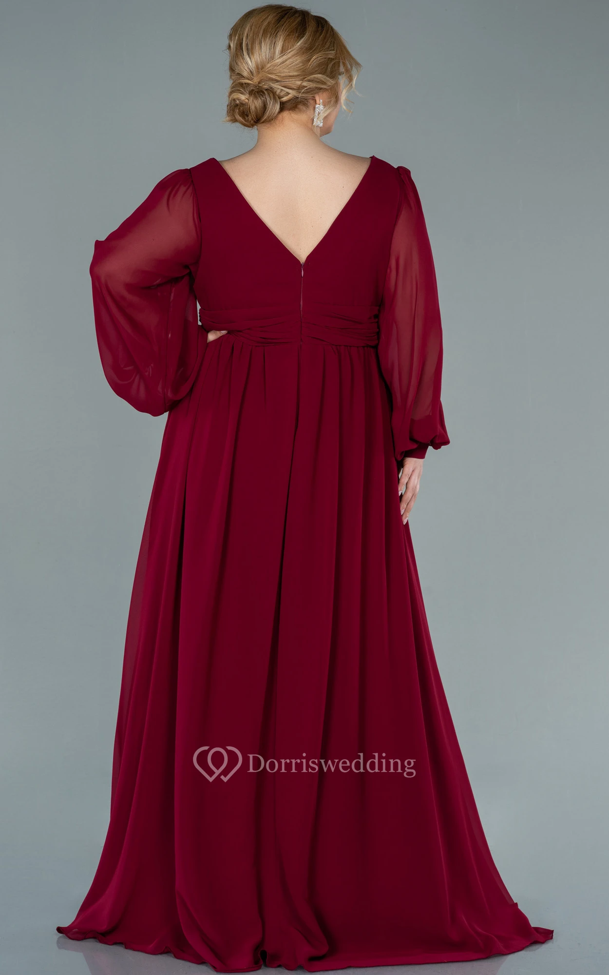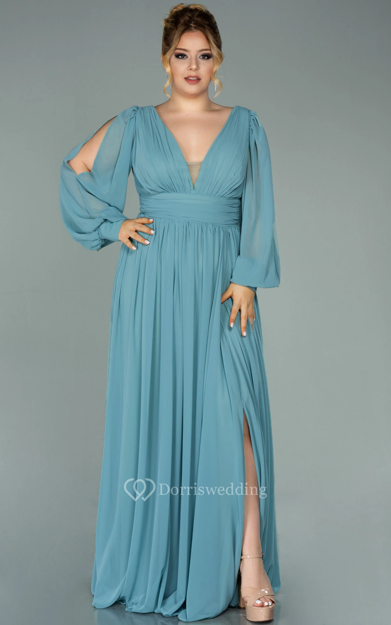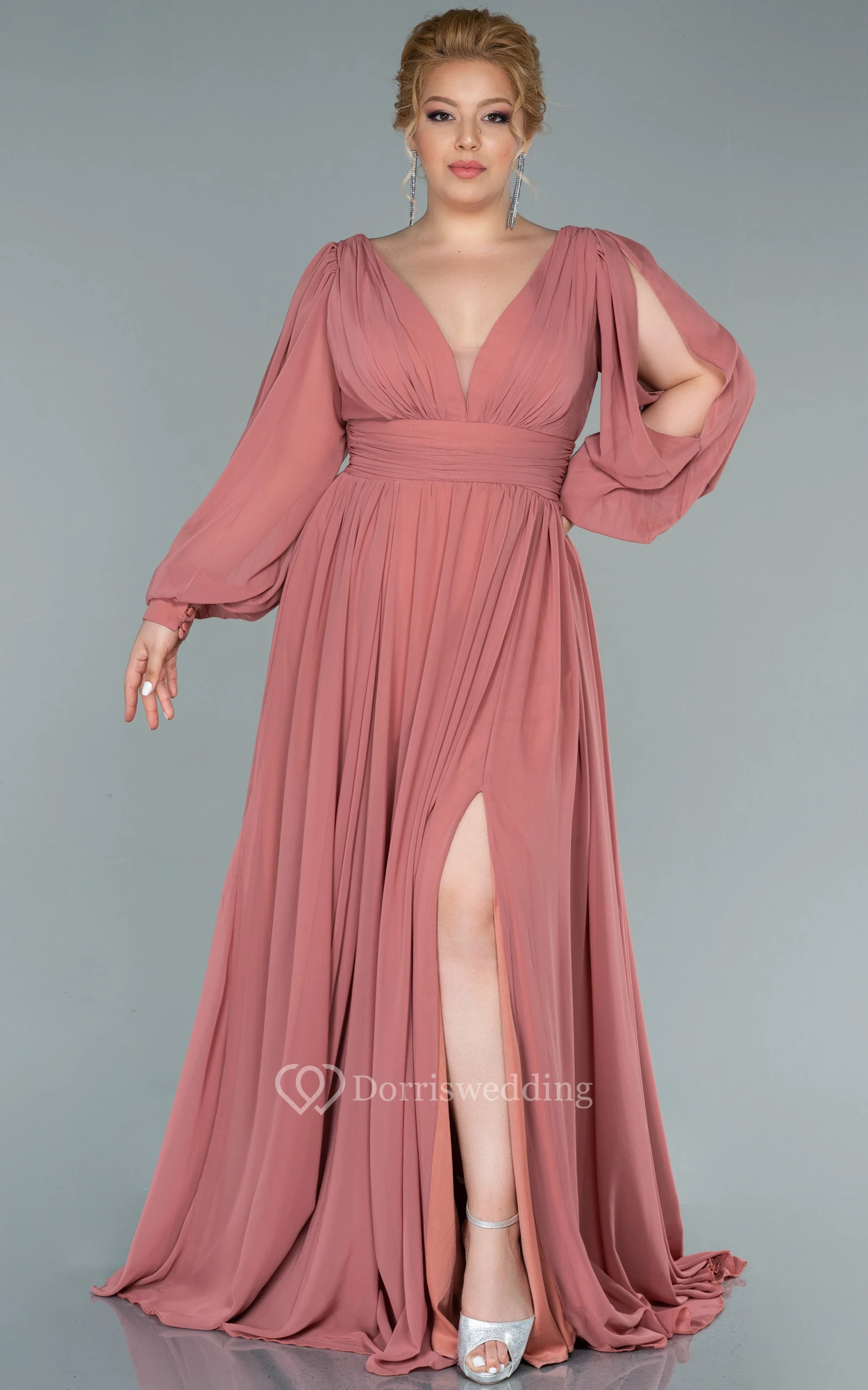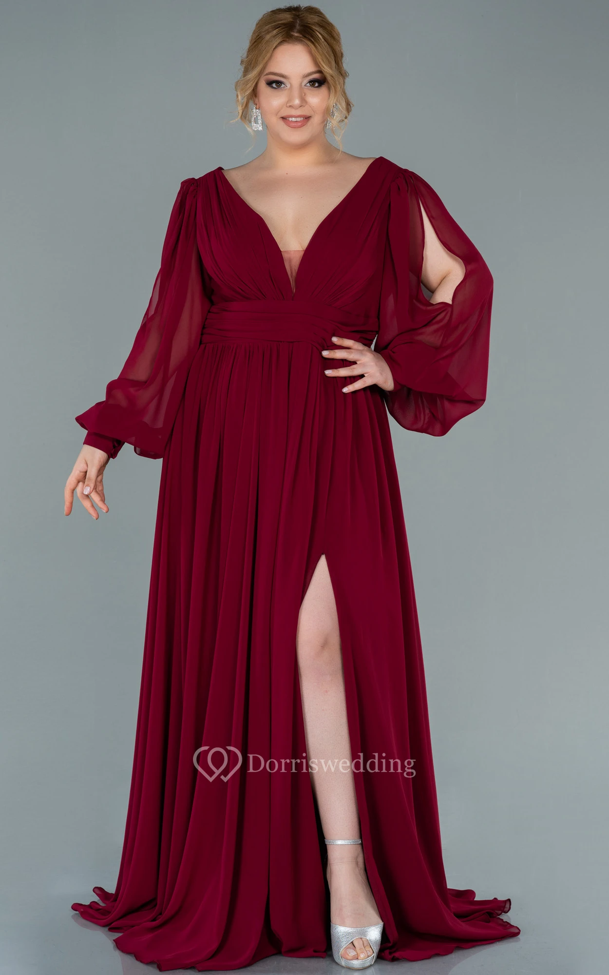 Chiffon V-neck Long Sleeve Front Split Pleated Evening Plus Size Dress