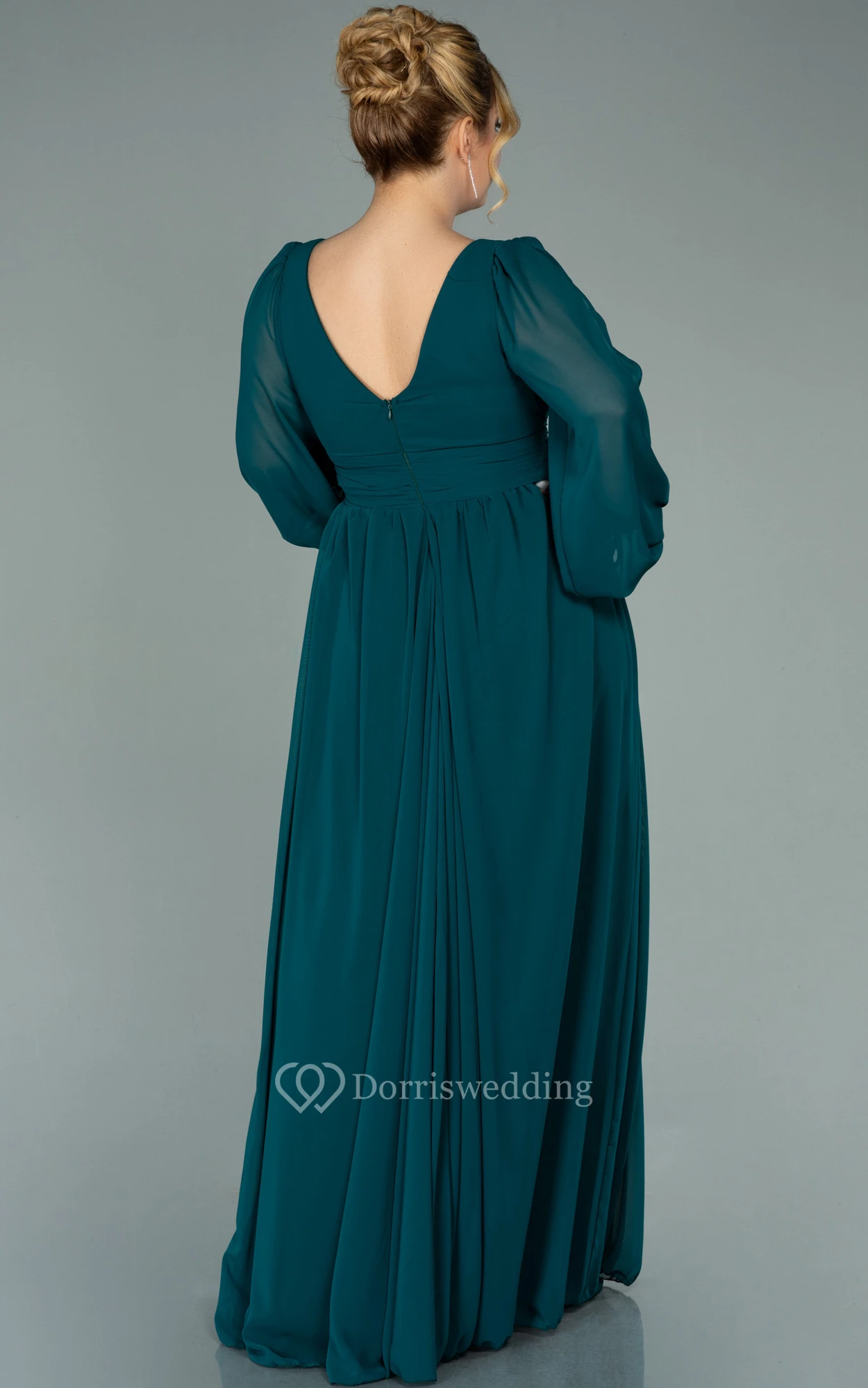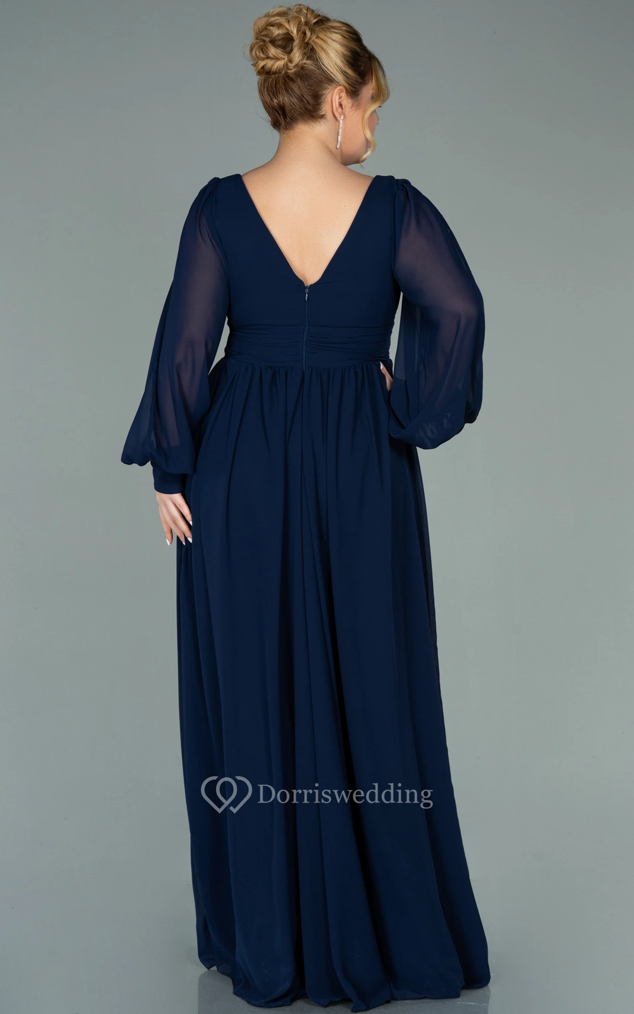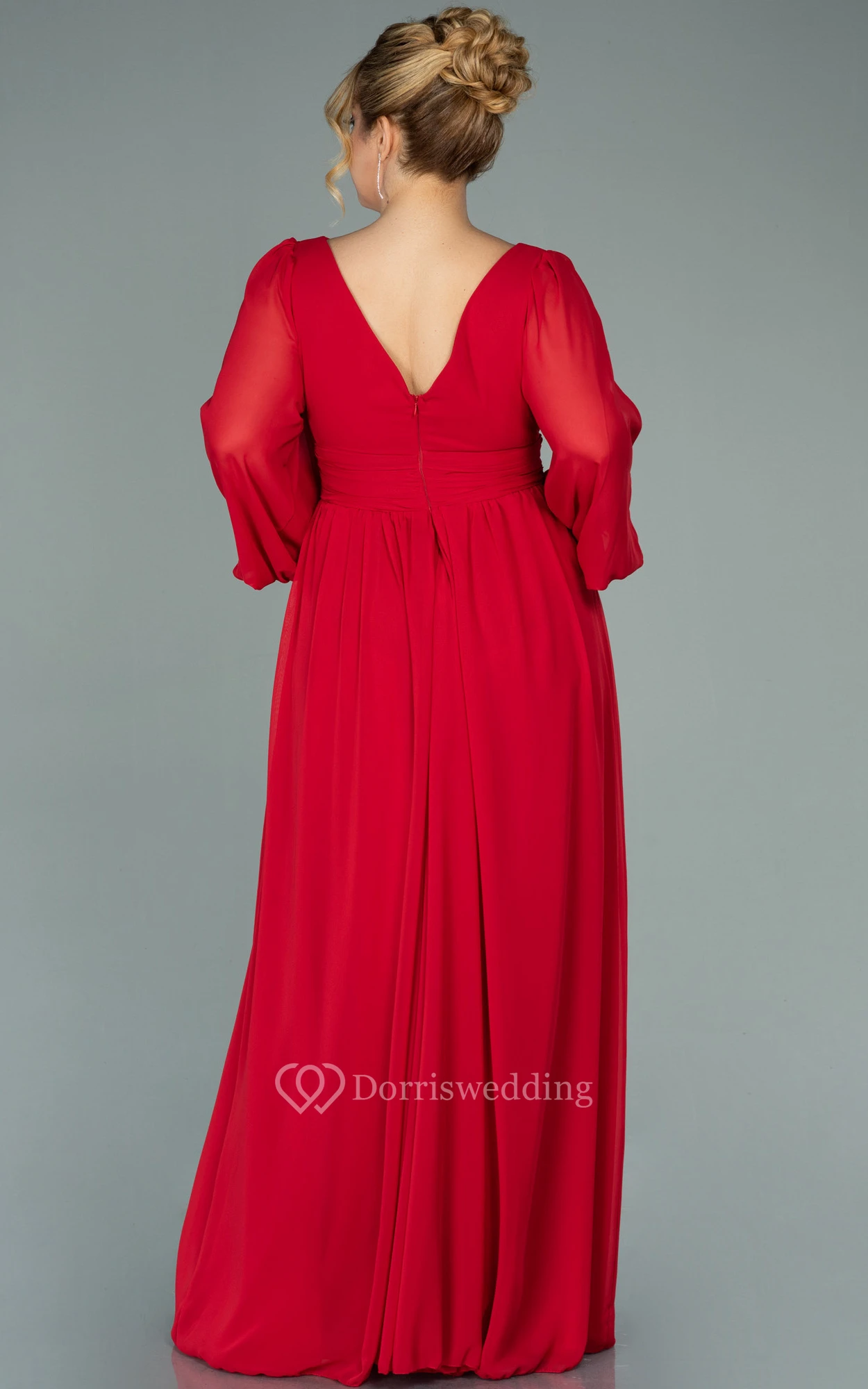 Chiffon V-neck Long Sleeve Front Split Pleated Evening Plus Size Dress