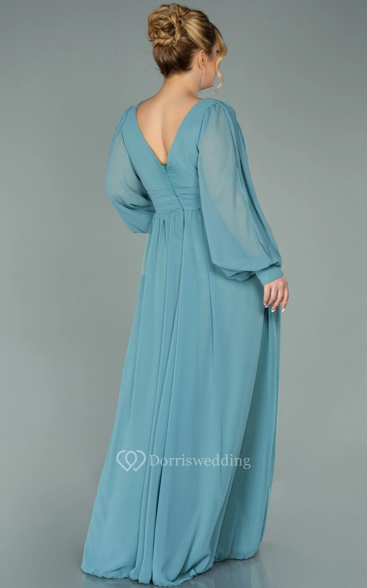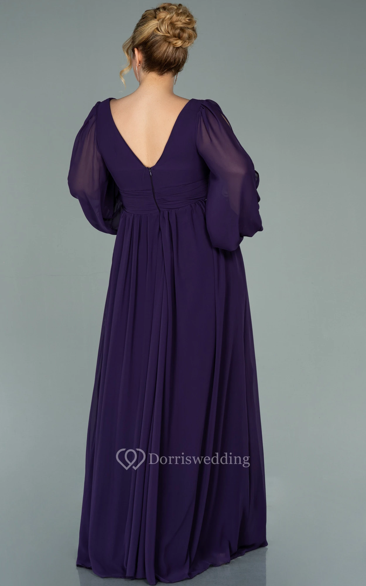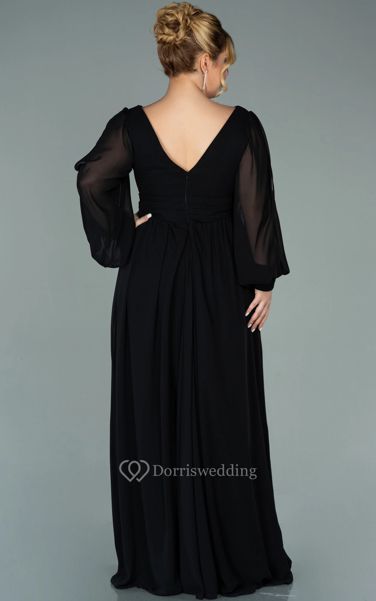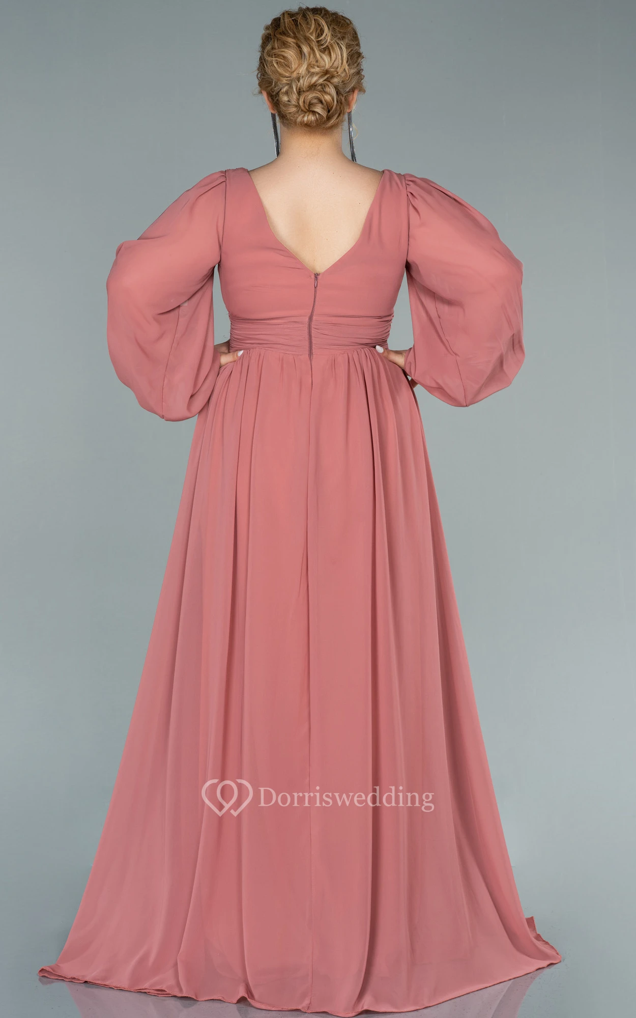 Chiffon V-neck Long Sleeve Front Split Pleated Evening Plus Size Dress