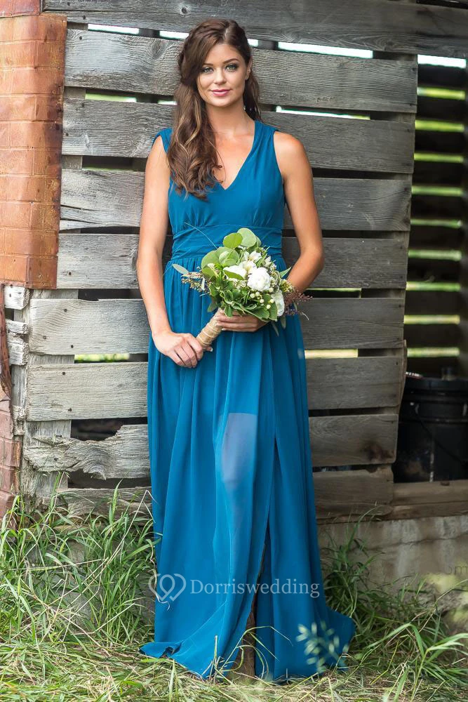 Chiffon V-neck Sleeveless Bridesmaid Dress with Front Slit