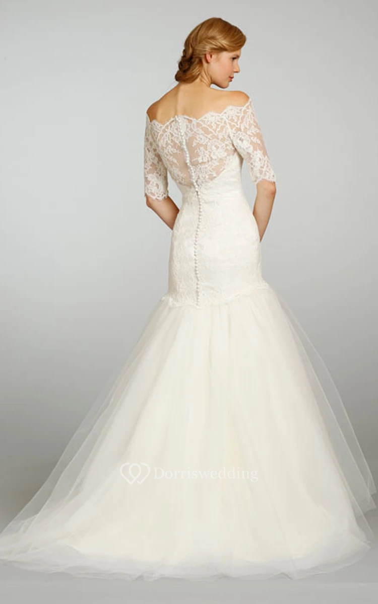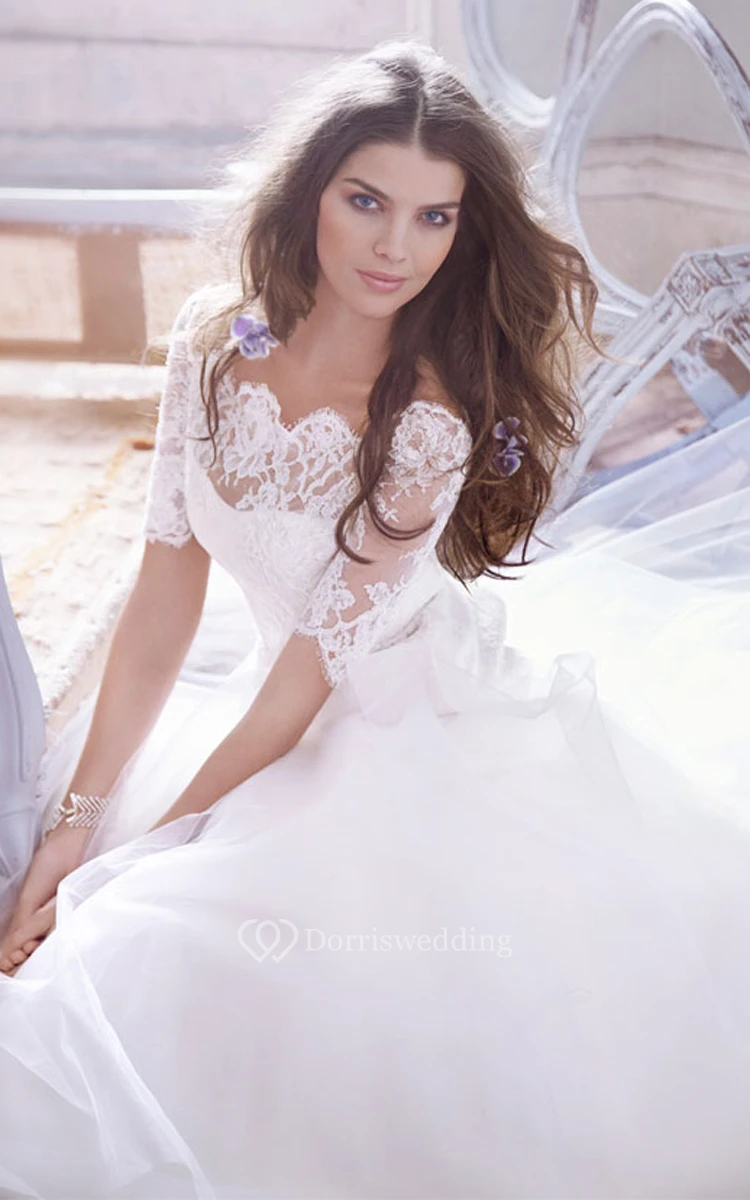 Classic Off the Shoulder Tulle Ball Bridal Gown With 3-4 Lace Sleeve