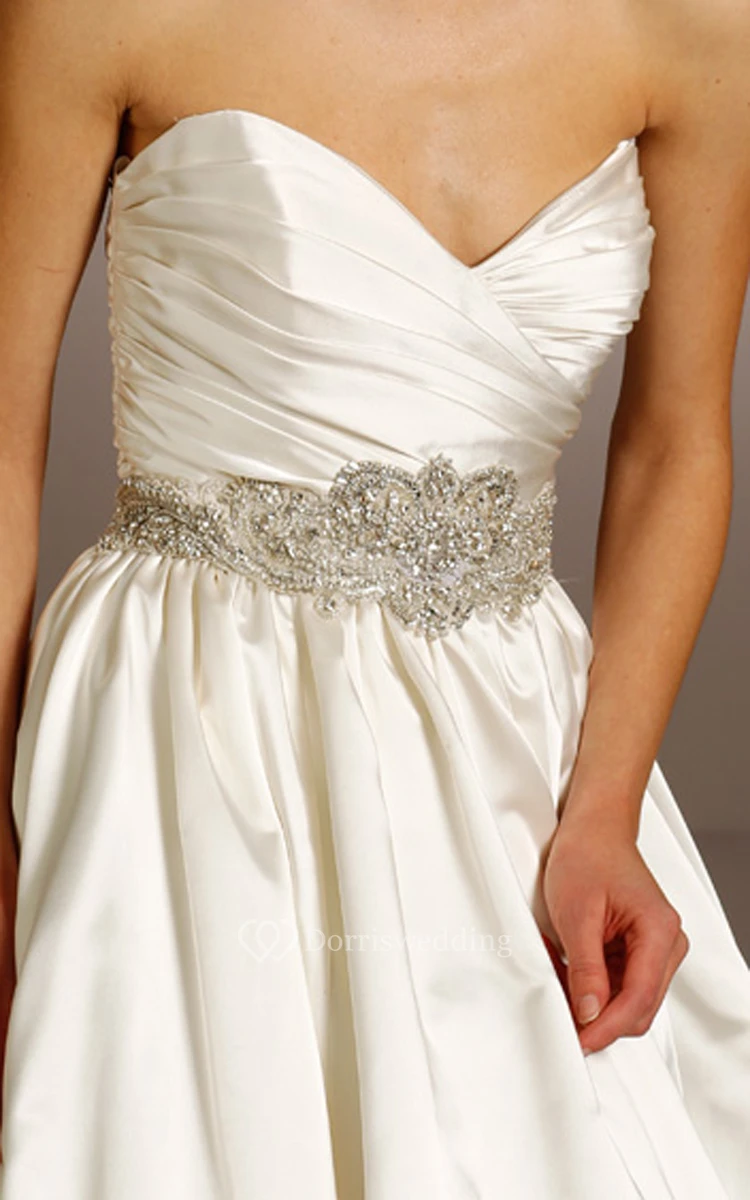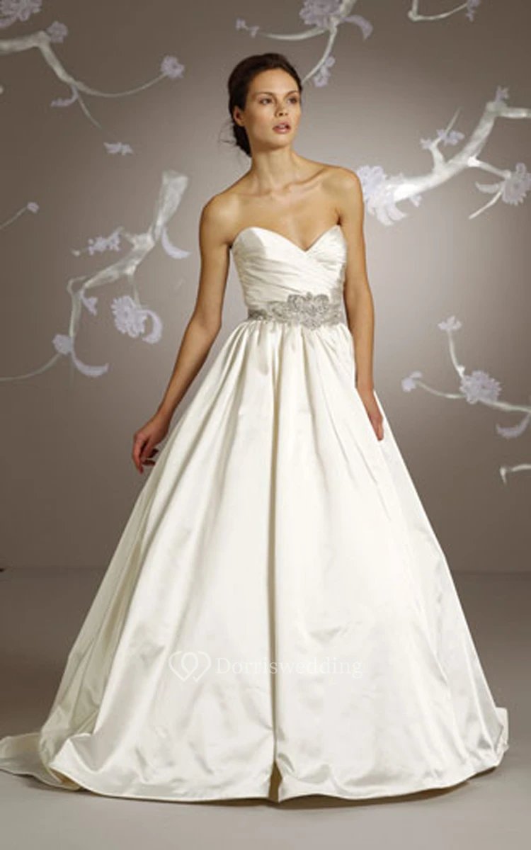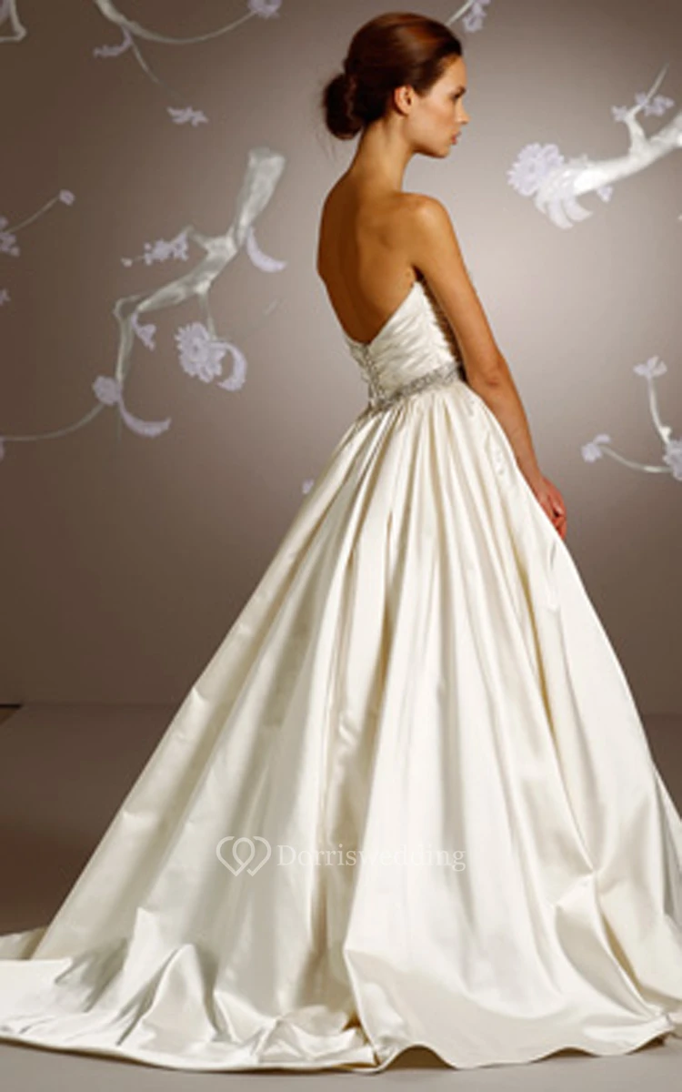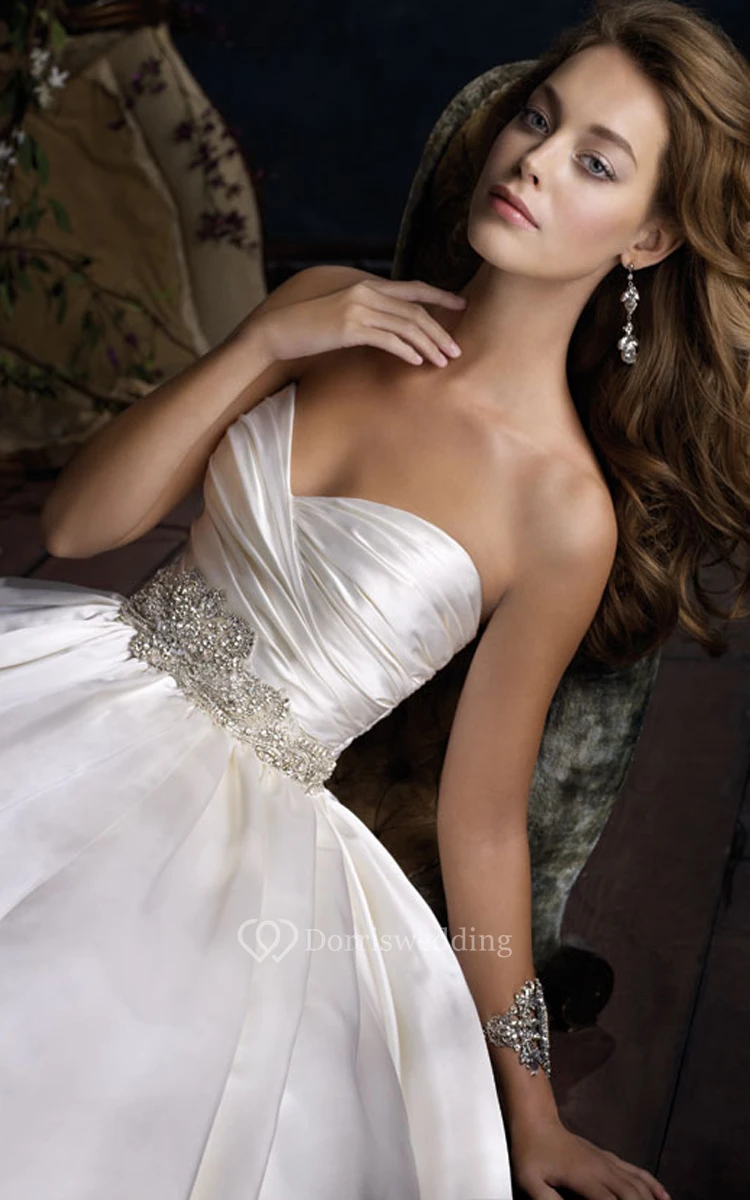 Classic Pleated Bodice Satin Ball Gown With Jewel Embellished Waist