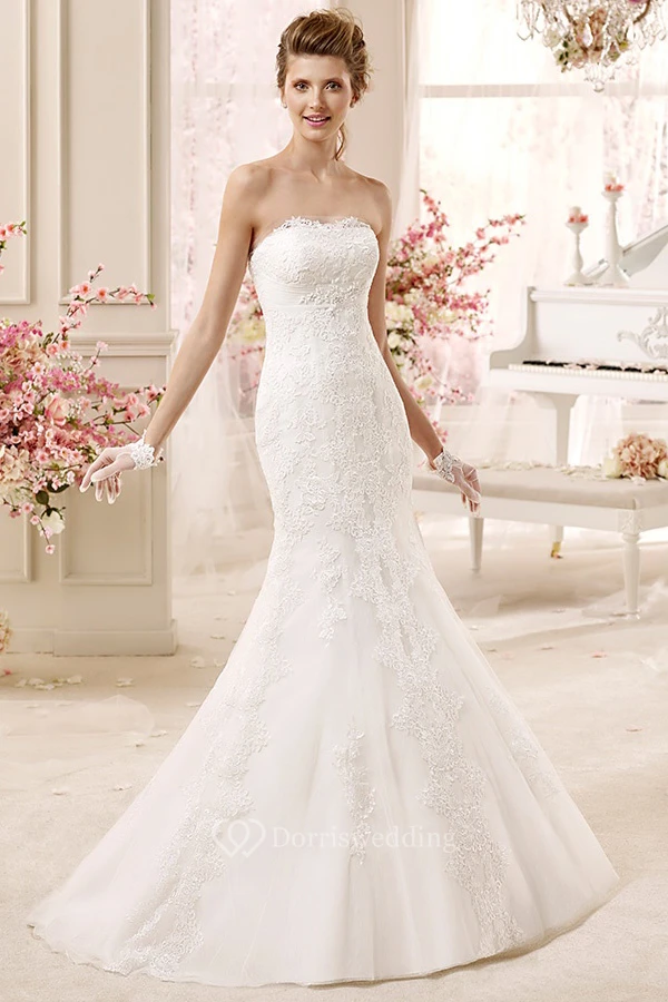 Classic Strapless Sheath Lace Gown With Appliques And Brush Train