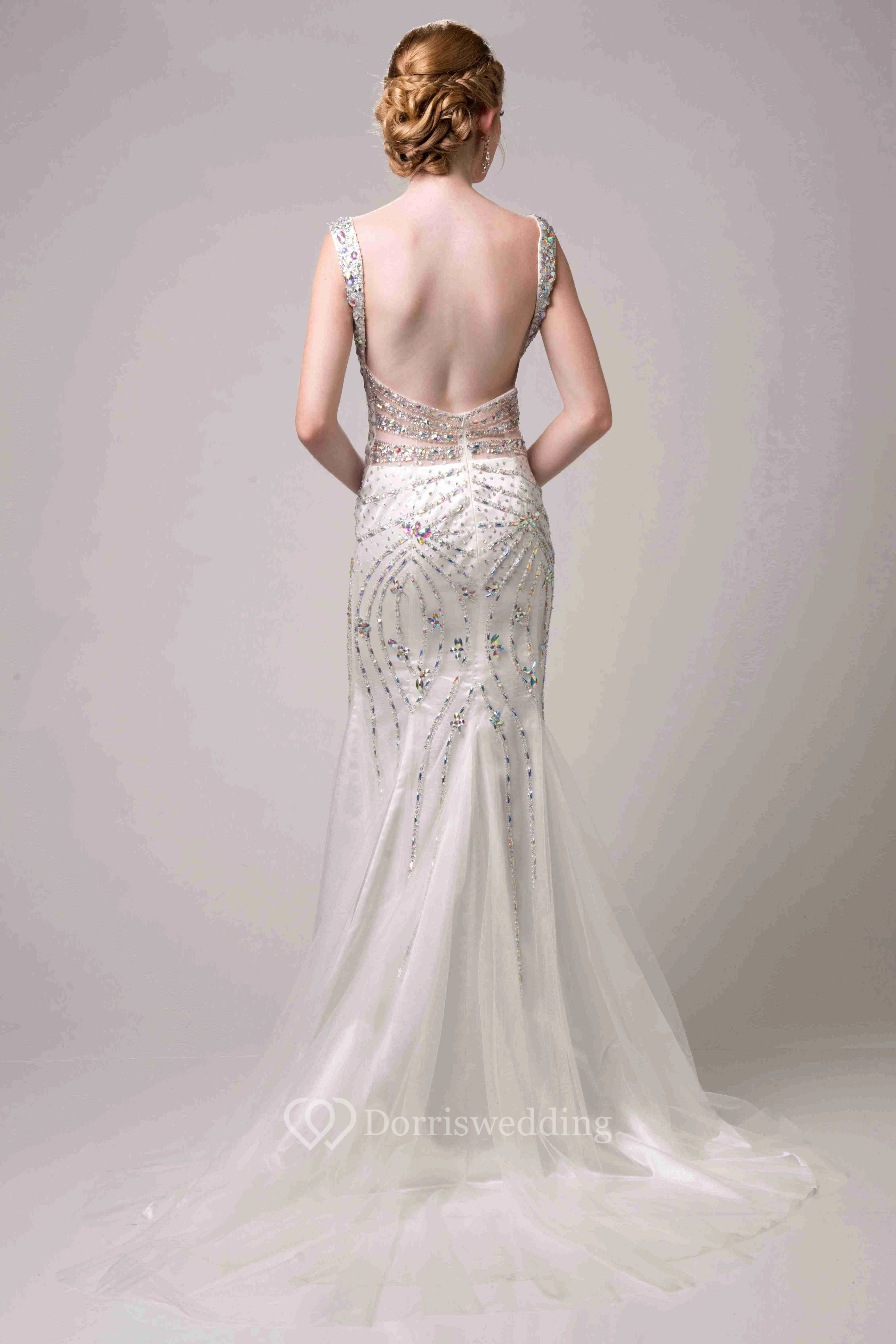 Column Side Slit Tulle Prom Dress With Polychrome Rhinestones