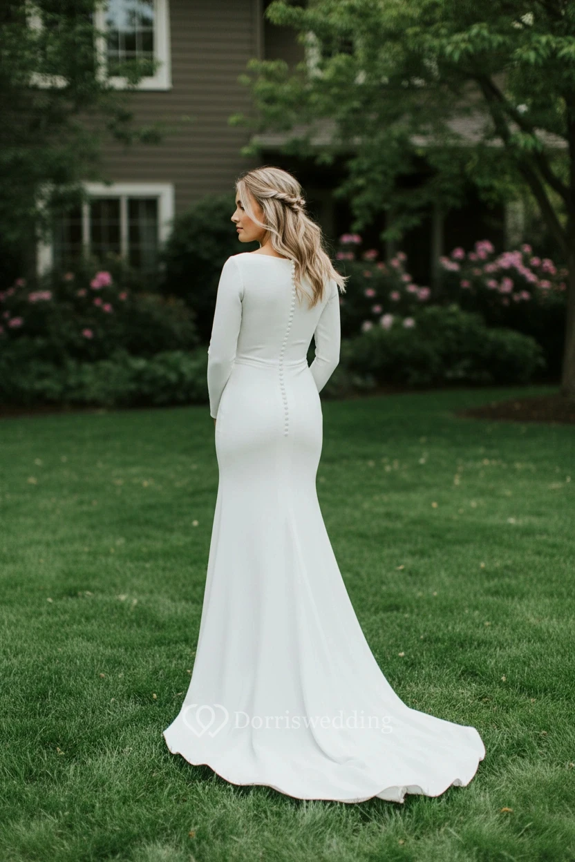 Finding a modest dress that still feels modern can be hard, but this one hits the mark. The sleeves are the perfect length and the neckline is very tasteful. I felt so confident and comfortable throughout the entire day. Highly recommend for anyone looking for a temple-ready gown!